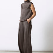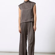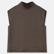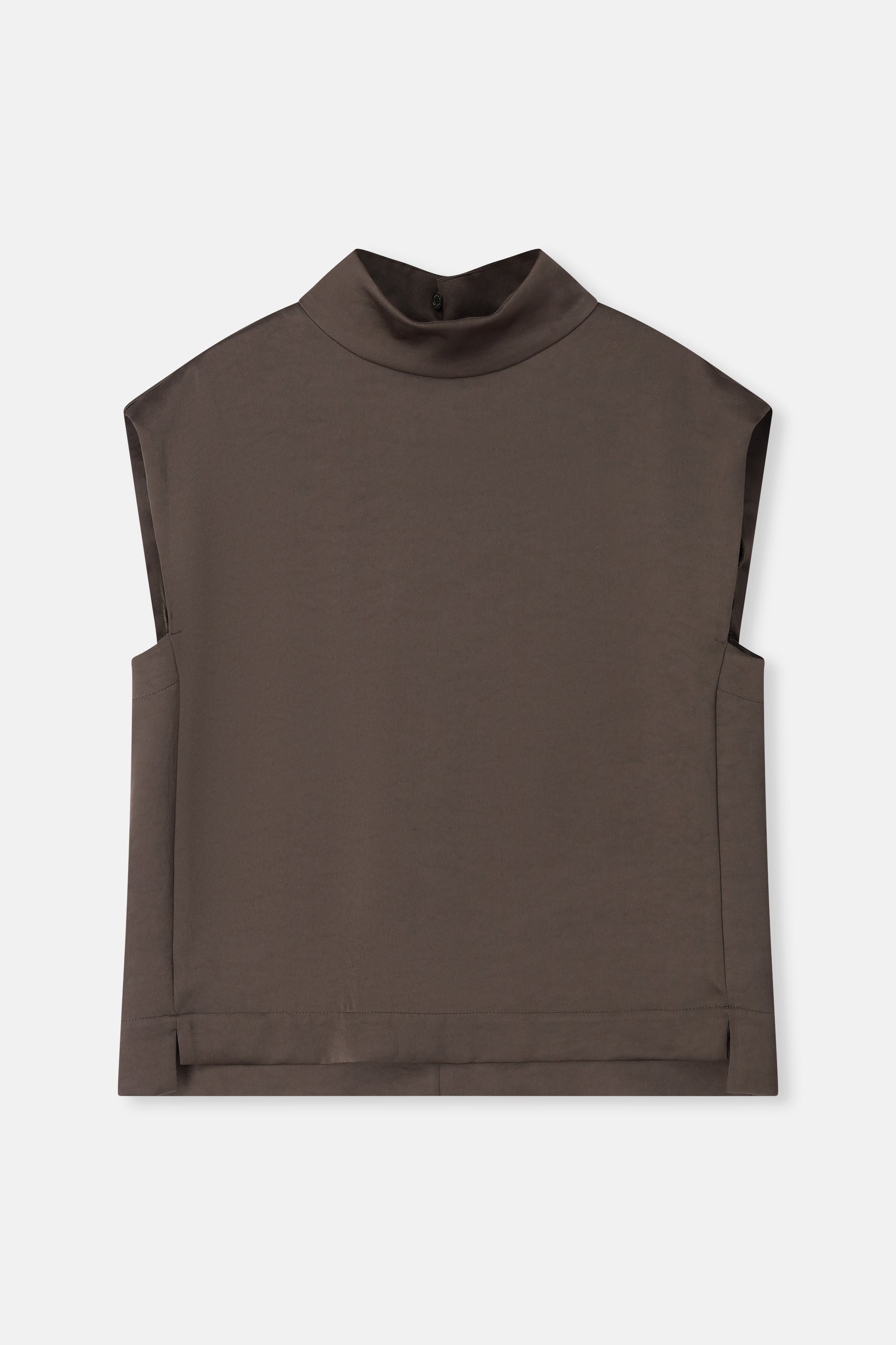 Soepele, mouwloze top in een verfijnde satijn-viscose kwaliteit. De opstaande kraag en zachte kapmouw geven dit minimalistische silhouet een moderne, vrouwelijke uitstraling. Elegant solo gedragen, perfect onder een vest of blazer.