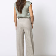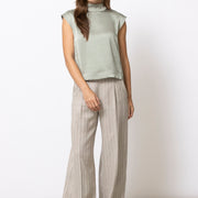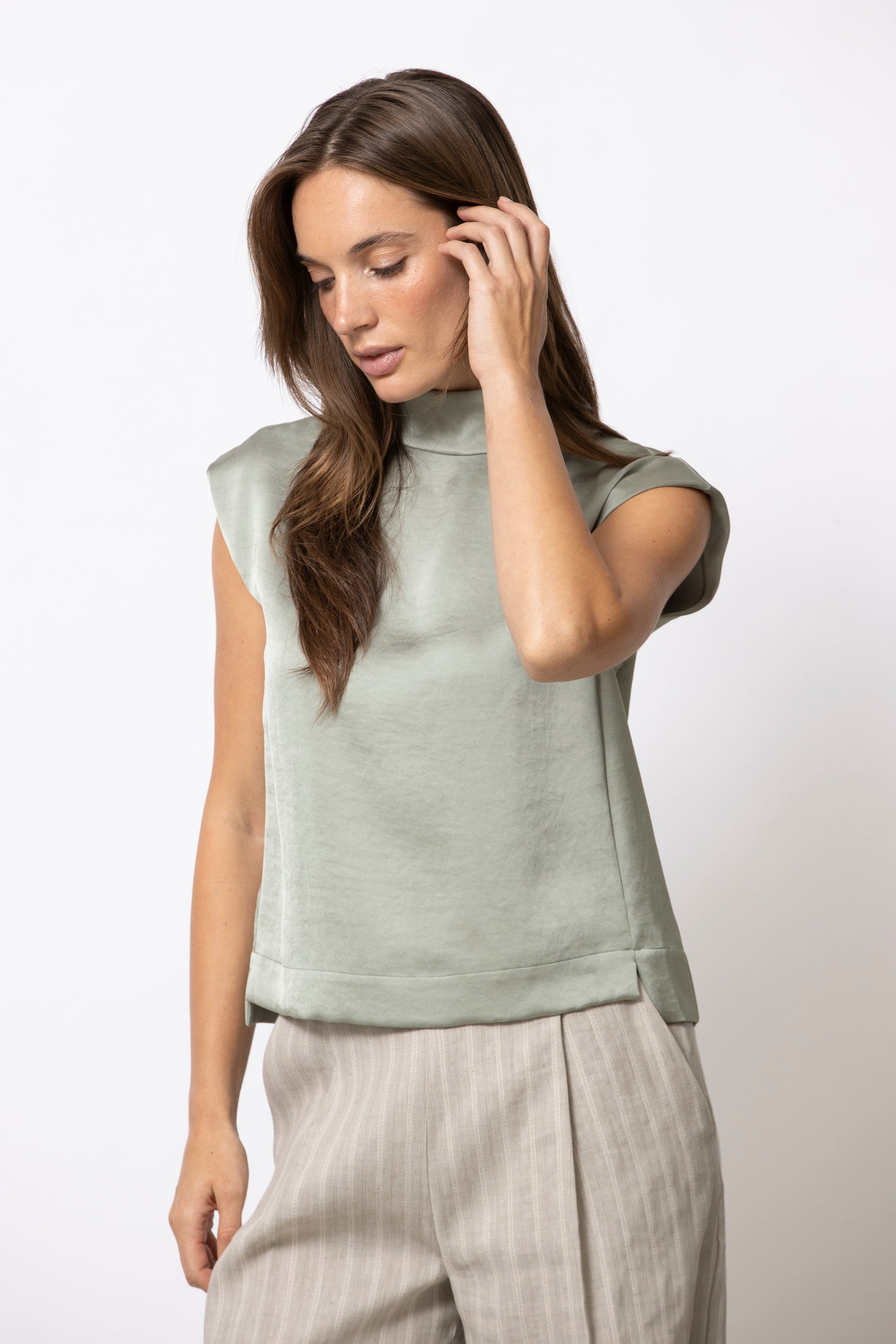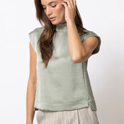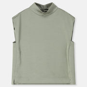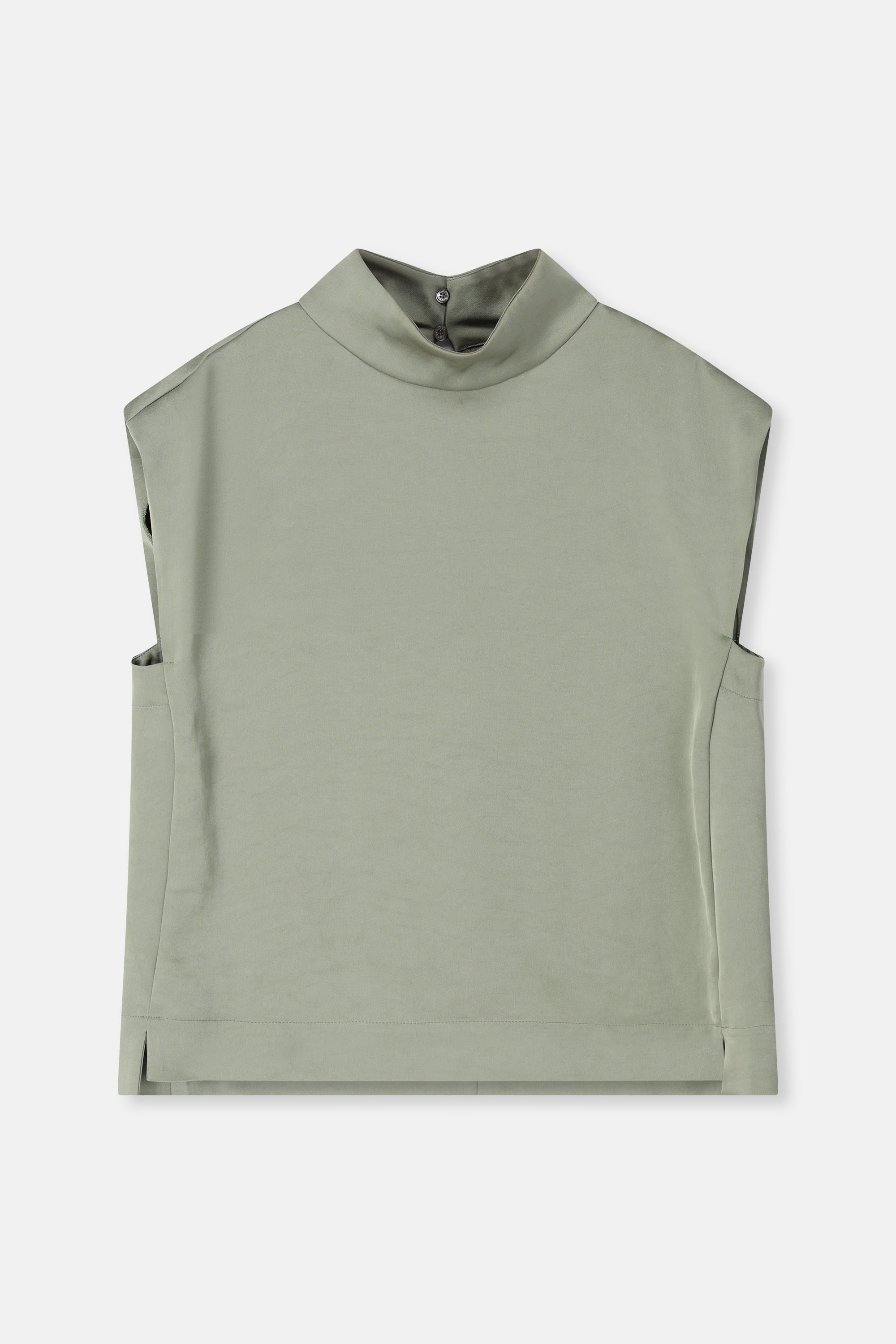 Soepele, mouwloze top in een verfijnde satijn-viscose kwaliteit. De opstaande kraag en zachte kapmouw geven dit minimalistische silhouet een moderne, vrouwelijke uitstraling. Elegant solo gedragen, perfect onder een vest of blazer.
