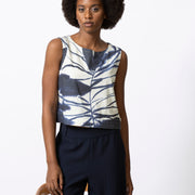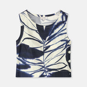 Korte, mouwloze top met grafische navy-witte print. De knoopsluiting opzij geeft dit stuk een subtiel accent. Mooi in combinatie met een hoge taille broek of rok.