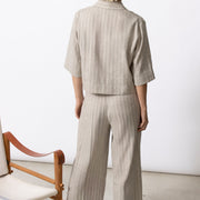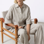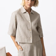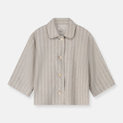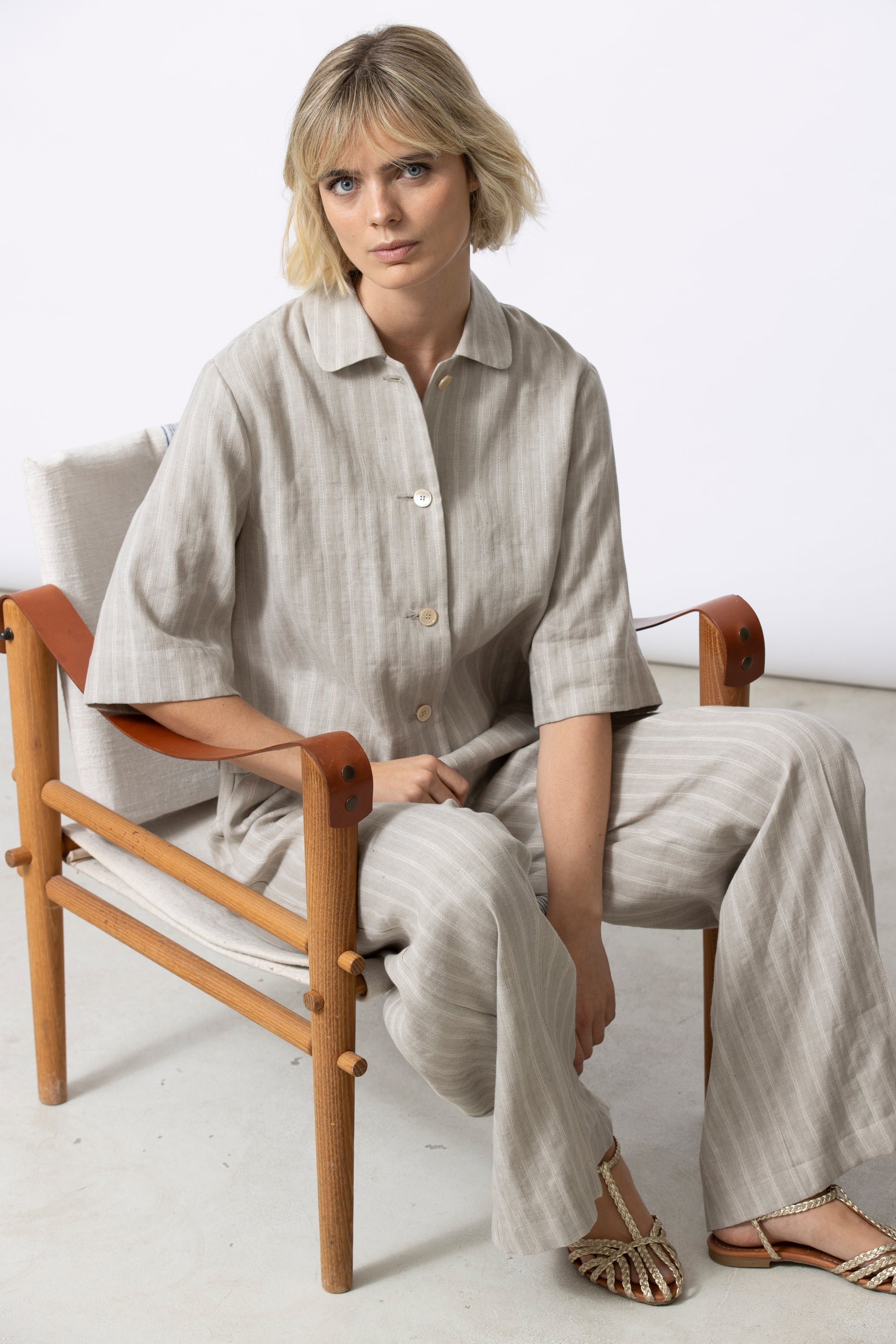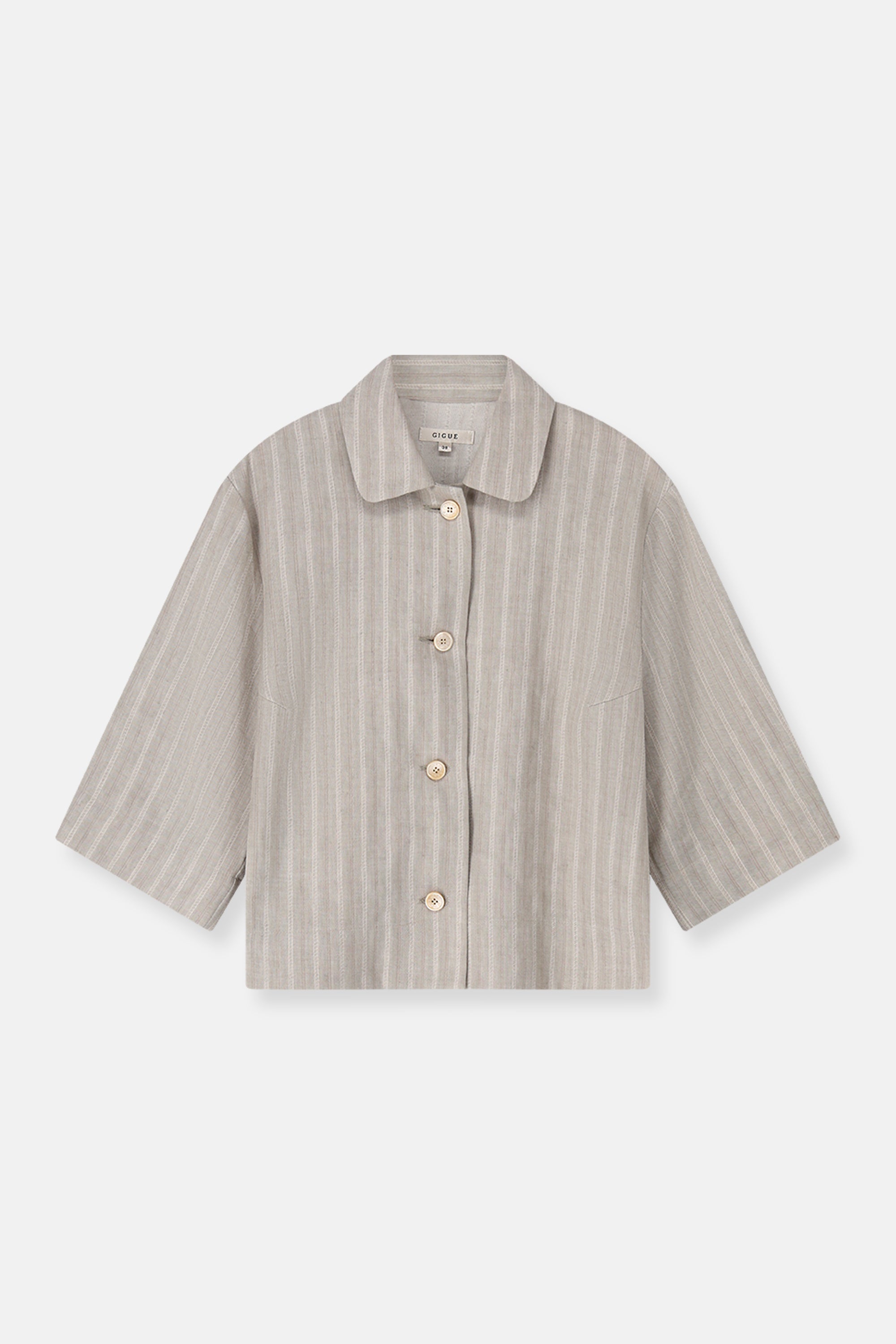 Luchtige bloes in een verfijnde katoen-linnenblend, uitgevoerd in een zachte licht kaki beige tint. Het rechte, korte silhouet oogt modern en rustig. Draag haar gesloten als bloes of open als licht vestje, perfect in combinatie met de bijpassende broek in dezelfde stof.