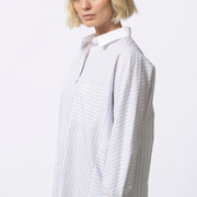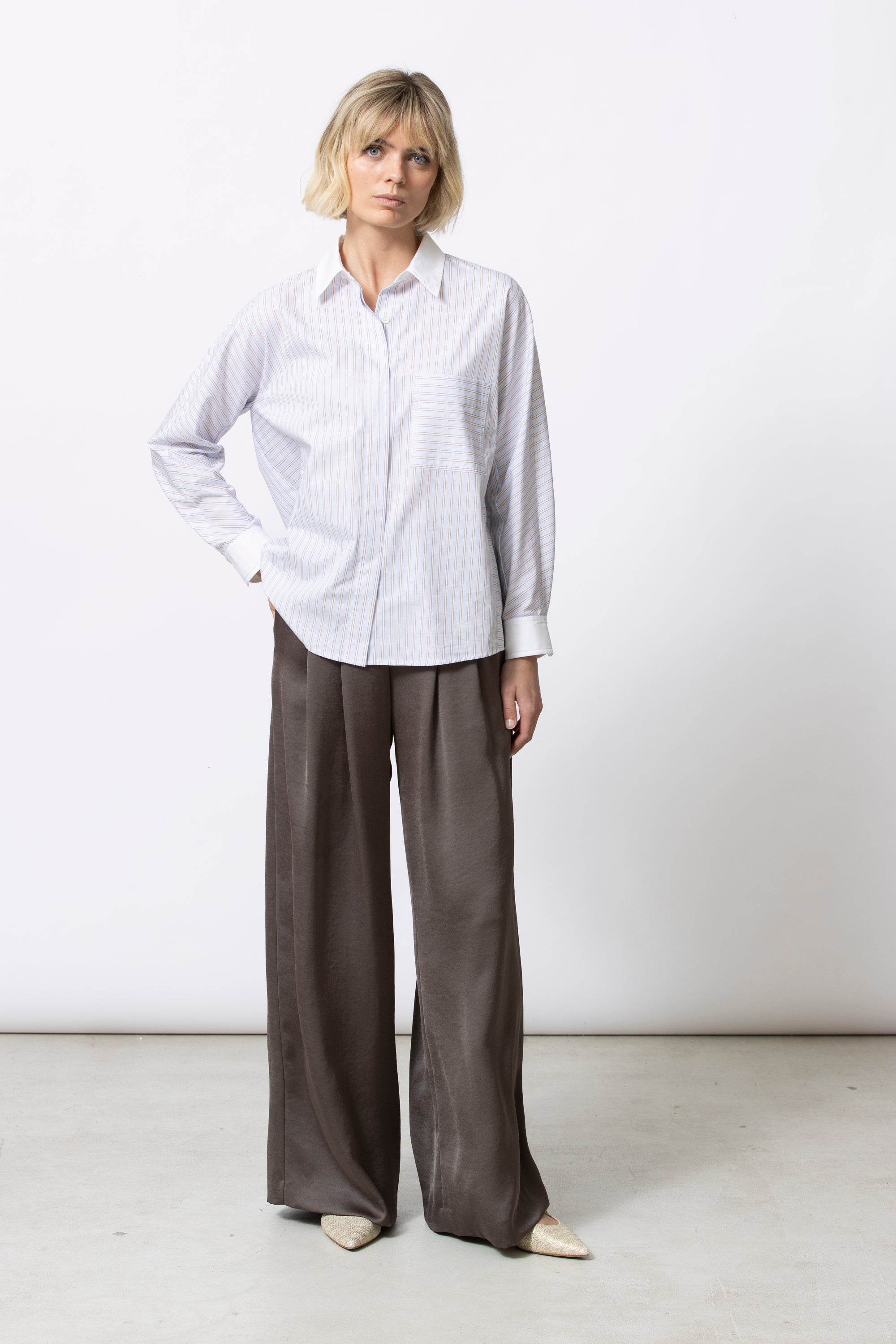 De losse, langere snit valt soepel rond het lichaam, terwijl de doorknoopte rug het silhouet extra diepte geeft. Sterk op zichzelf, maar ook ideaal onder een vest of jasje.