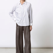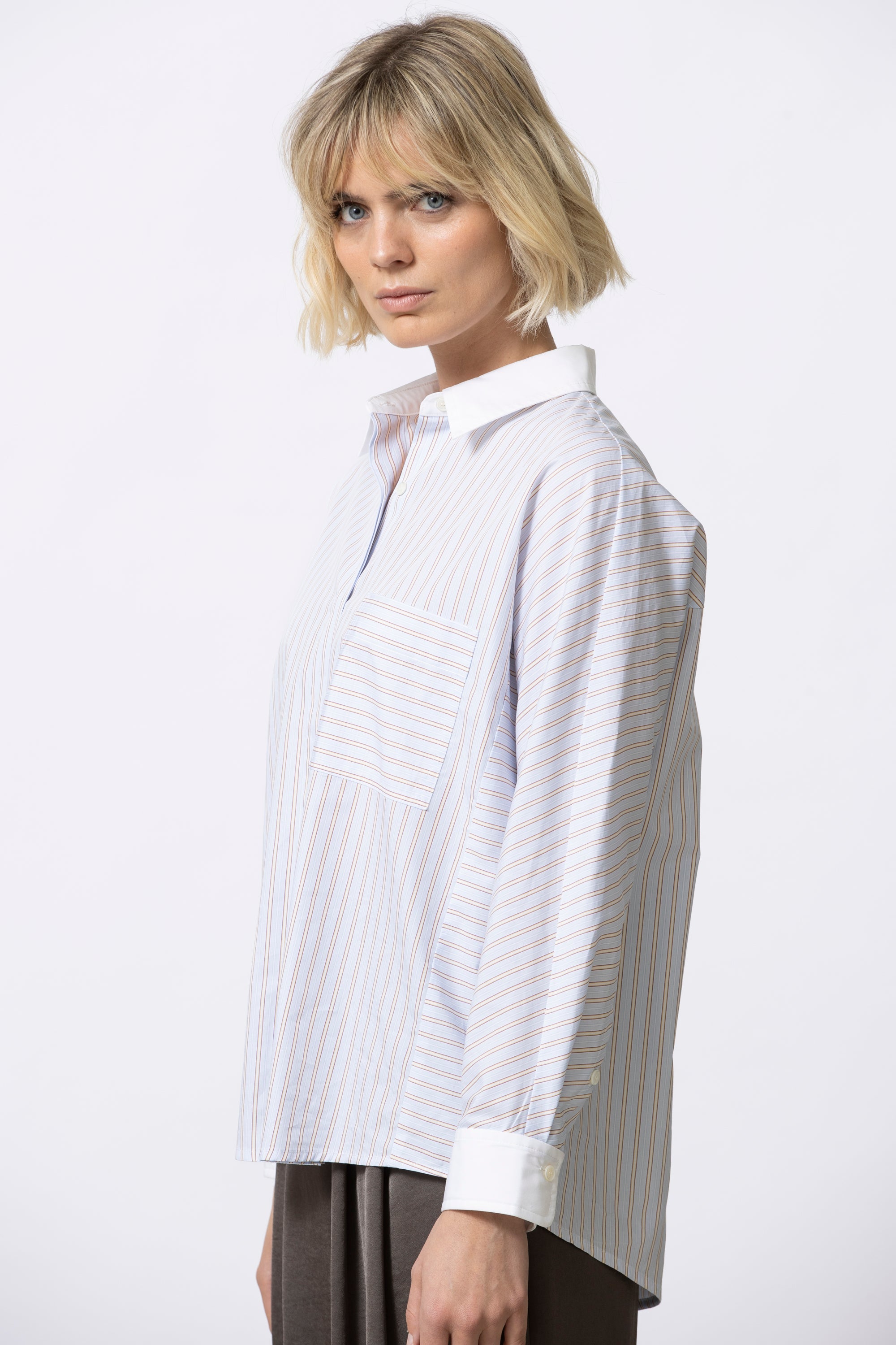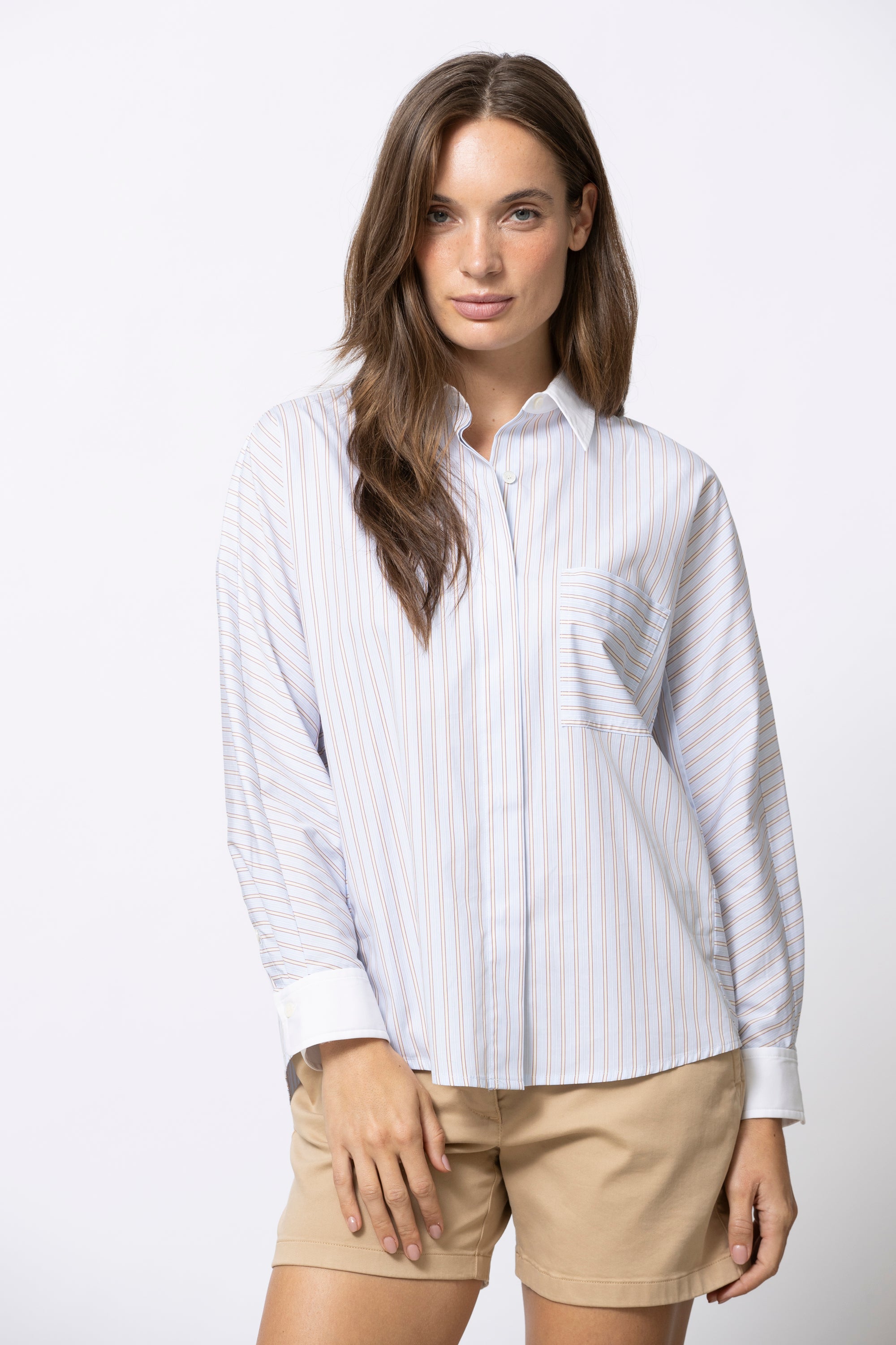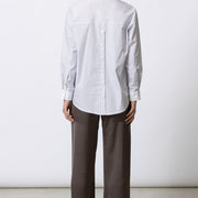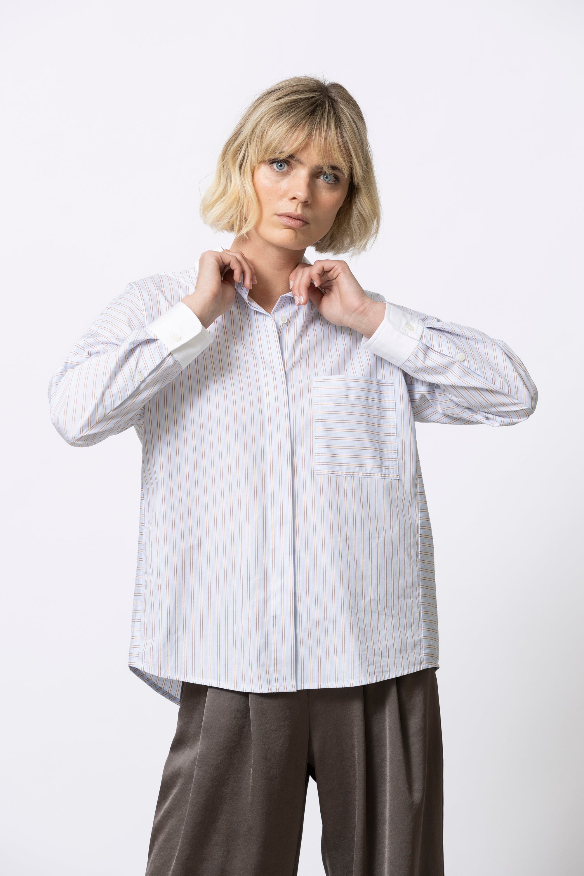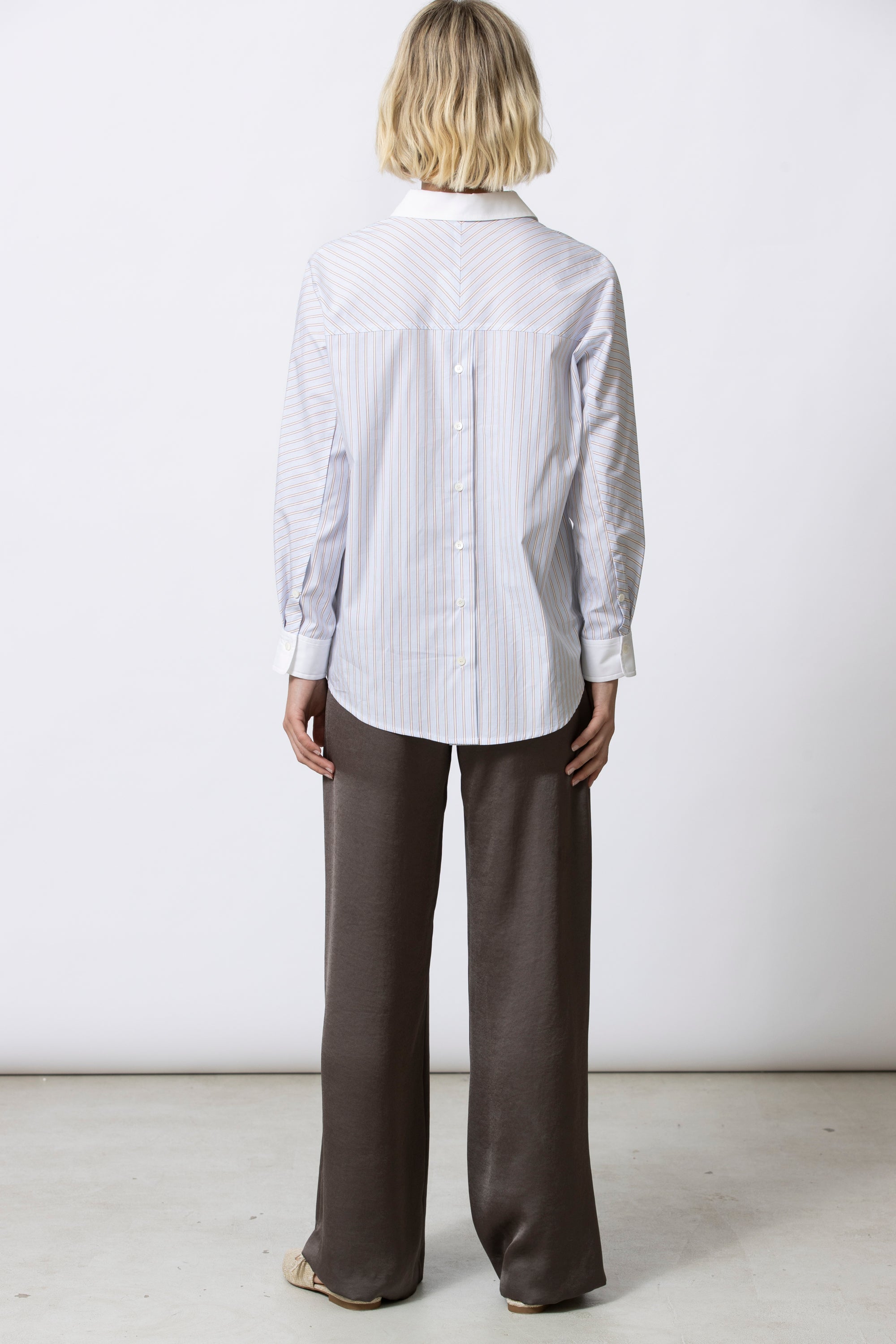 Een hemd met fijne strepen en een contrasterende witte kraag.