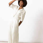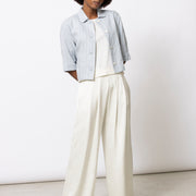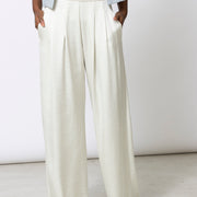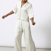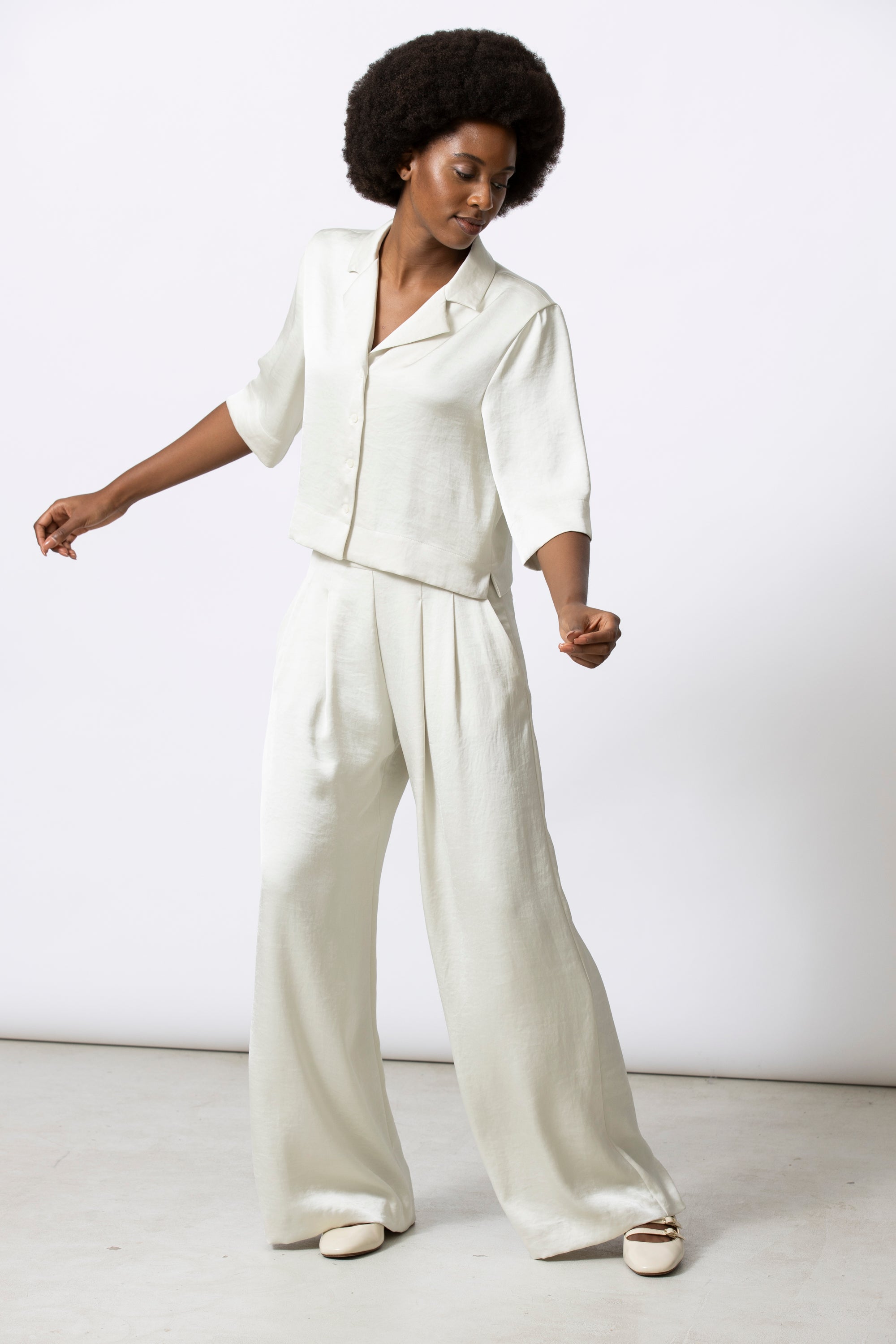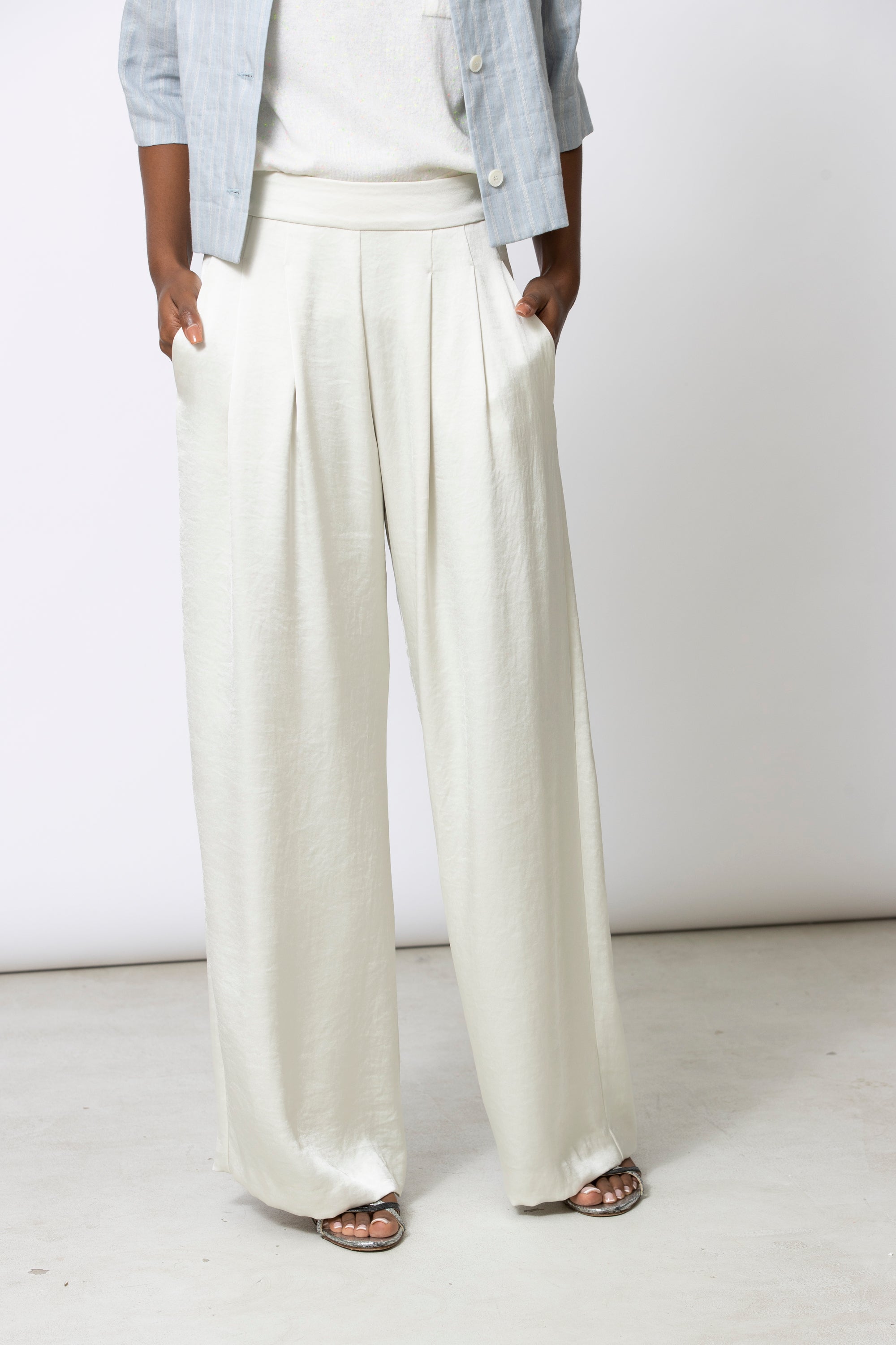 Soepele, blinkende broek met een wijd en elegant silhouet. De stof valt vloeiend langs het been en geeft beweging bij elke stap. Feestelijk in combinatie met de bijpassende top, maar ook sterk apart.