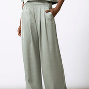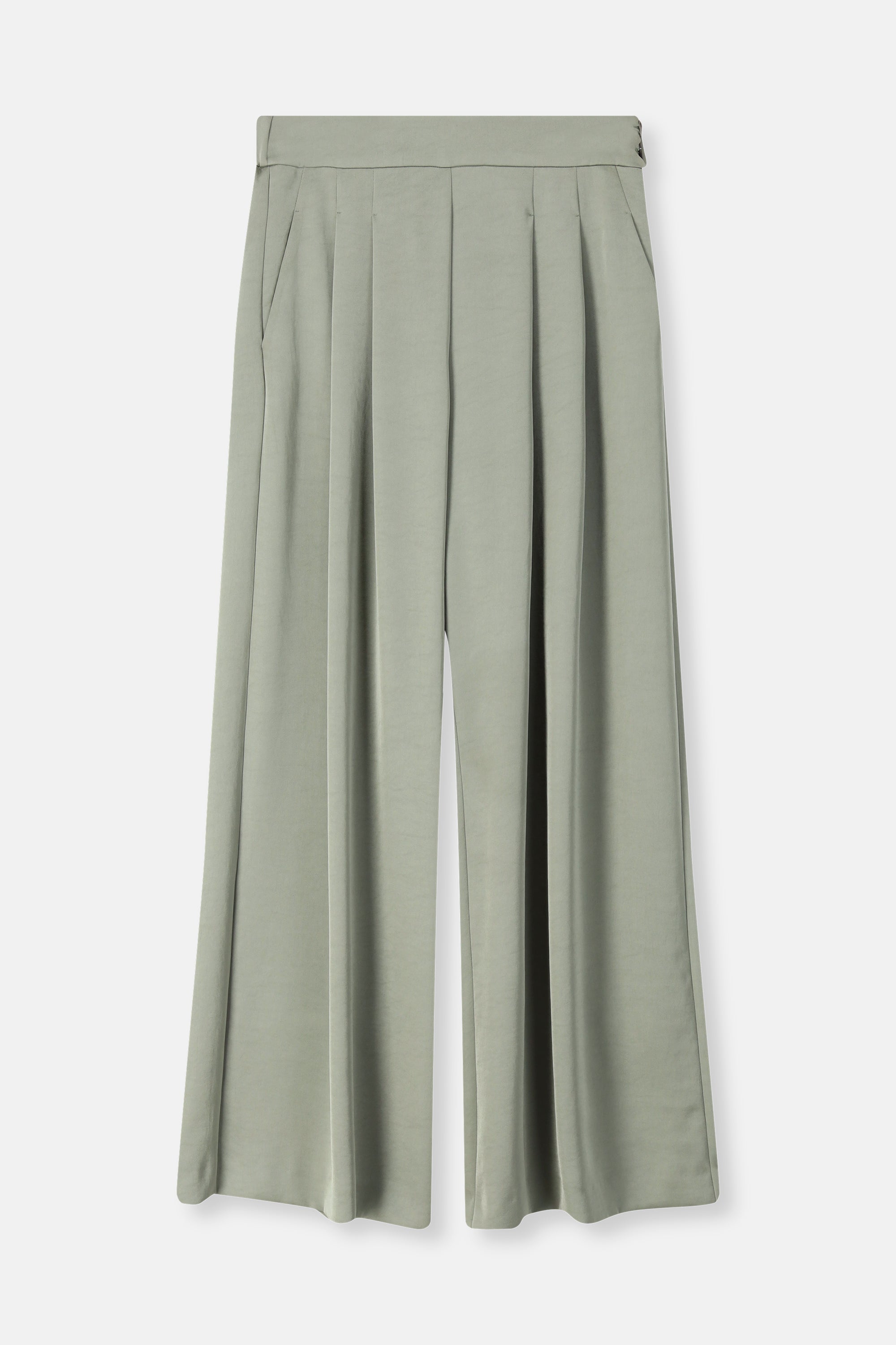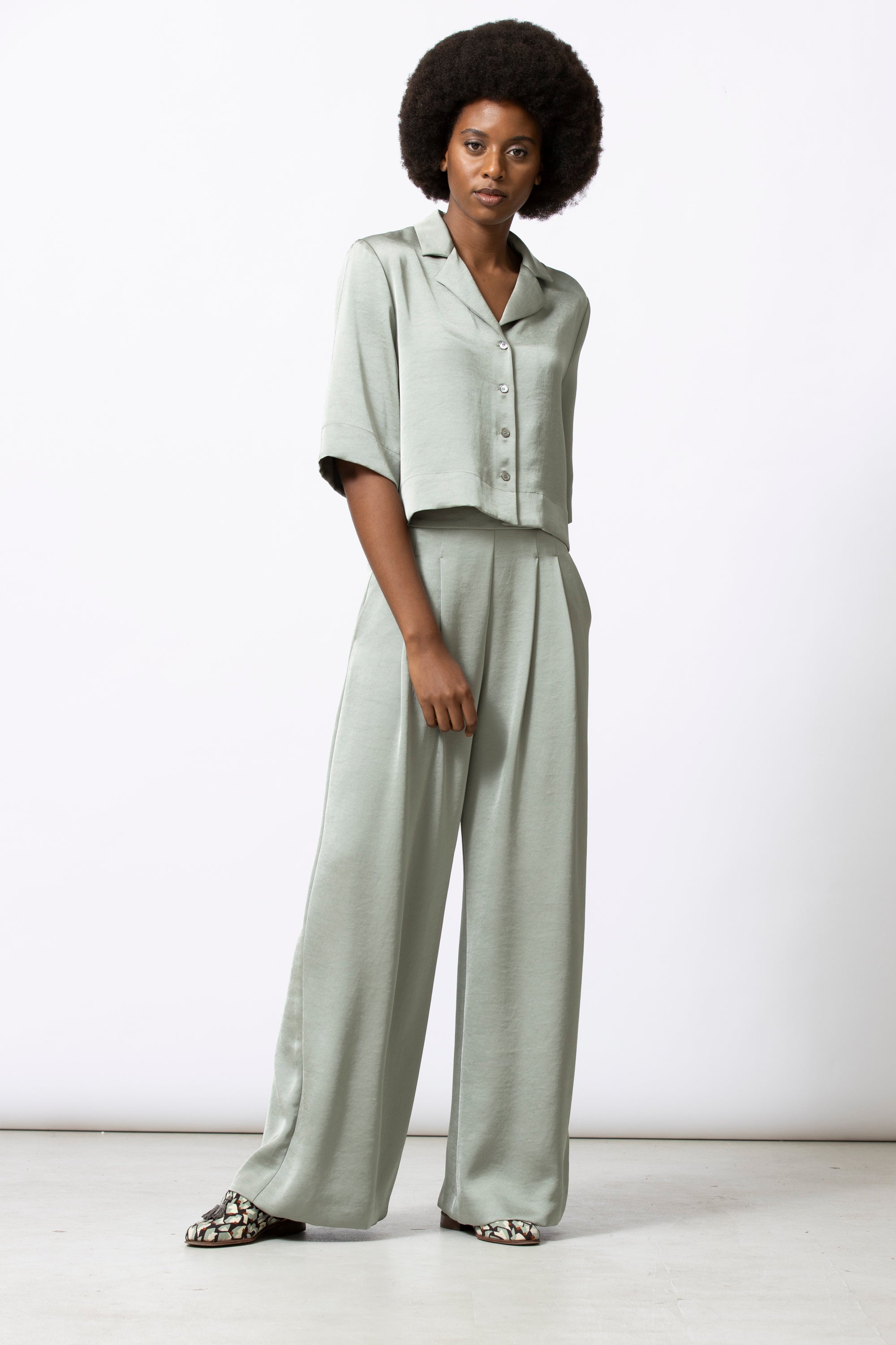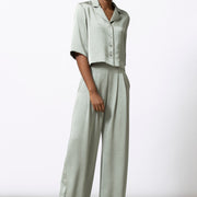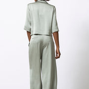 Soepele, blinkende satijnenbroek met een wijd en elegant silhouet. De stof valt vloeiend langs het been en geeft beweging bij elke stap. Feestelijk in combinatie met de bijpassende top, maar ook sterk apart.