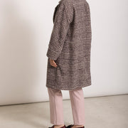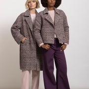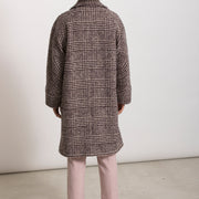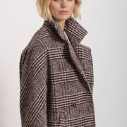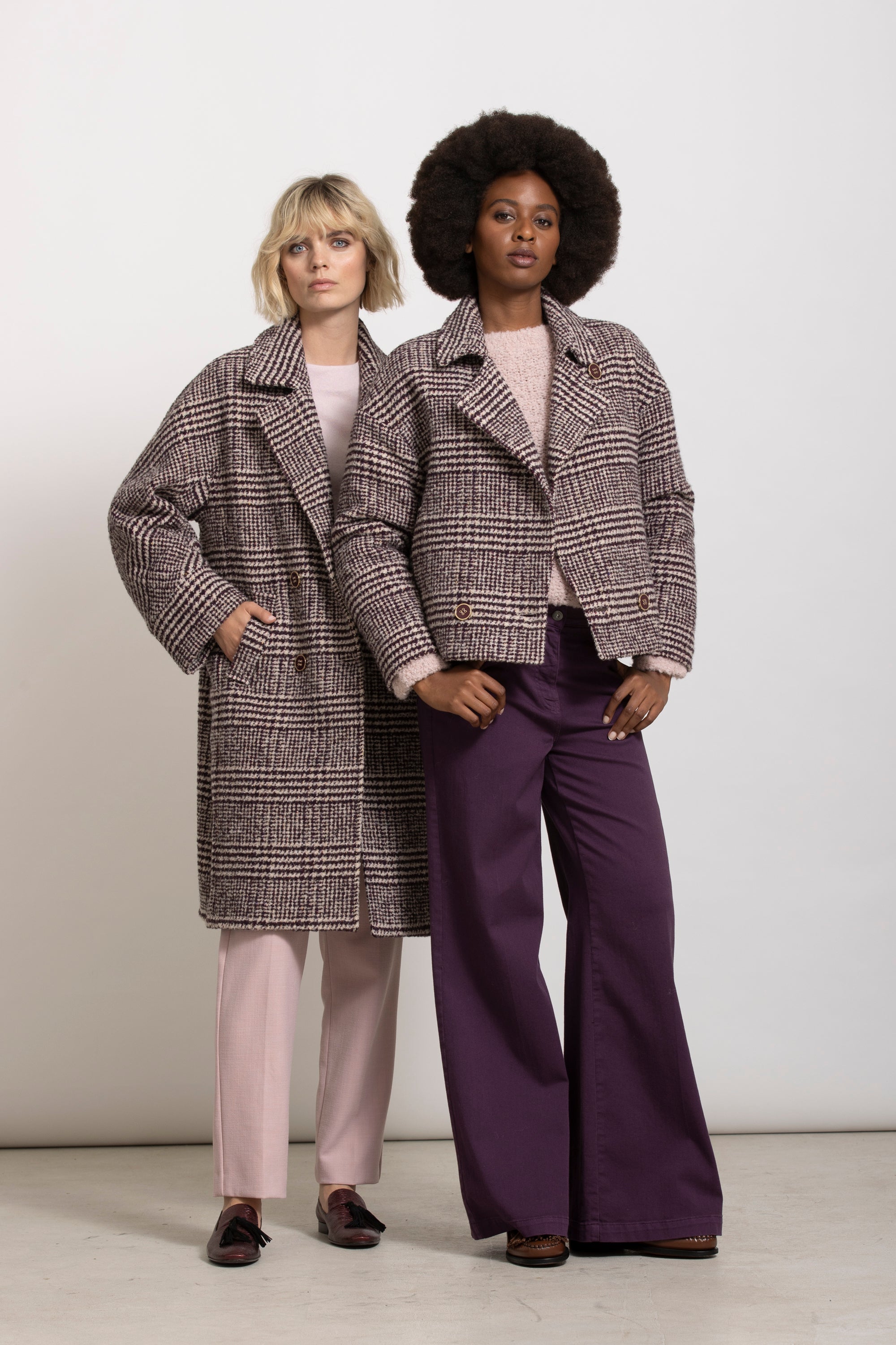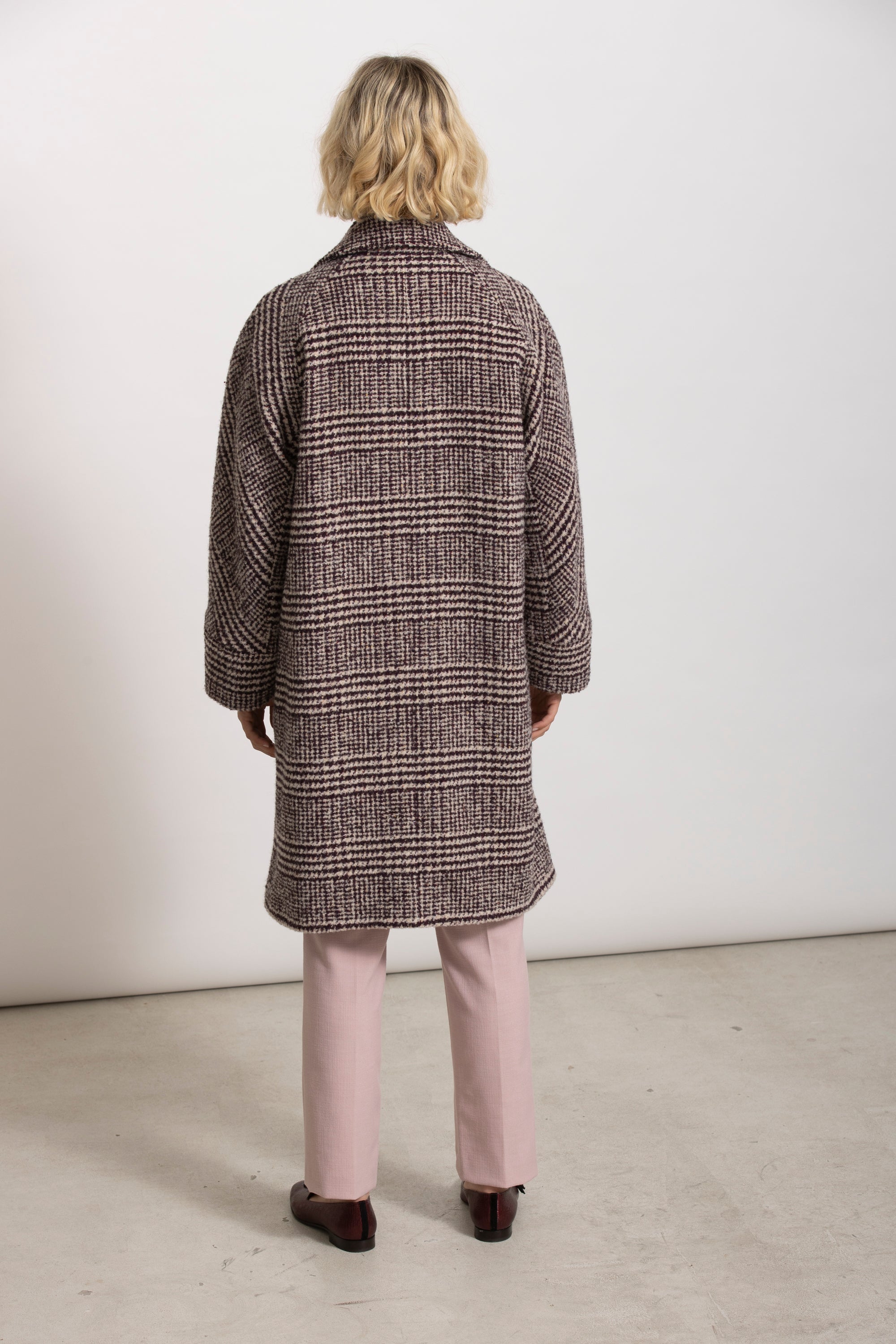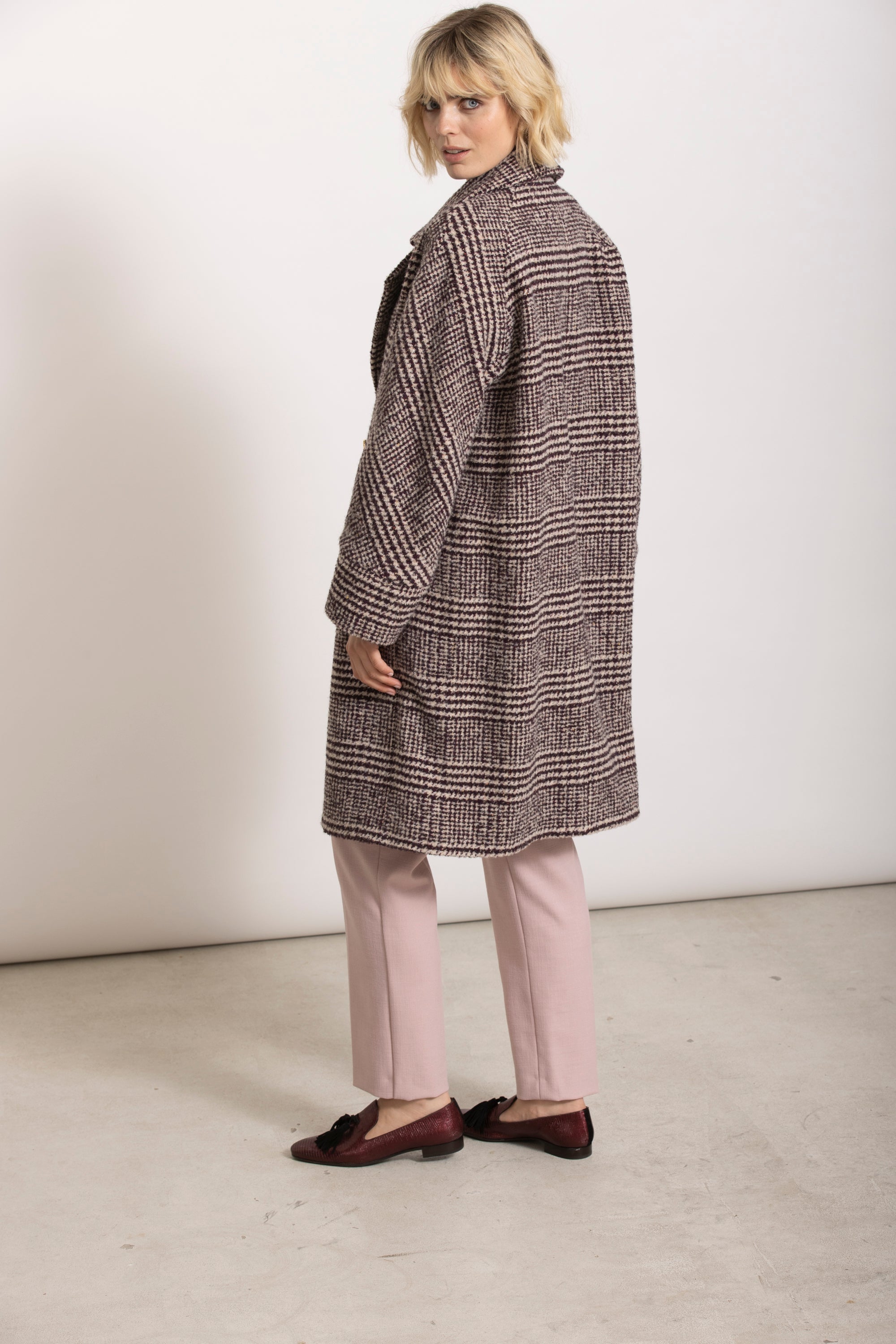 Deze oversized bordeaux geruite mantel met dubbele knopenrij en praktische steekzakken reikt tot op de knie. De diepe bordeaux ruit geeft een tijdloze uitstraling die makkelijk te combineren is met zowel casual als geklede looks. Ideaal om je de hele winter lang warm te houden.