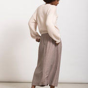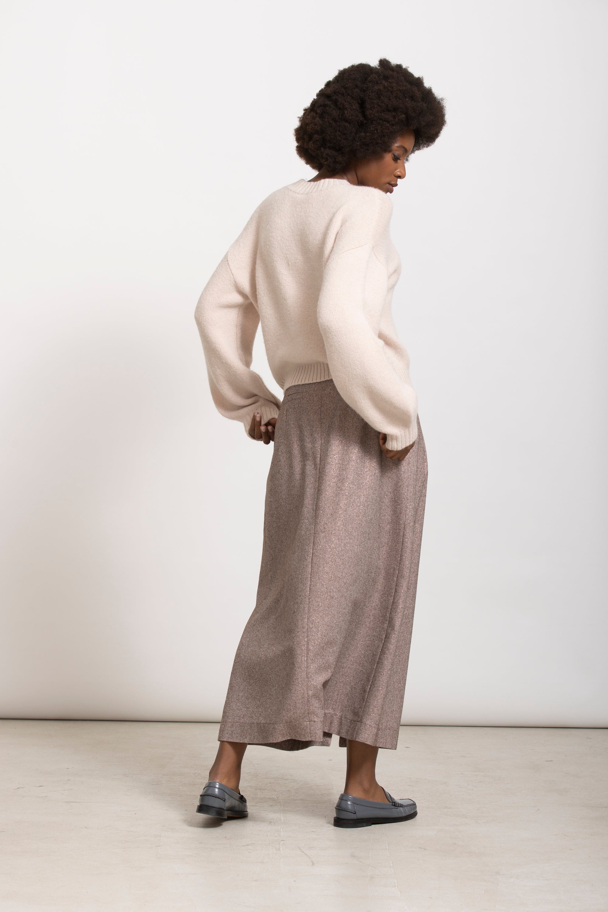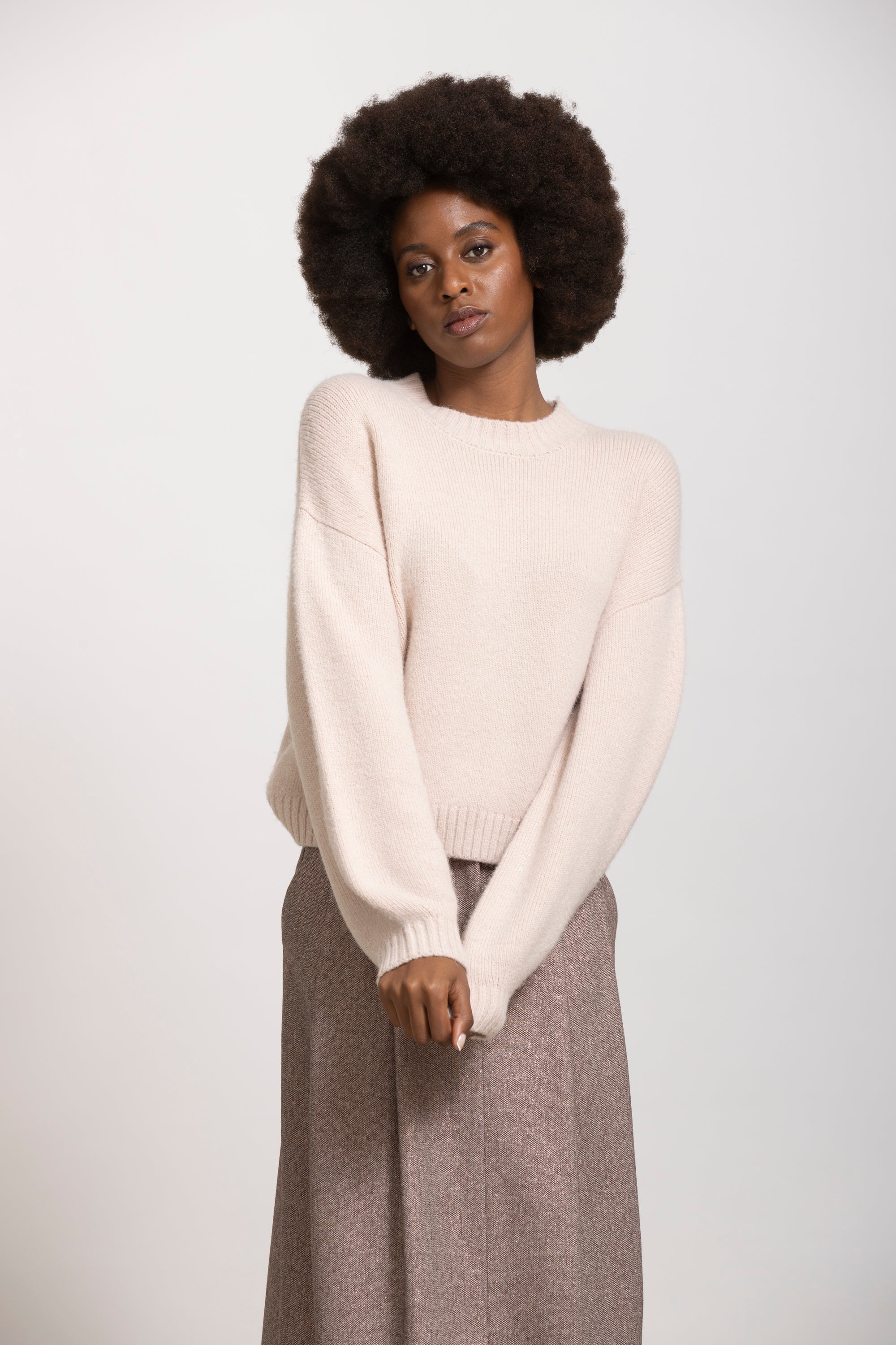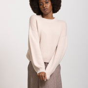 Wollig winterwit voor deze oversized trui in een zachte alpacamix. Licht, warm en comfortabel – een cosy essential voor de koudere maanden.