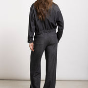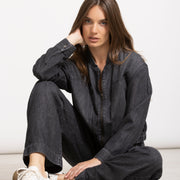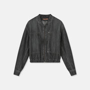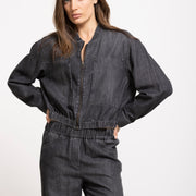 Denim bomberjack in donkergrijs denim, met elastische zoom, rits en grote opgestikte zakken voor een subtiel worker-effect. Stijlvol solo of als set met de broekrok TYFEN voor een full-denim look.