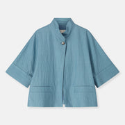 Chique én casual in één. WAMPA is een kort vestje met een opstaande kraag en driekwart mouwen, uitgevoerd in een wrinkled kwaliteit die meteen karakter geeft. Makkelijk te combineren, van elke dag tot iets meer gekleed.