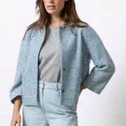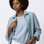 Eenvoudige snit in een bijzondere stof. WEN is een licht jasje met subtiele pailletten die zorgen voor een verfijnde glans, zonder te overheersen. Chique, maar perfect draagbaar voor elke dag.