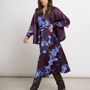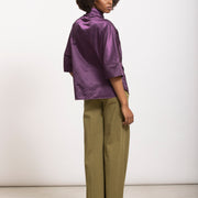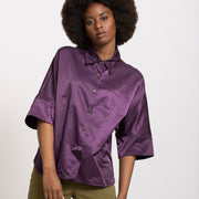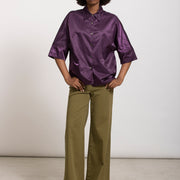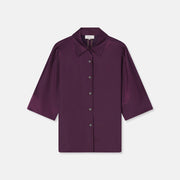 Overshirt in glanzend satijn met drukknopen en driekwart mouwen, uitgevoerd in blinkend bordeaux. Mooi te combineren met de RAKEL broek voor een elegante set. Het model is 1m79 en draagt maat 36.