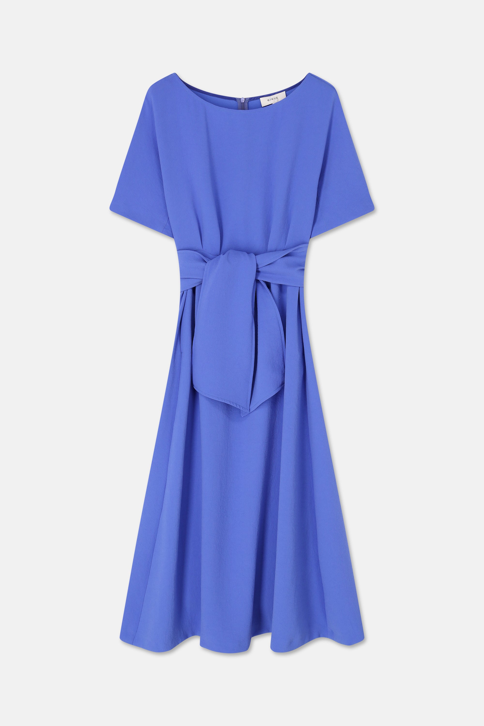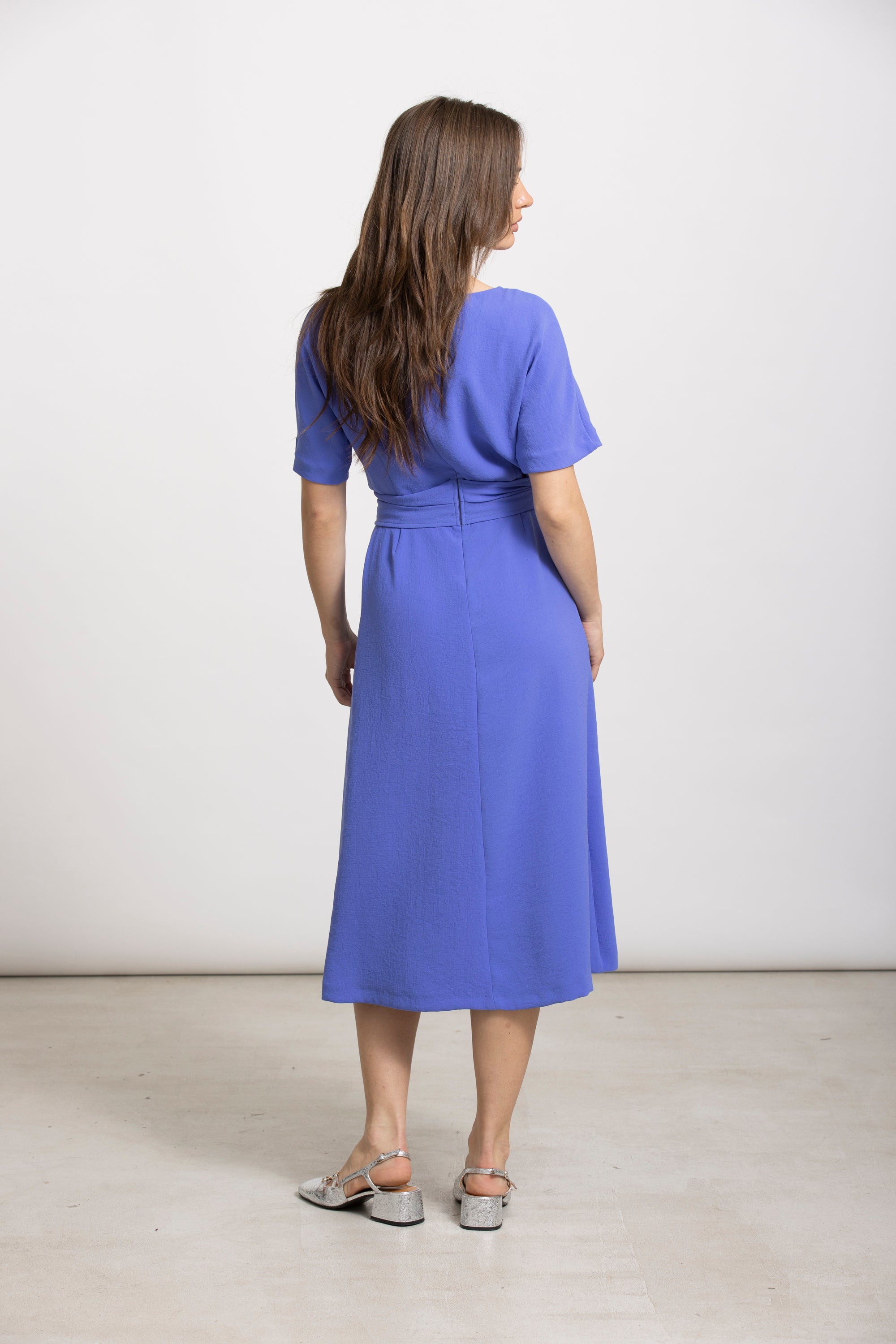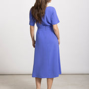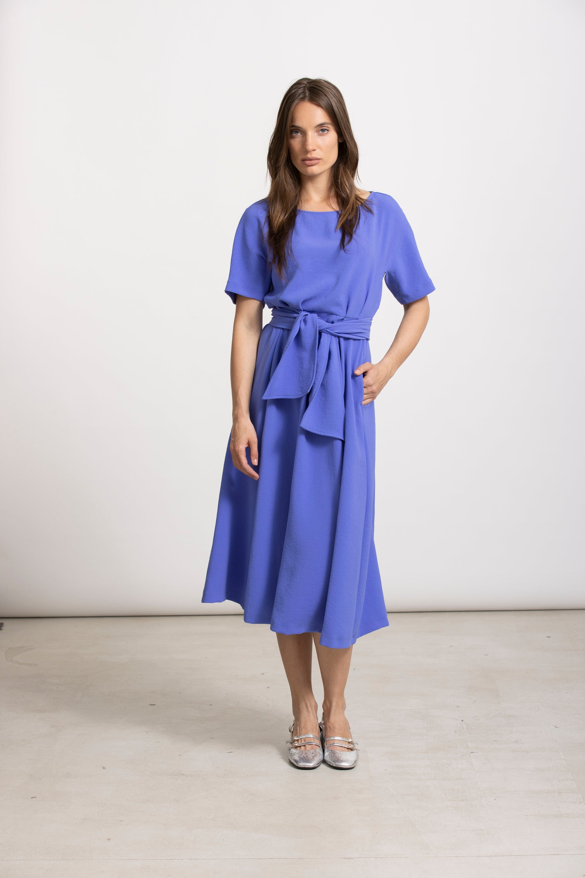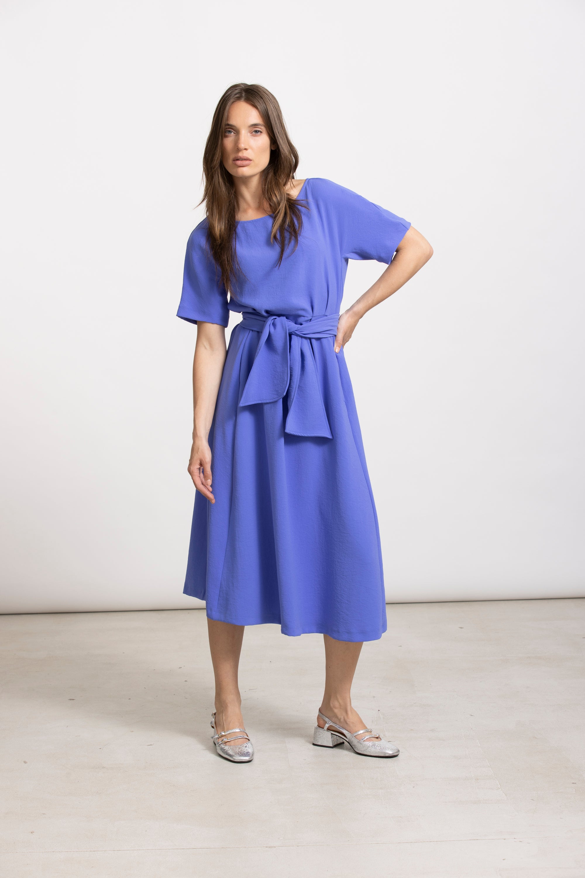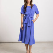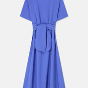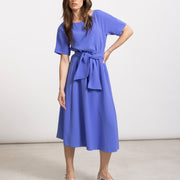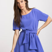 Klassieke midi-jurk in intens diepblauw met korte mouw en ronde hals. De opgestikte riem blijft mooi op zijn plaats en zorgt voor een elegant silhouet. Het model valt soepel en vormt een stijlvolle basic voor elke gelegenheid.