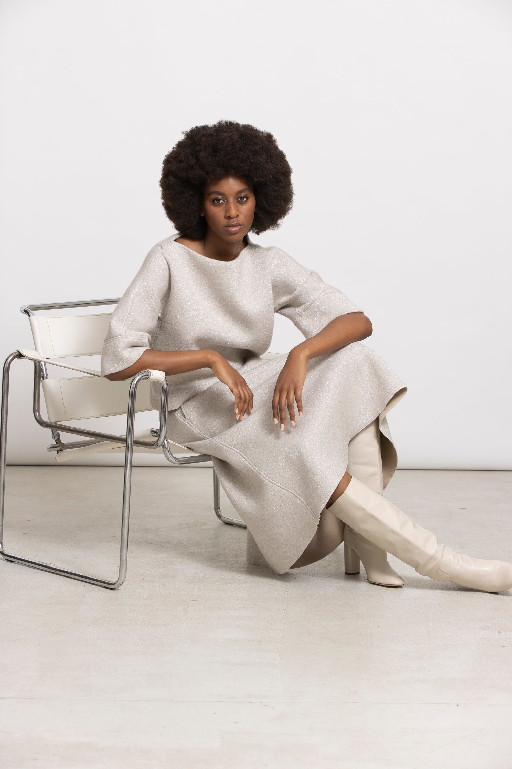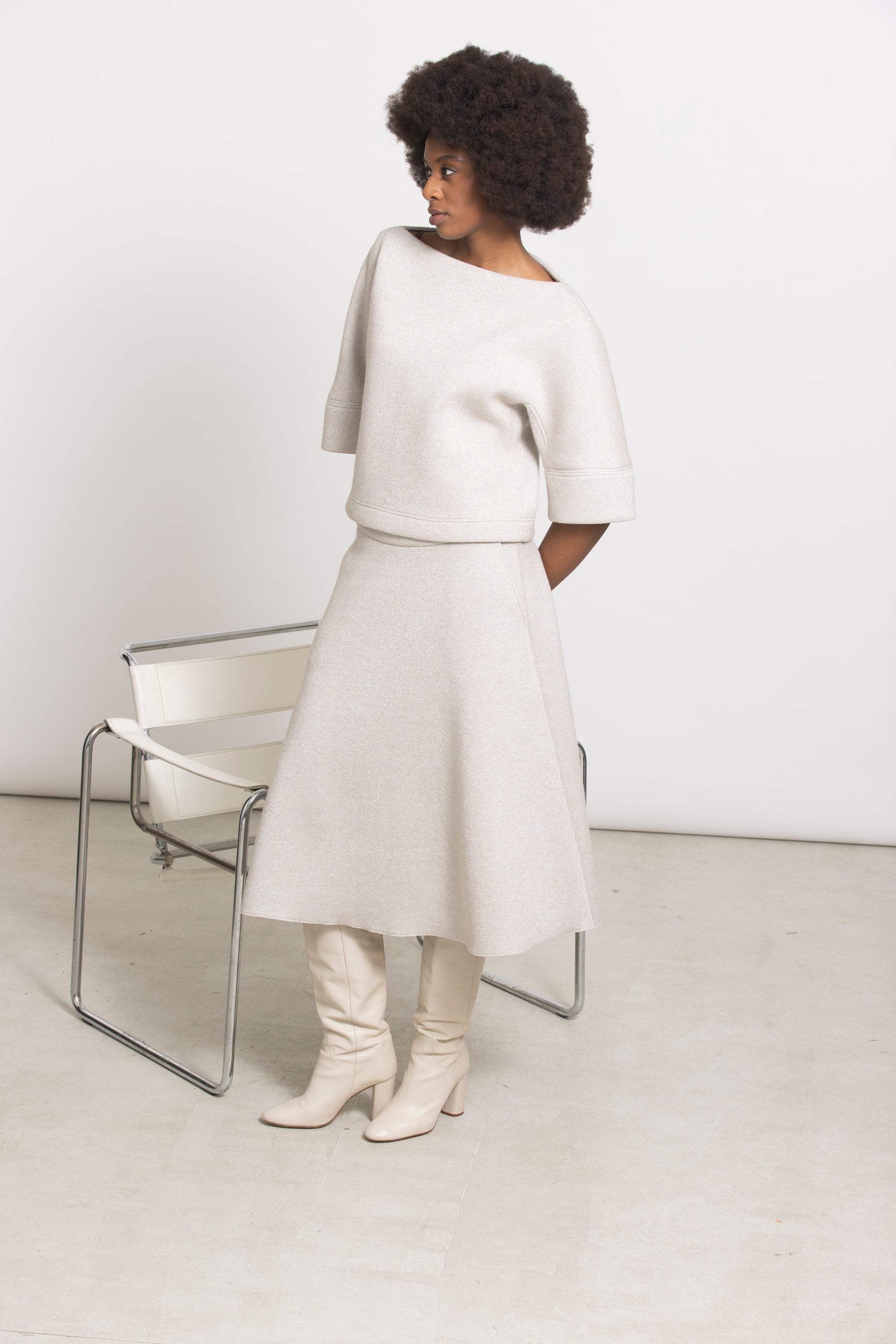 Wijde midi-rok in een stevige maar comfortabele scuba lurex. Combineer met de bijpassende top HEWIT voor een moderne total look of draag apart voor een stijlvolle statement-outfit.