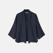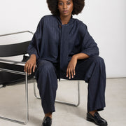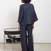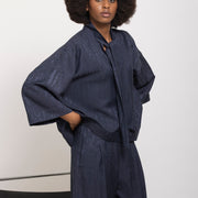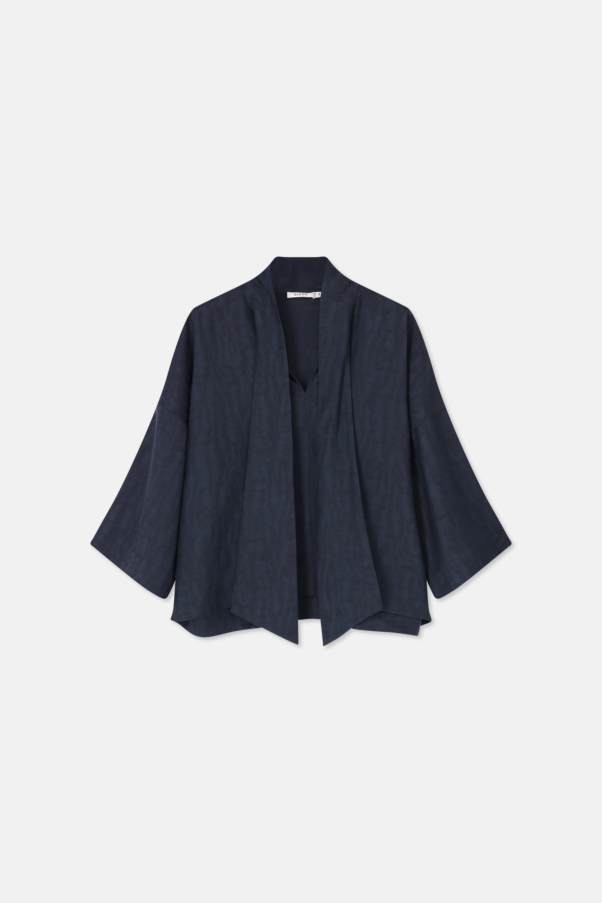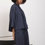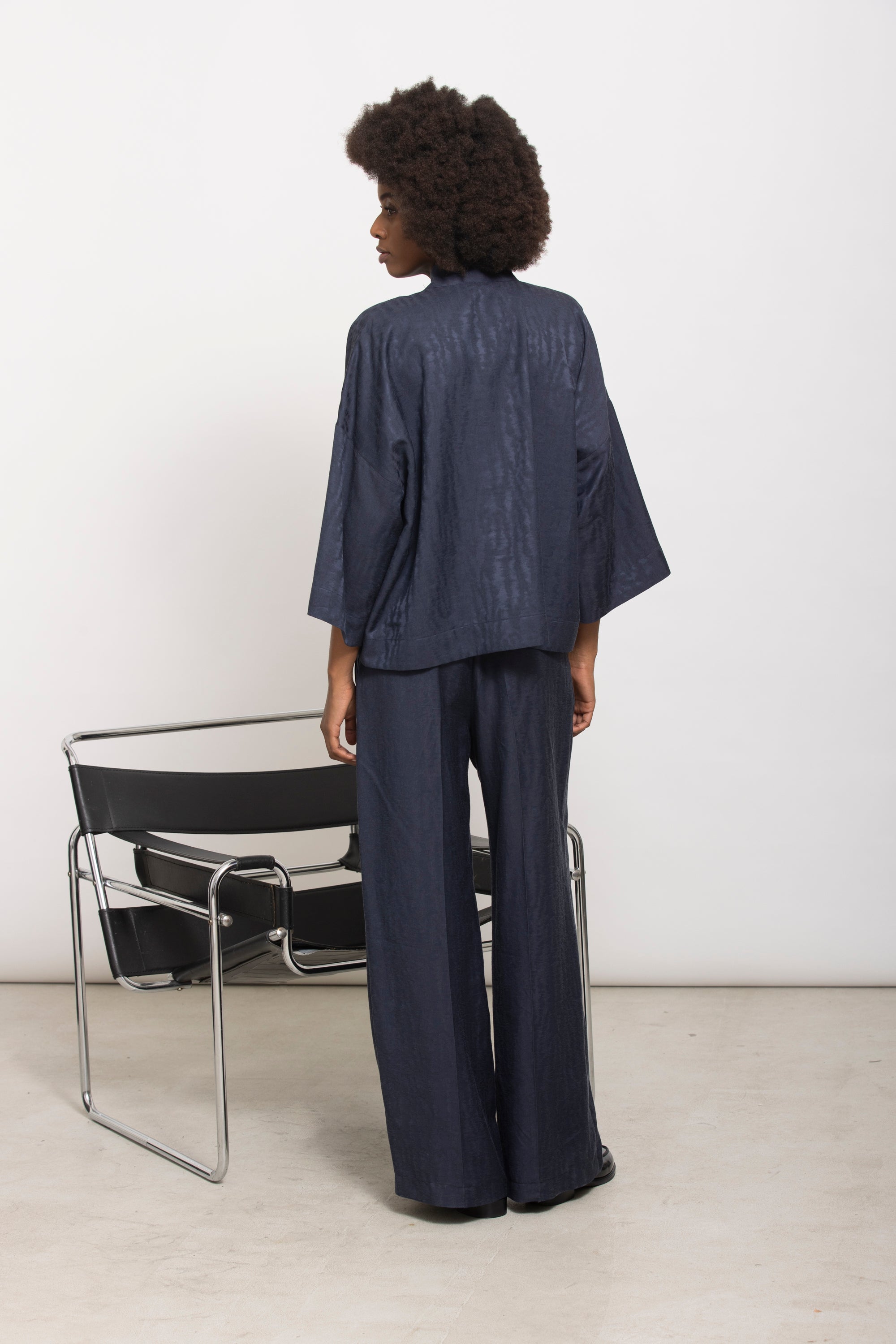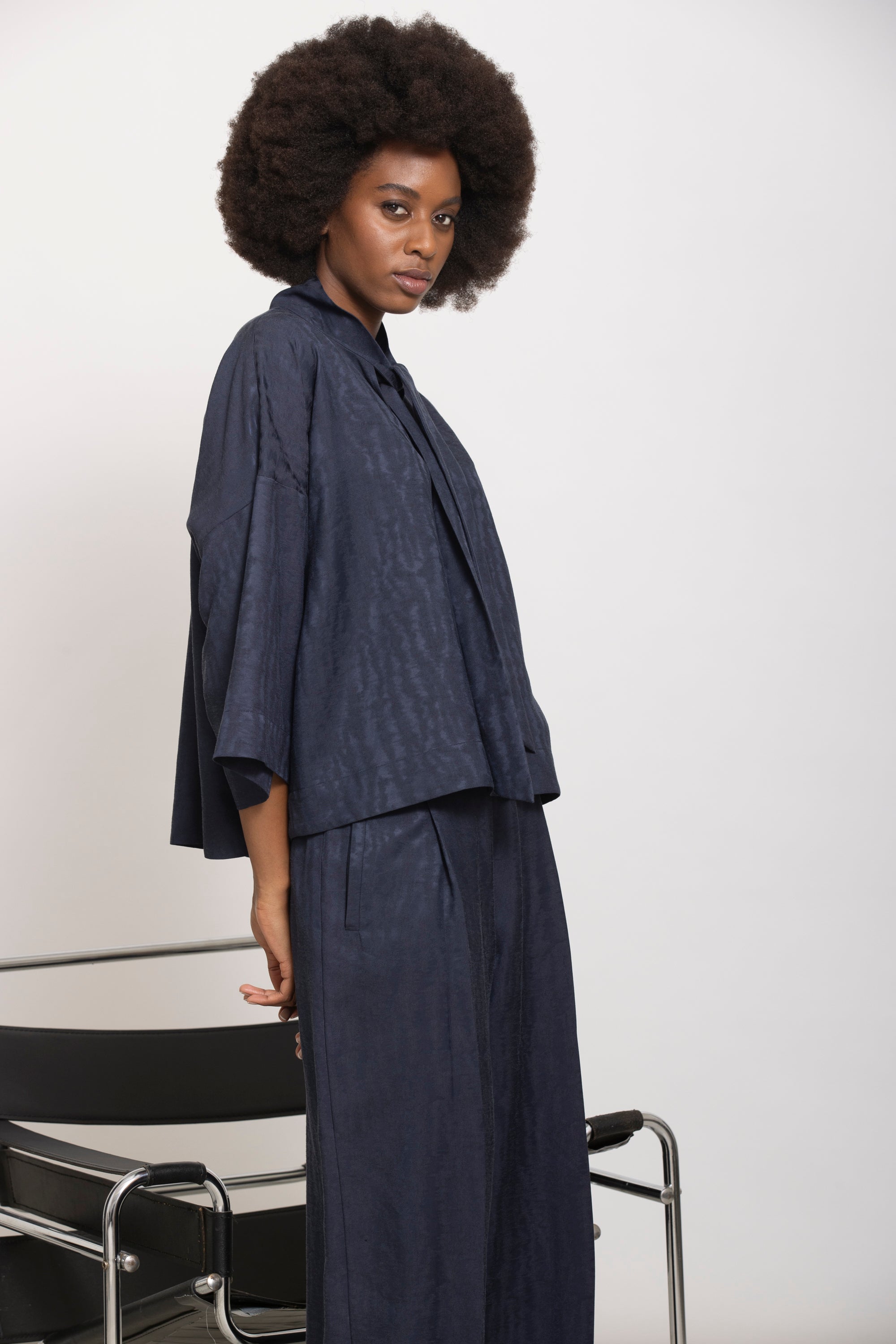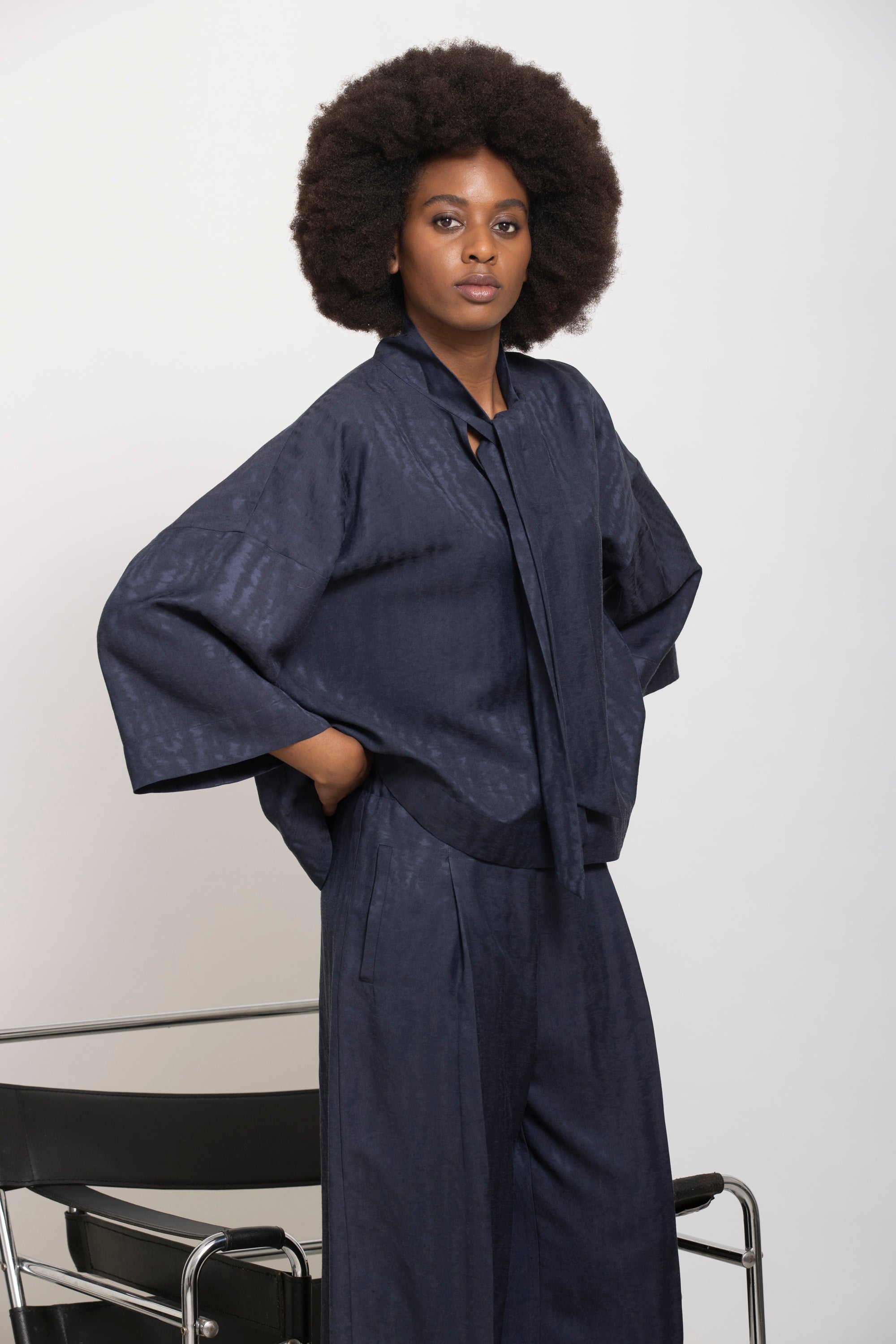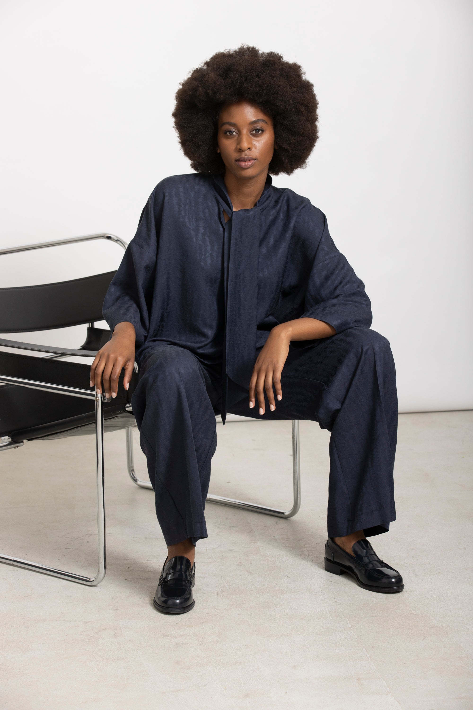 Chique donkerblauwe blouse zonder knopen, met elegante sjaalkraag die je kan knopen of los dragen. Uitgewerkt in een subtiel toon-op-toon moiré. Perfect voor zowel een avondje uit als een professionele meeting. Combineer met de bijpassende ROCHE broek voor een complete look.