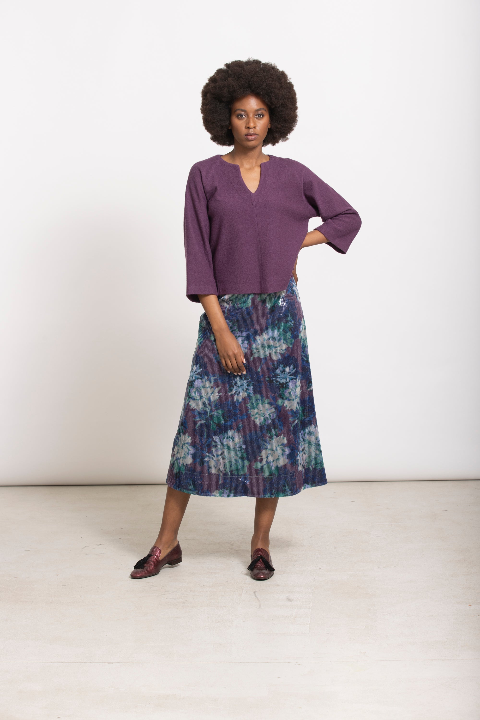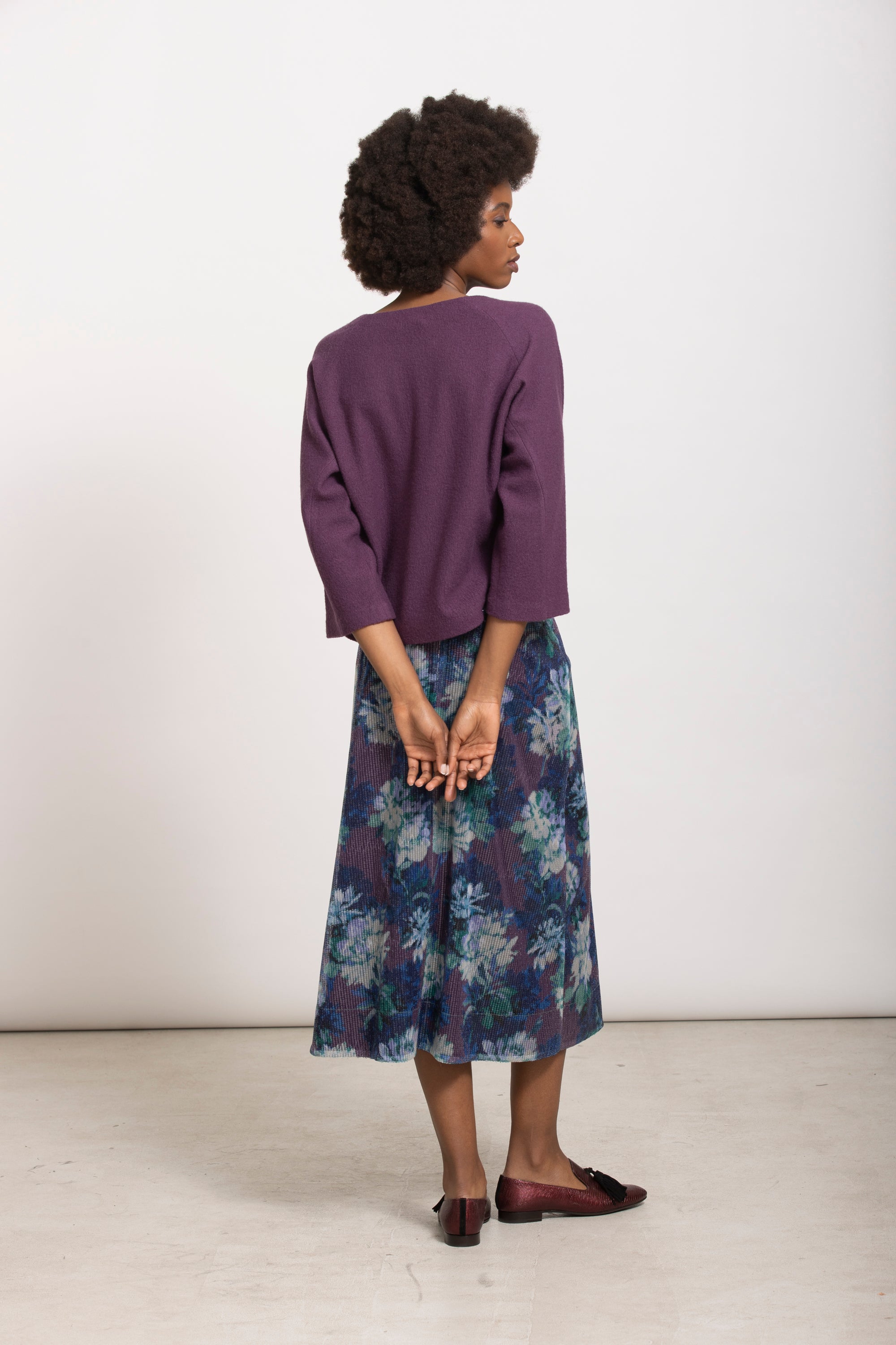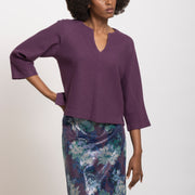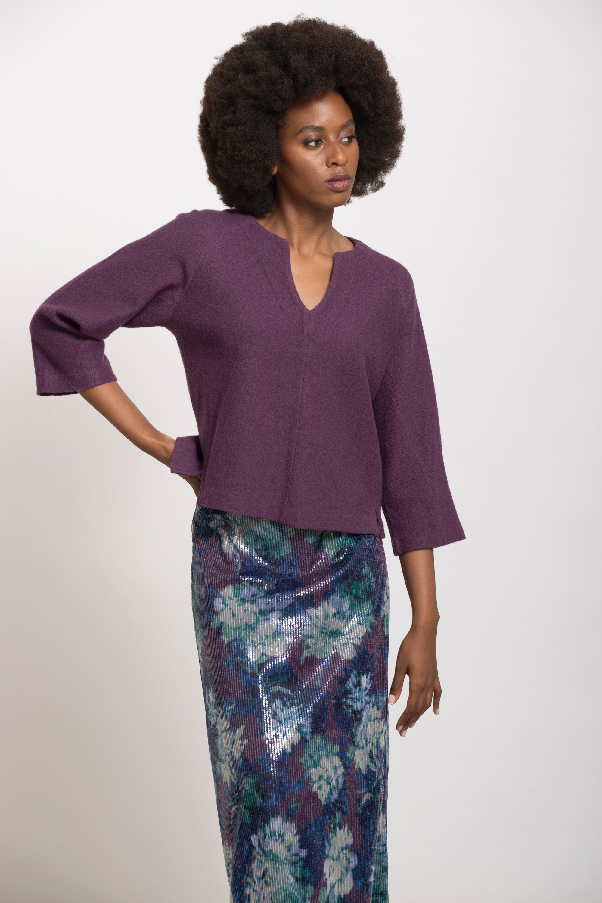 Rechtvallende top in diepe bordeaux boiled merinowol, met V-hals en een sobere, tijdloze uitstraling. Ideaal om te layeren over een blouse of sous-pull. Gemaakt van 100% pure merinowol – warm, luchtig en comfortabel.