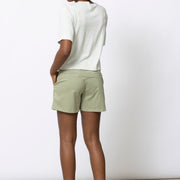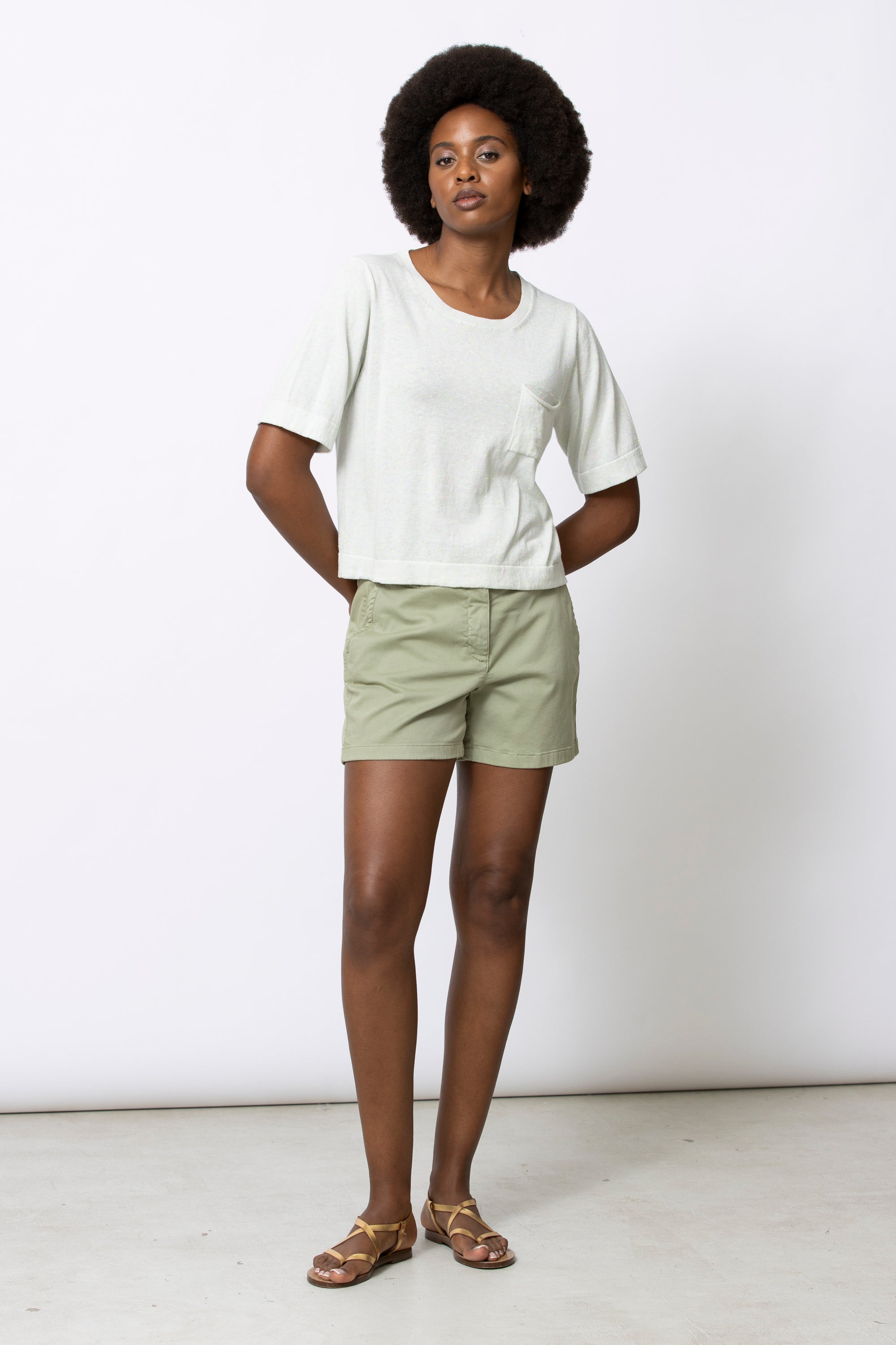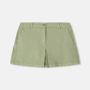 Korte short met een cleane, vrouwelijke snit. Gemaakt in een comfortabele katoen-lycra satijnkwaliteit die soepel meebeweegt en mooi blijft zitten. Een zomerse essential die je moeiteloos combineert, van casual tot iets gekleder.