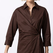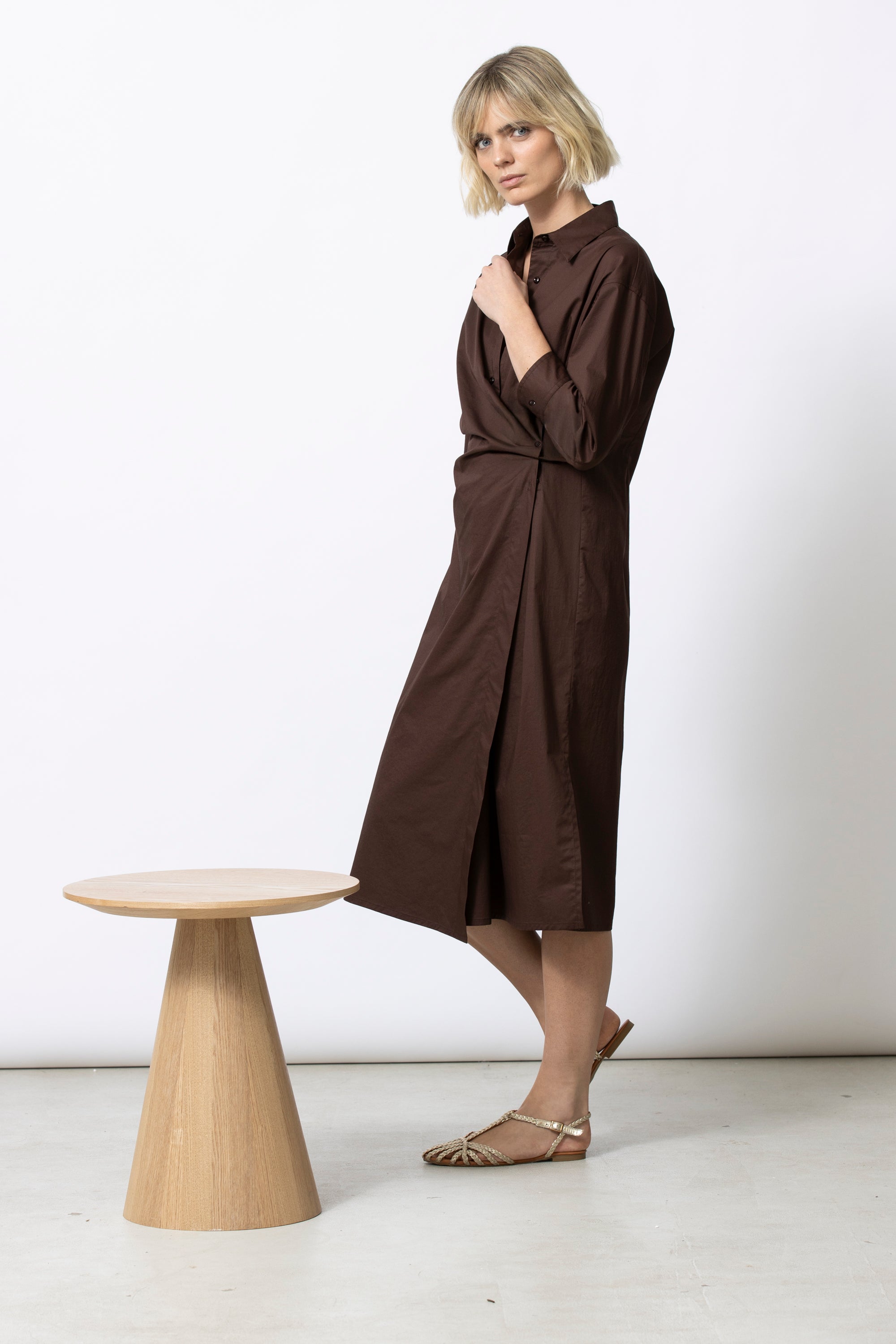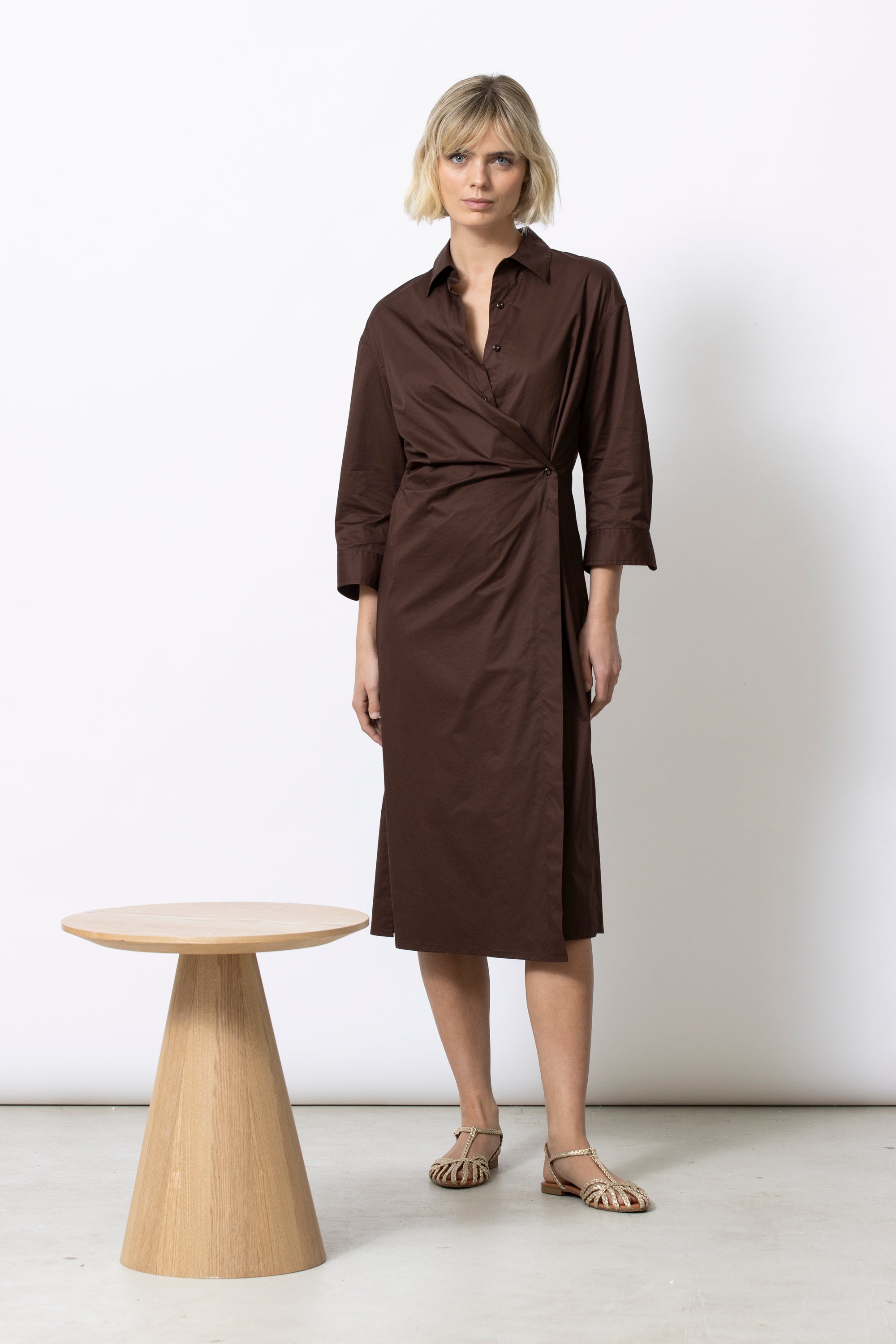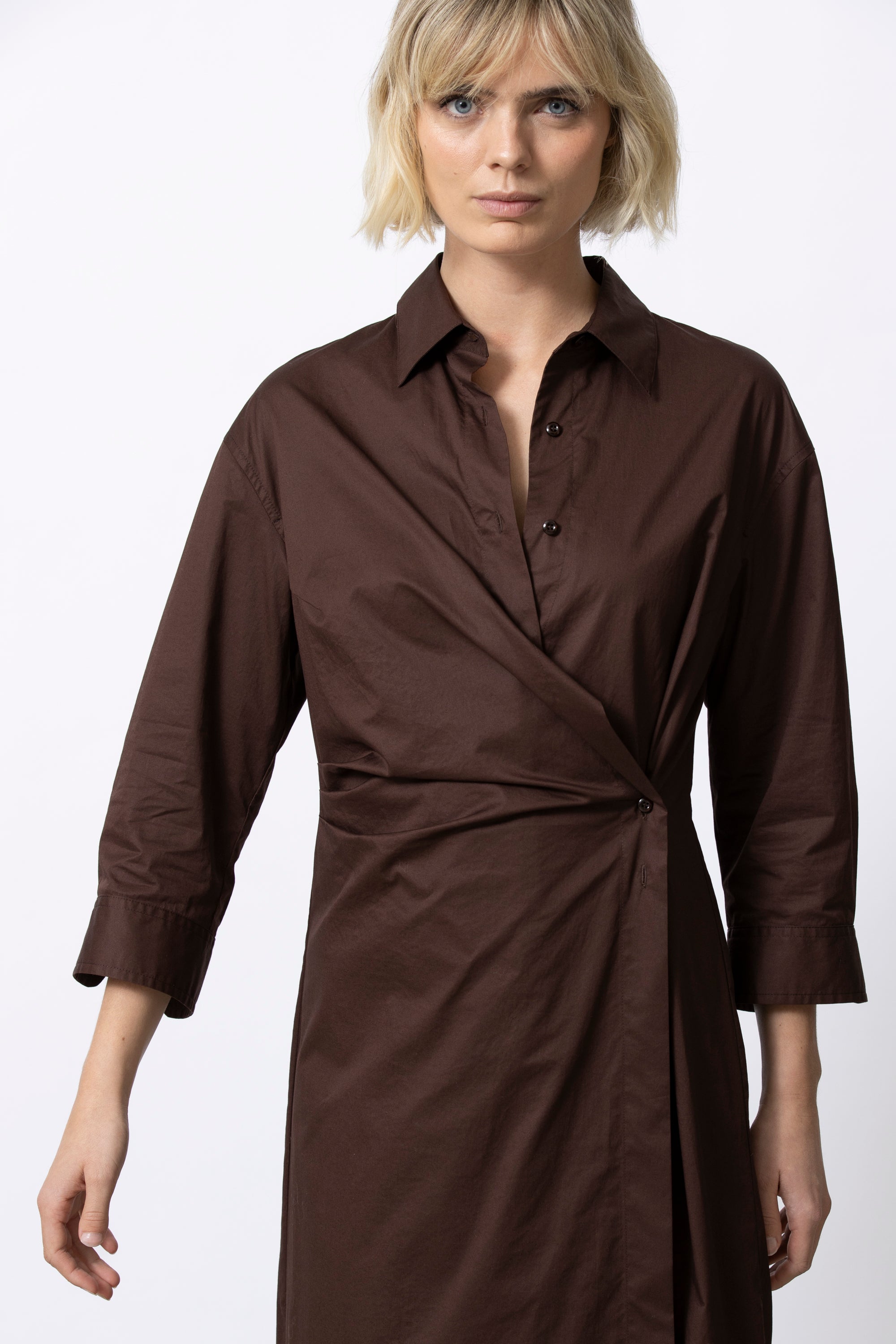 Actuele, vrouwelijke interpretatie van het klassieke hemdskleed. Kori combineert een zuivere snit met een slimme wikkelconstructie die je taille subtiel accentueert. Tijdloos, flatterend en verrassend veelzijdig.