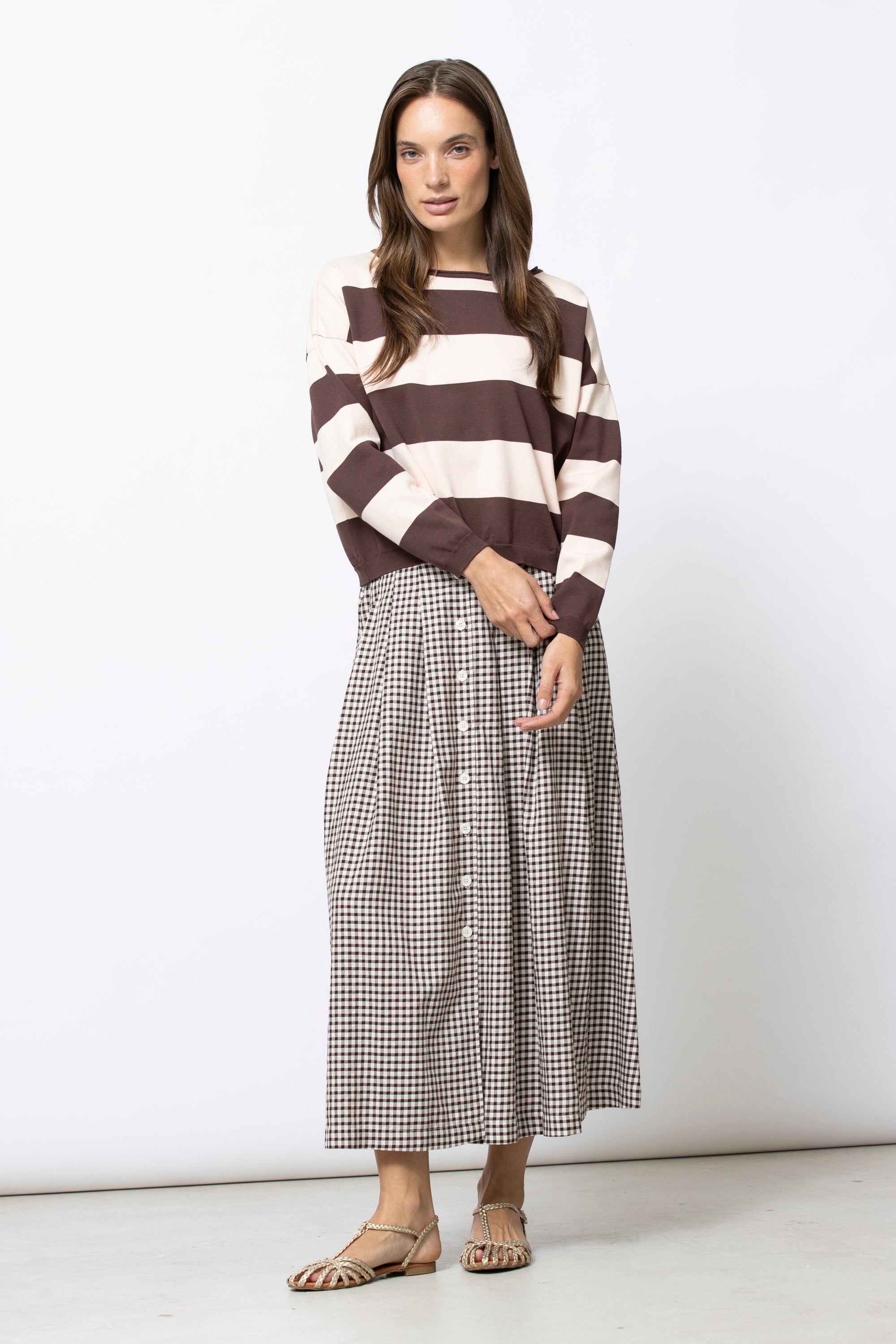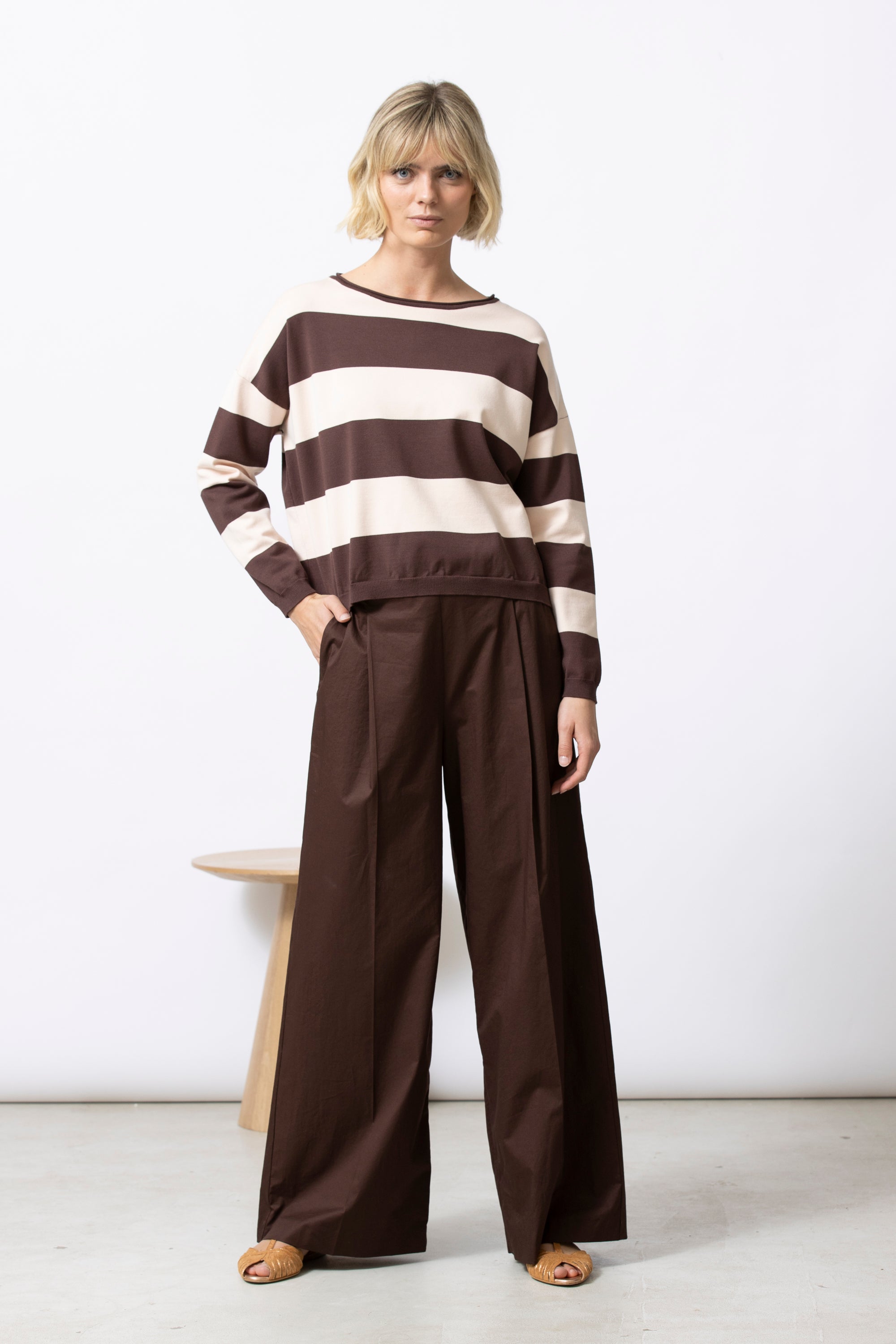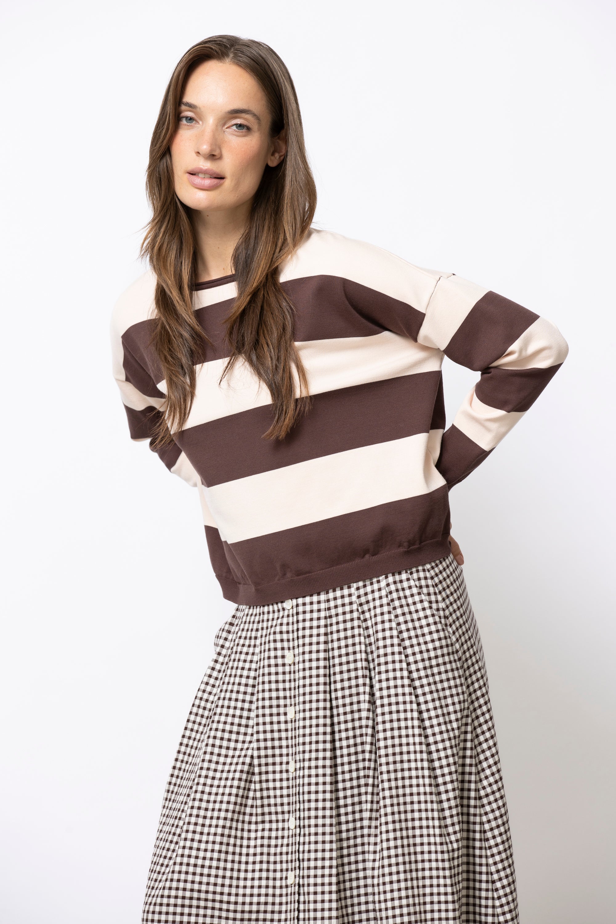 Basic truitje met strepen en een nieuw, modern volume. LAURI valt breed en iets korter op het lichaam, met een smallere mouw voor balans. Gemaakt in een aangename viscose die soepel aanvoelt en mooi valt.