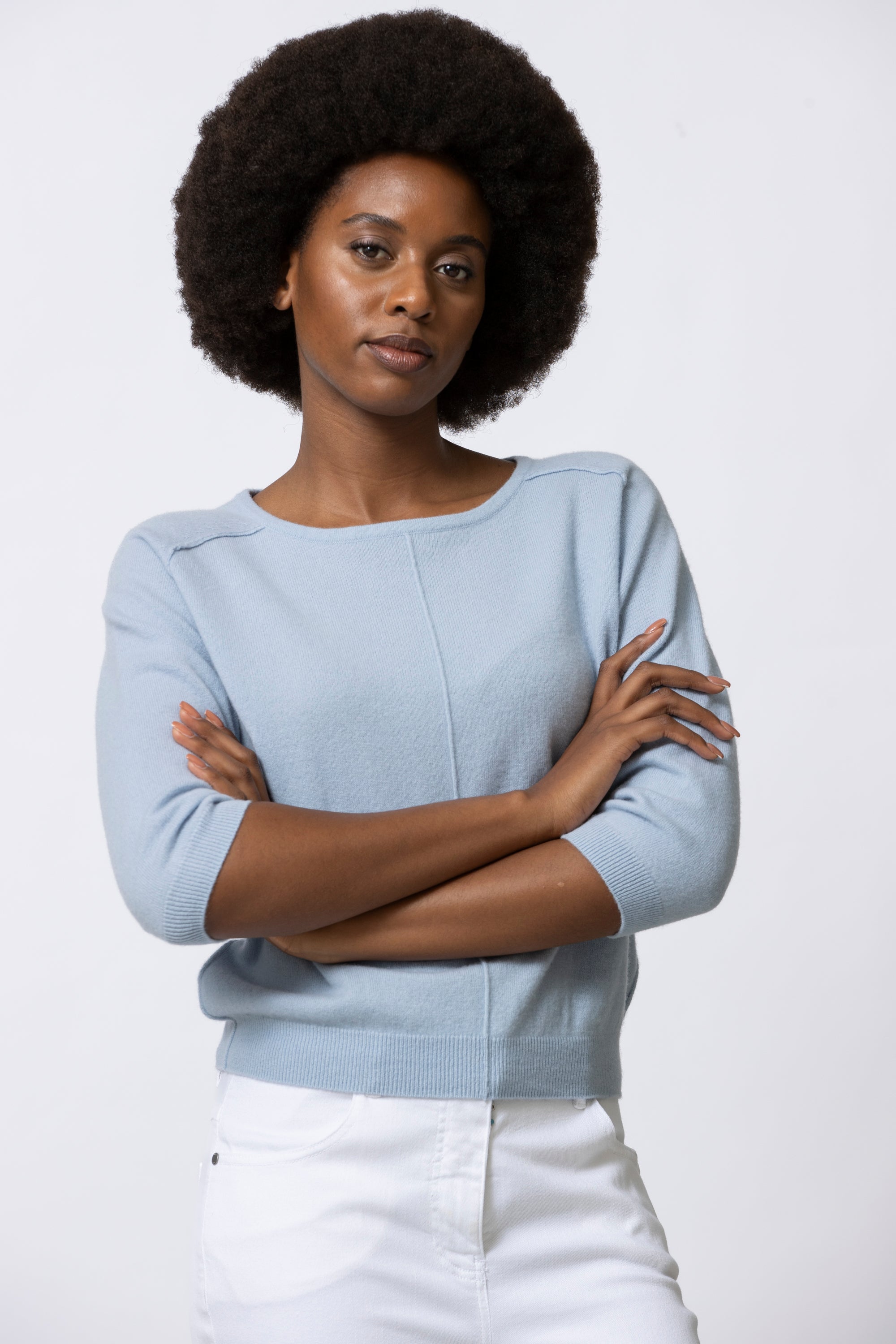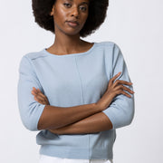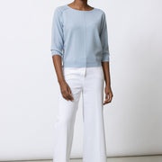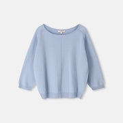 De Layla is een zachte, verfijnde lichtblauwe knit.. Het mooie volume, de open hals en de subtiele stikking vooraan geven deze trui een ontspannen maar verzorgde uitstraling. Dankzij de wol met cashmere voelt ze uitzonderlijk zacht aan en draagt ze licht en comfortabel.