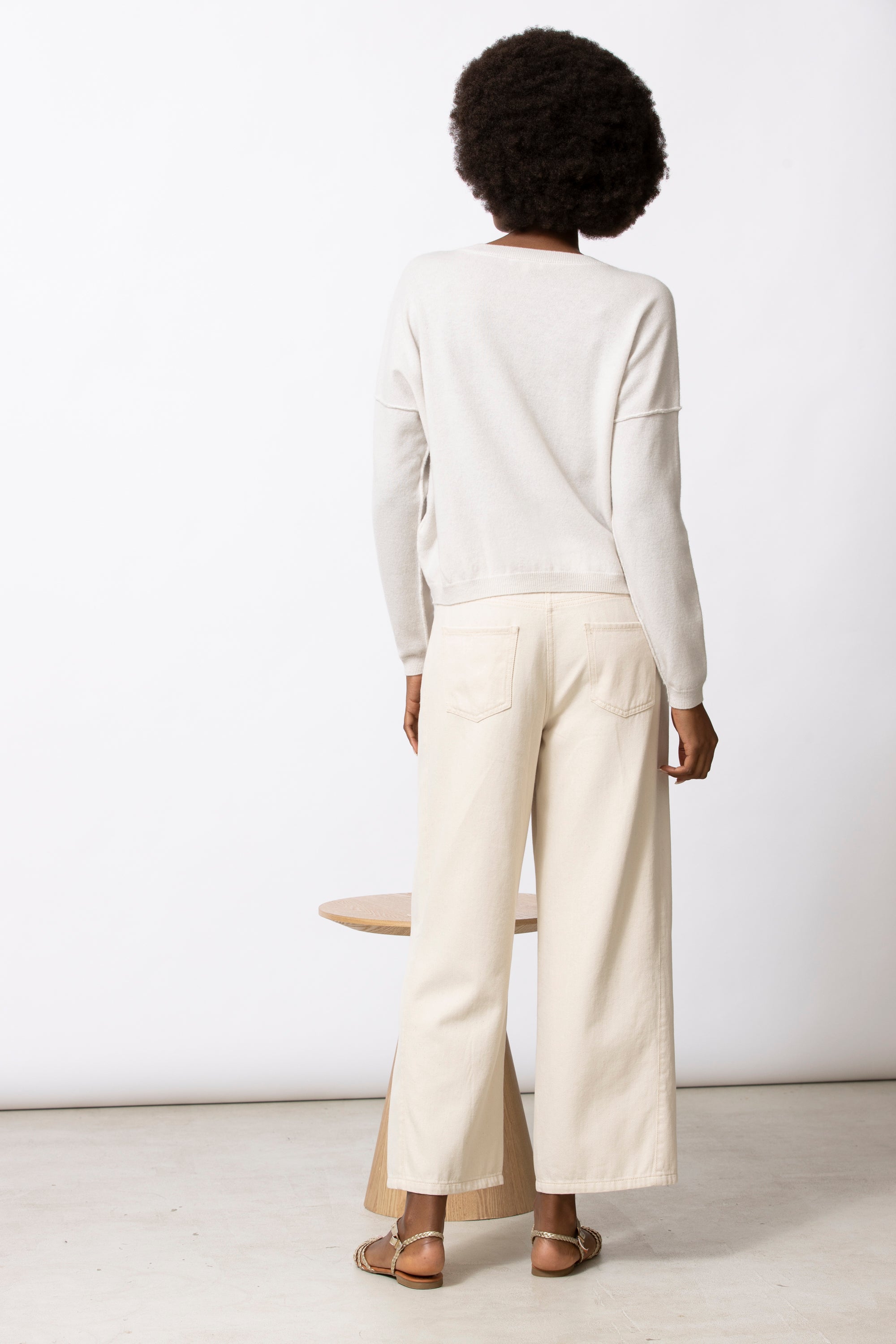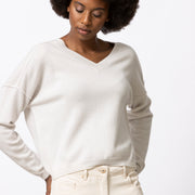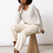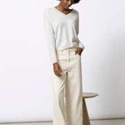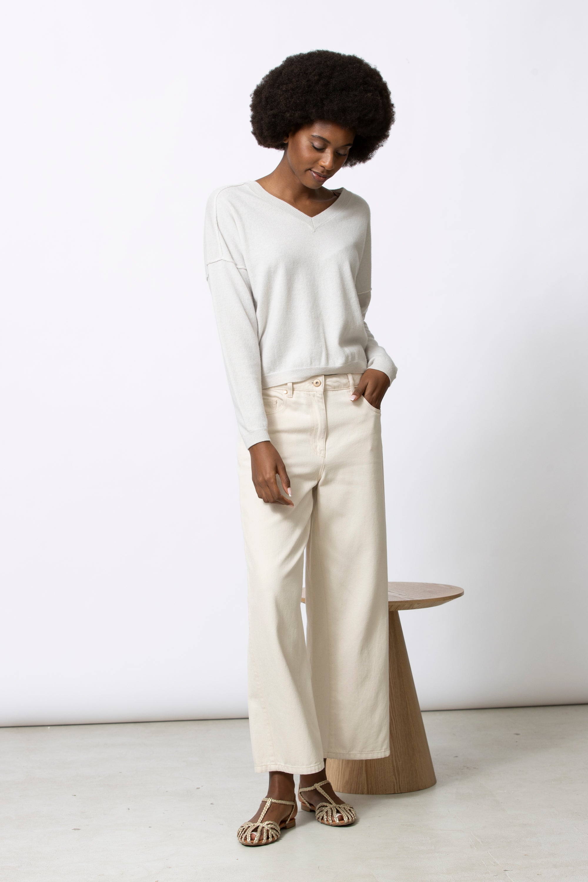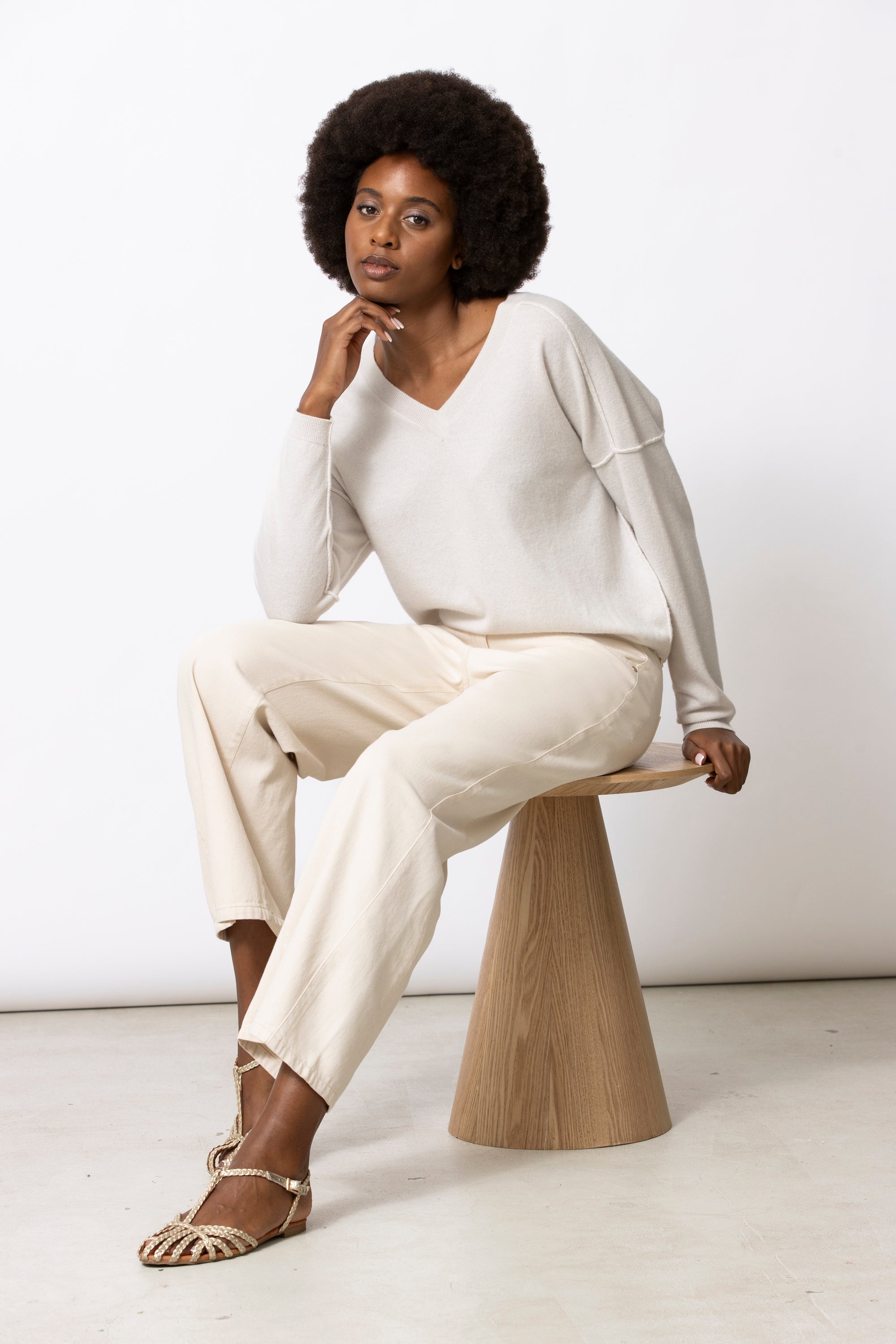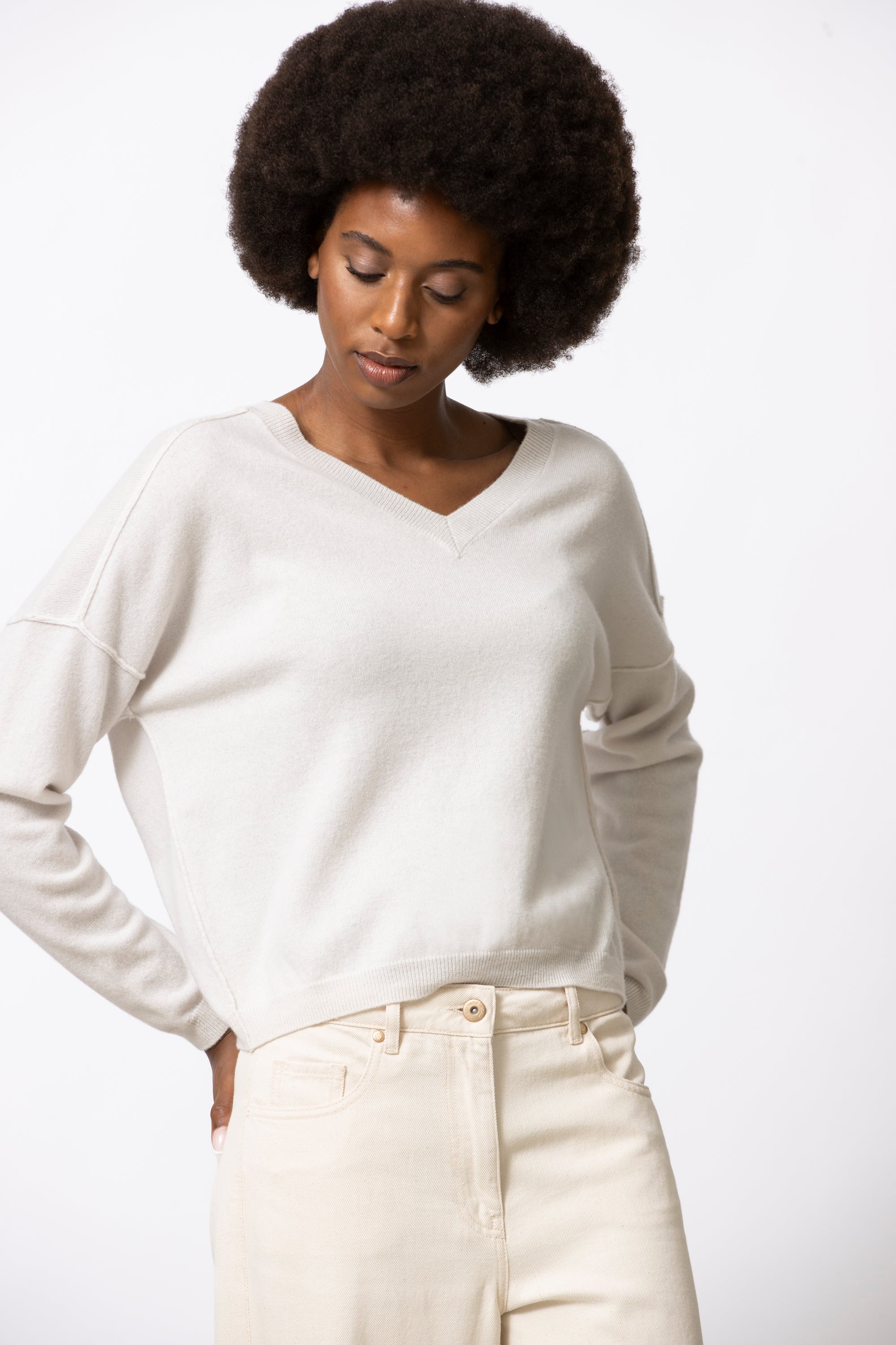 Zachtheid en volume komen samen in Lorca, een elegante trui in een luxueuze cashmere blend. Het rechte, iets ruimere silhouet en de vrouwelijke V-hals geven dit model een verfijnde maar moeiteloze uitstraling. De trui valt soepel op het lichaam en voelt uitzonderlijk zacht aan ideaal om los te dragen of licht ingestopt. Een tijdloze knit die perfect aansluit bij zowel denim als geklede broeken.