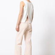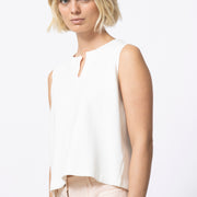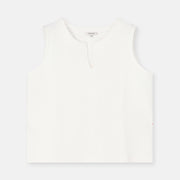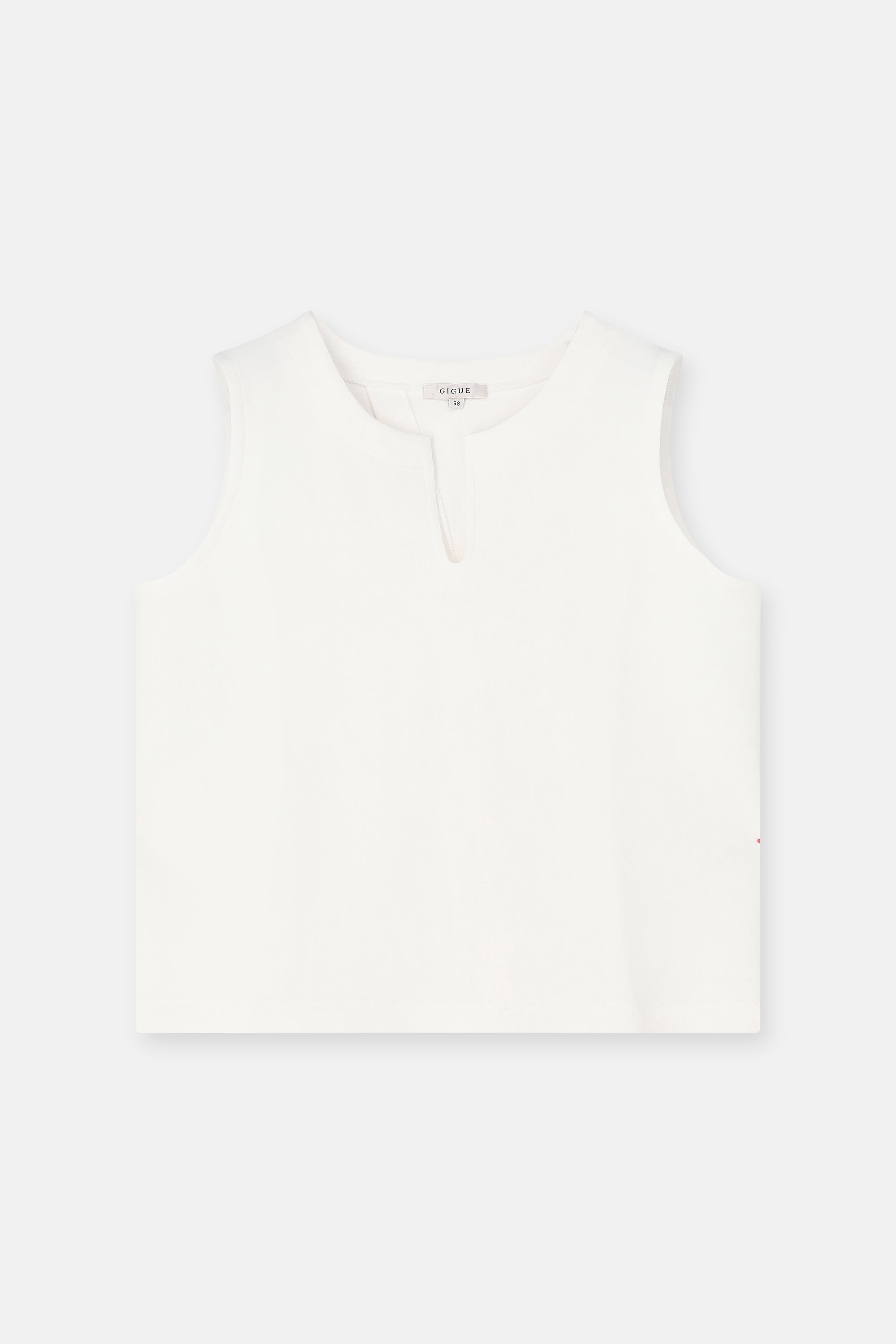 Minimalistische singlet in stevige sweaterstof met een subtiel architecturaal accent. Clean aan de voorkant, verrassend in de rug.