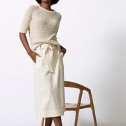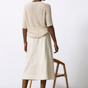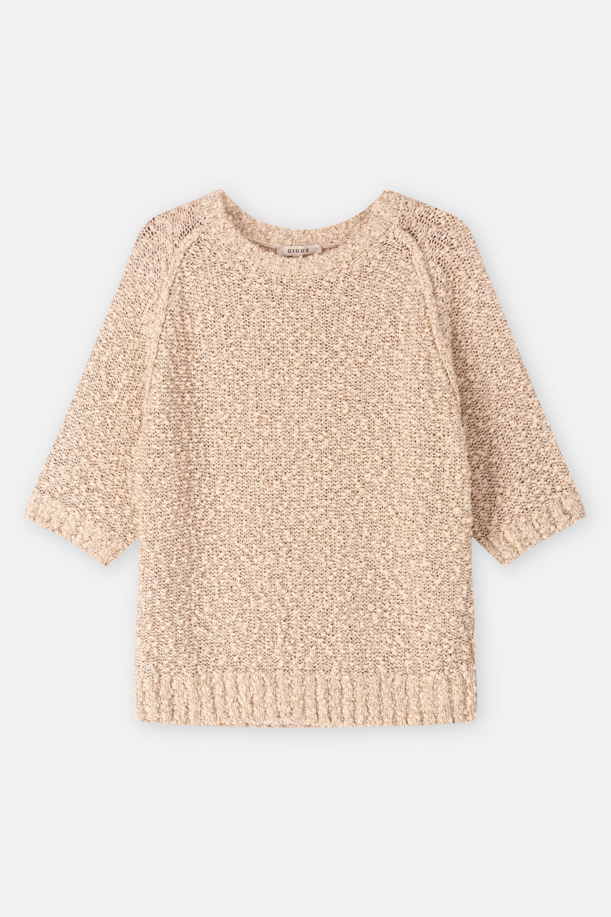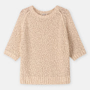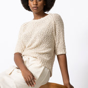 Eenvoudige trui met korte mouwen, uitgevoerd in bouclettedraad met subtiel ingeweven pailletten. De textuur en lichte glans geven dit stuk een verfijnde, pittige twist.