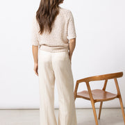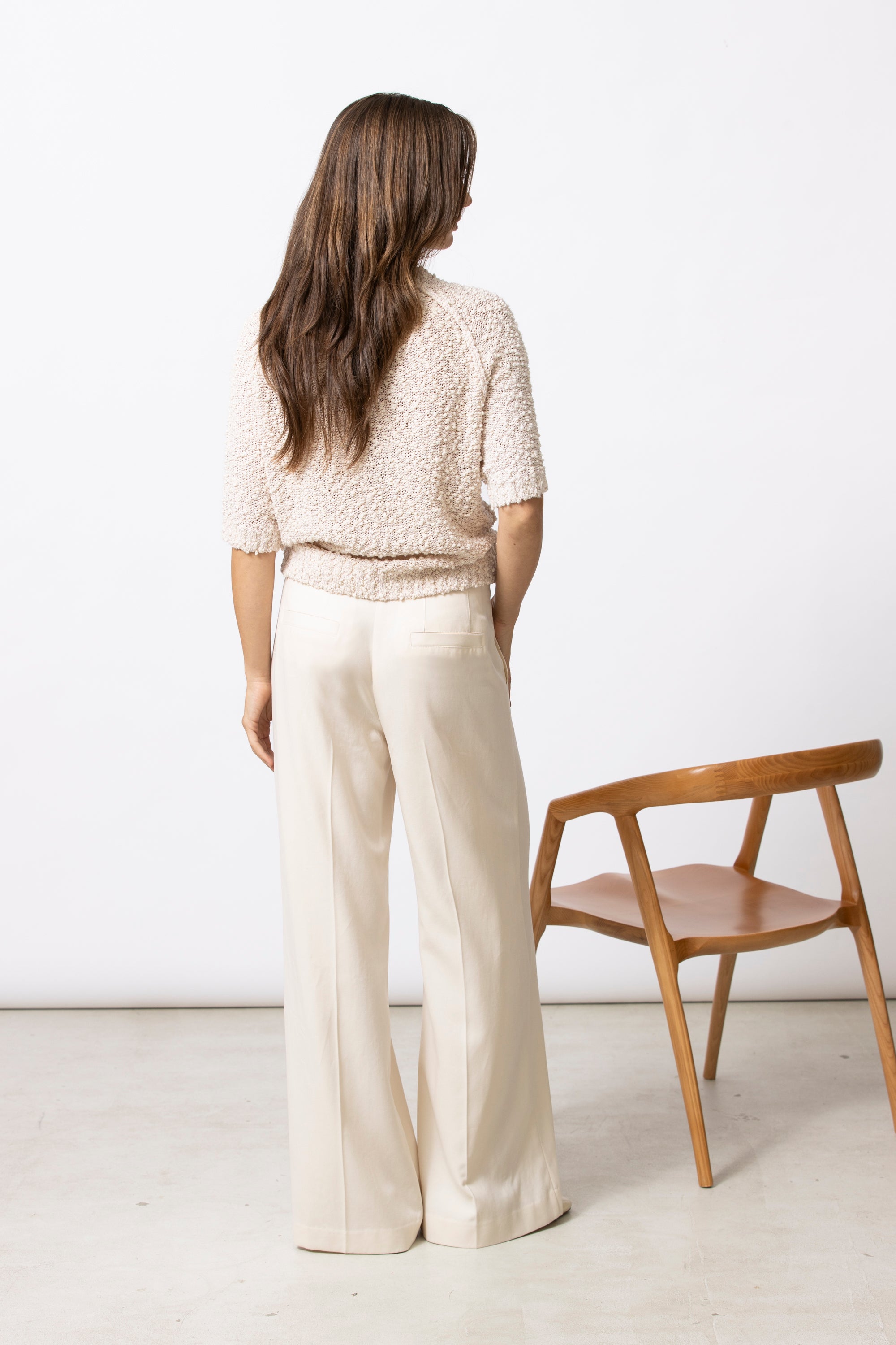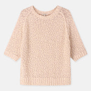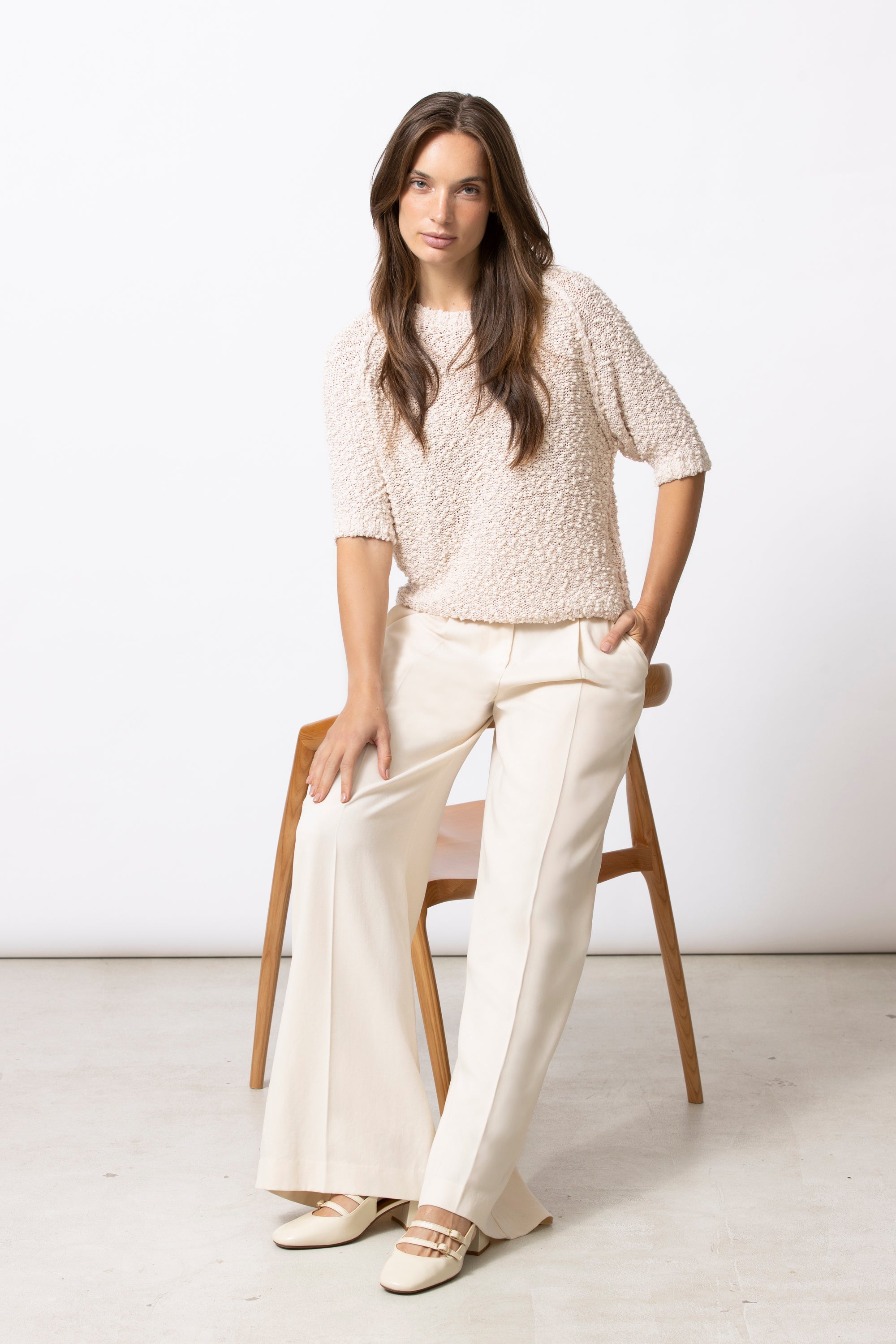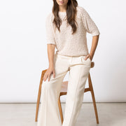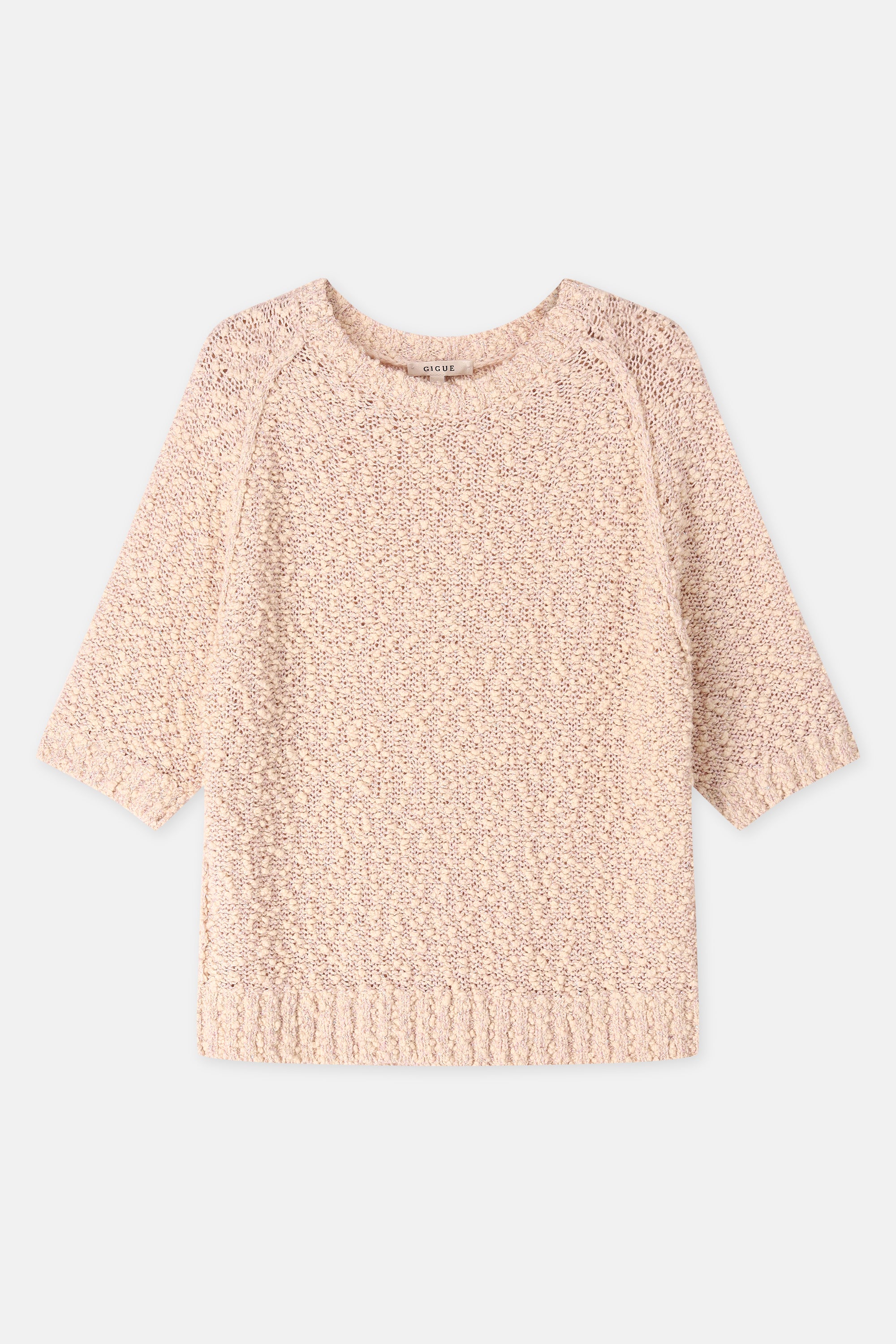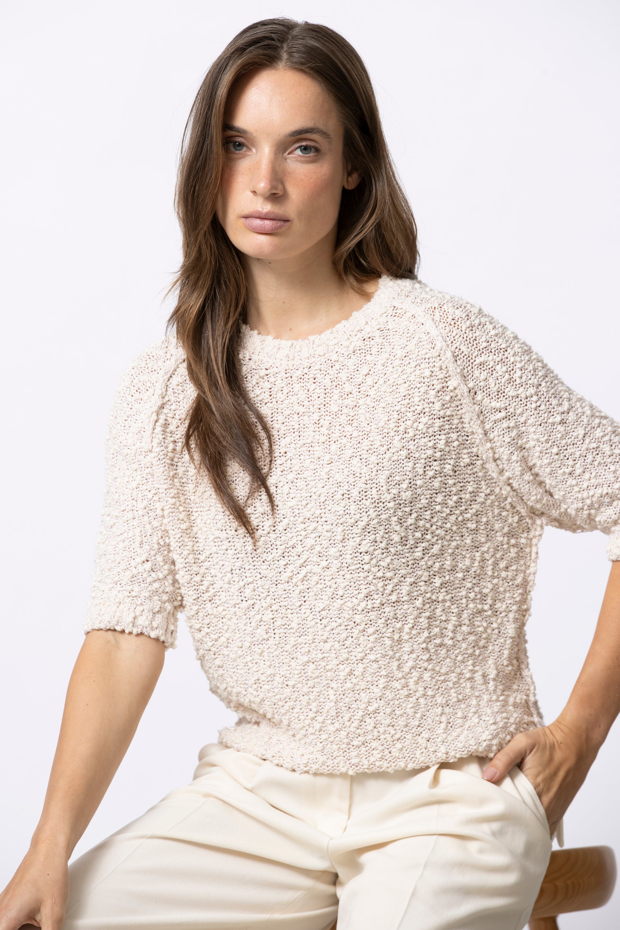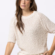 Eenvoudige trui met korte mouwen, uitgevoerd in bouclettedraad met subtiel ingeweven pailletten. De textuur en lichte glans geven dit stuk een verfijnde, pittige twist.