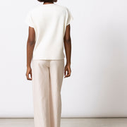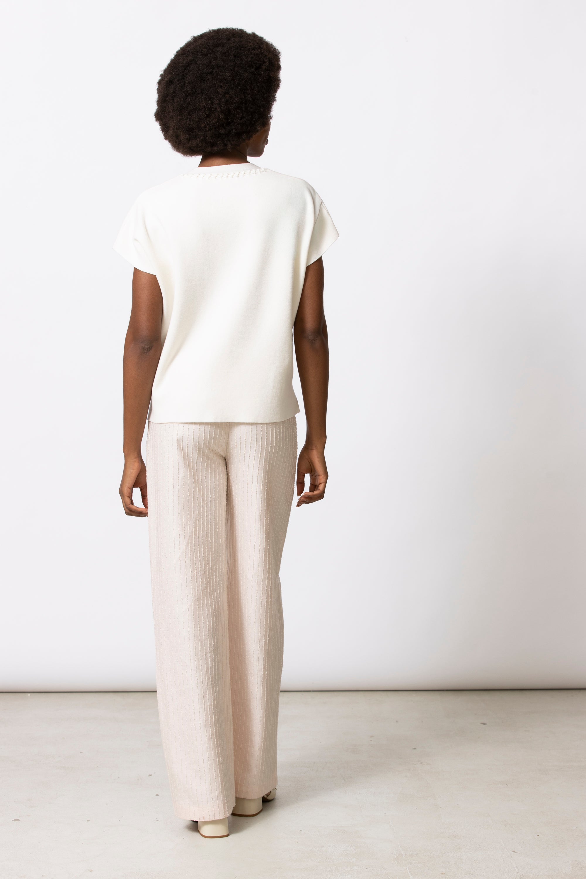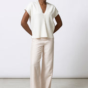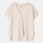 Zwaardere tuniektrui in soepele viscose-rib met boxy volume. Afgewerkt met een elegante, gebreide bies langs de V-hals voor een verfijnd accent.