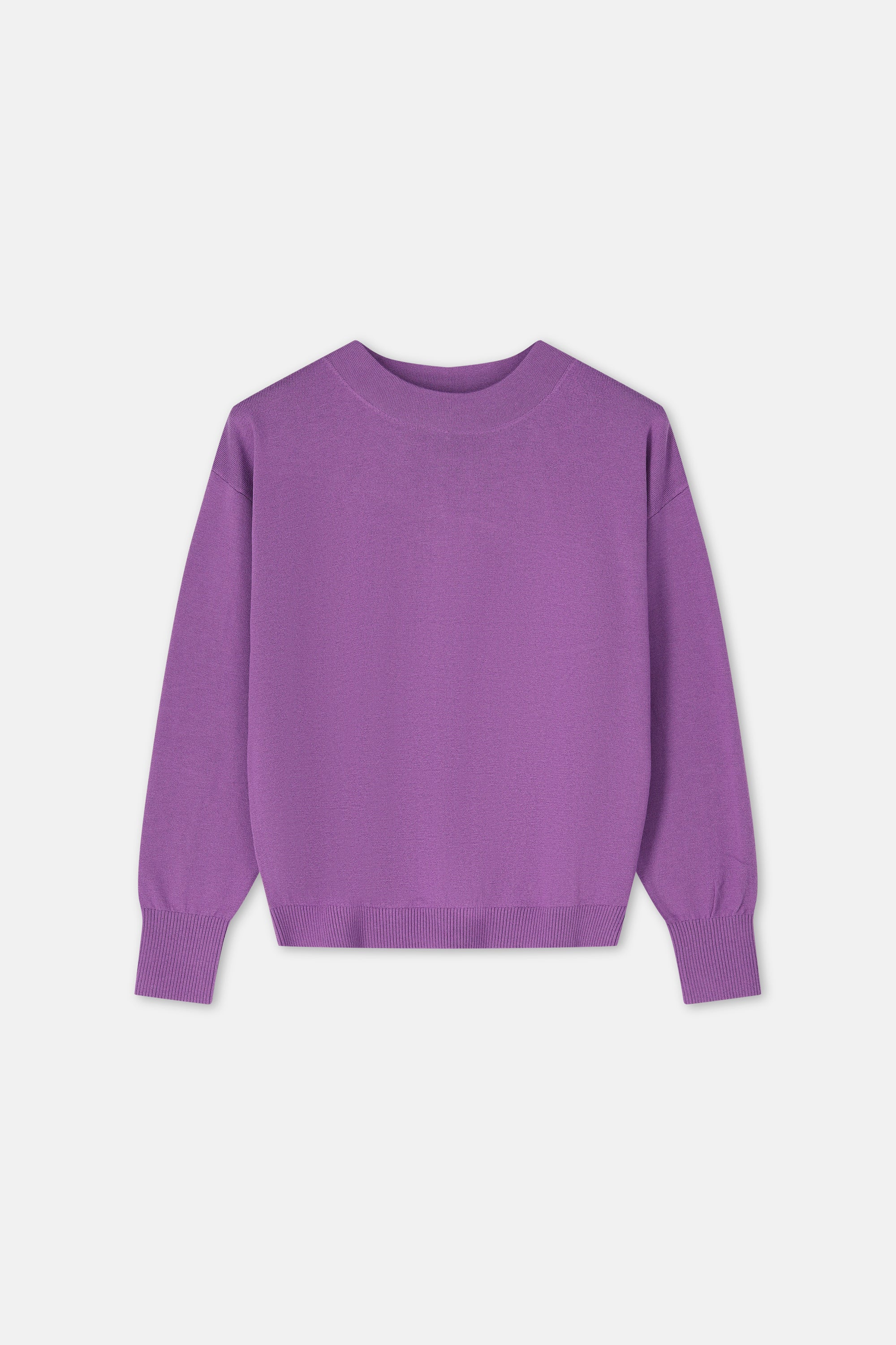 Paarse basic met mooie snit in top kwaliteit: breed, boxy, dun en vrouwelijk truitje met eenvoudige ronde hals vooraan, plooi achteraaan. Mooi, multifunctioneel.