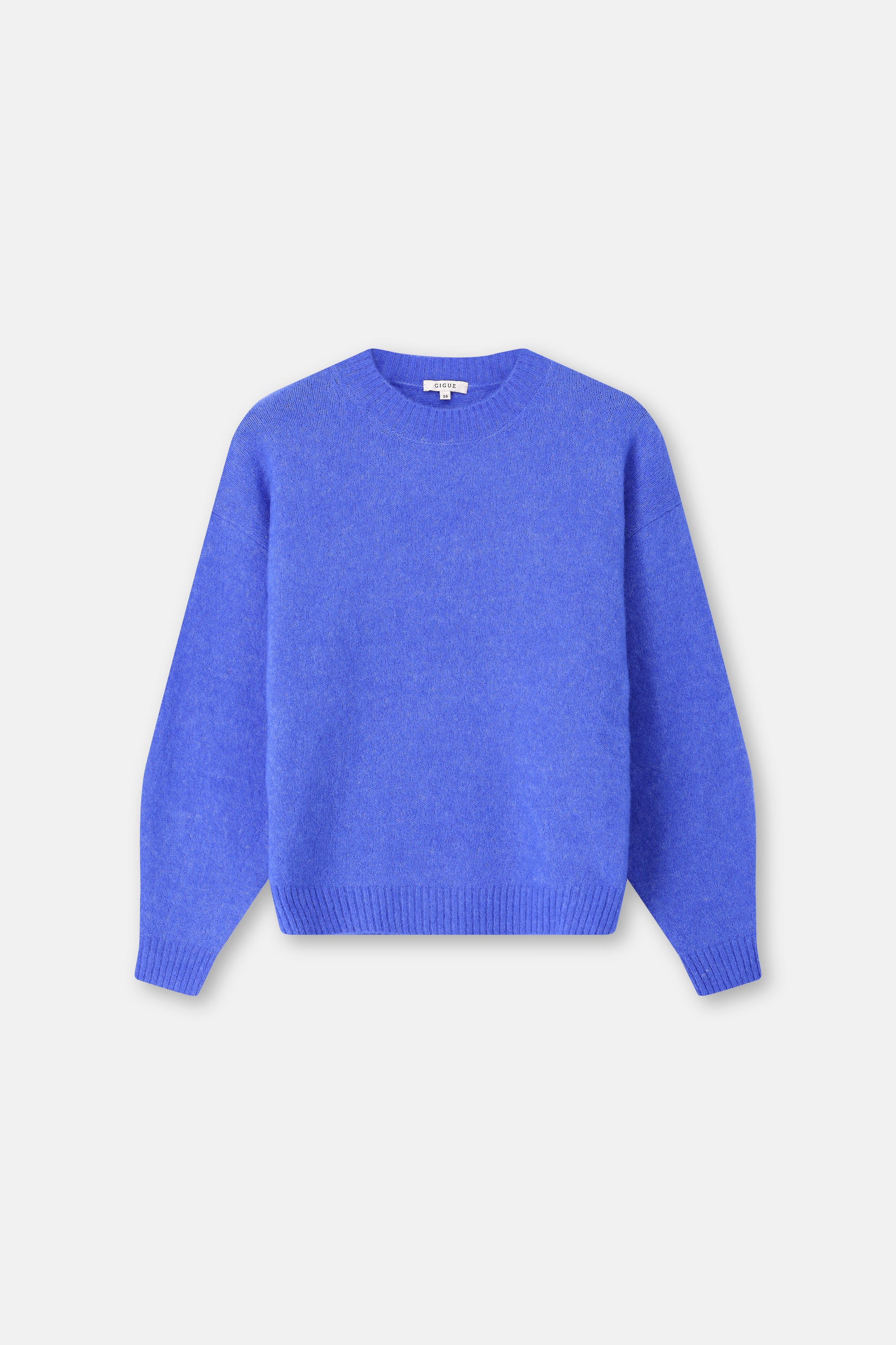 Oversized trui in diepblauw alpacamix – zacht, warm en perfect voor de koudere dagen. Met ronde hals en een losse, cosy pasvorm is dit een winter basic die je moeiteloos combineert.