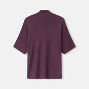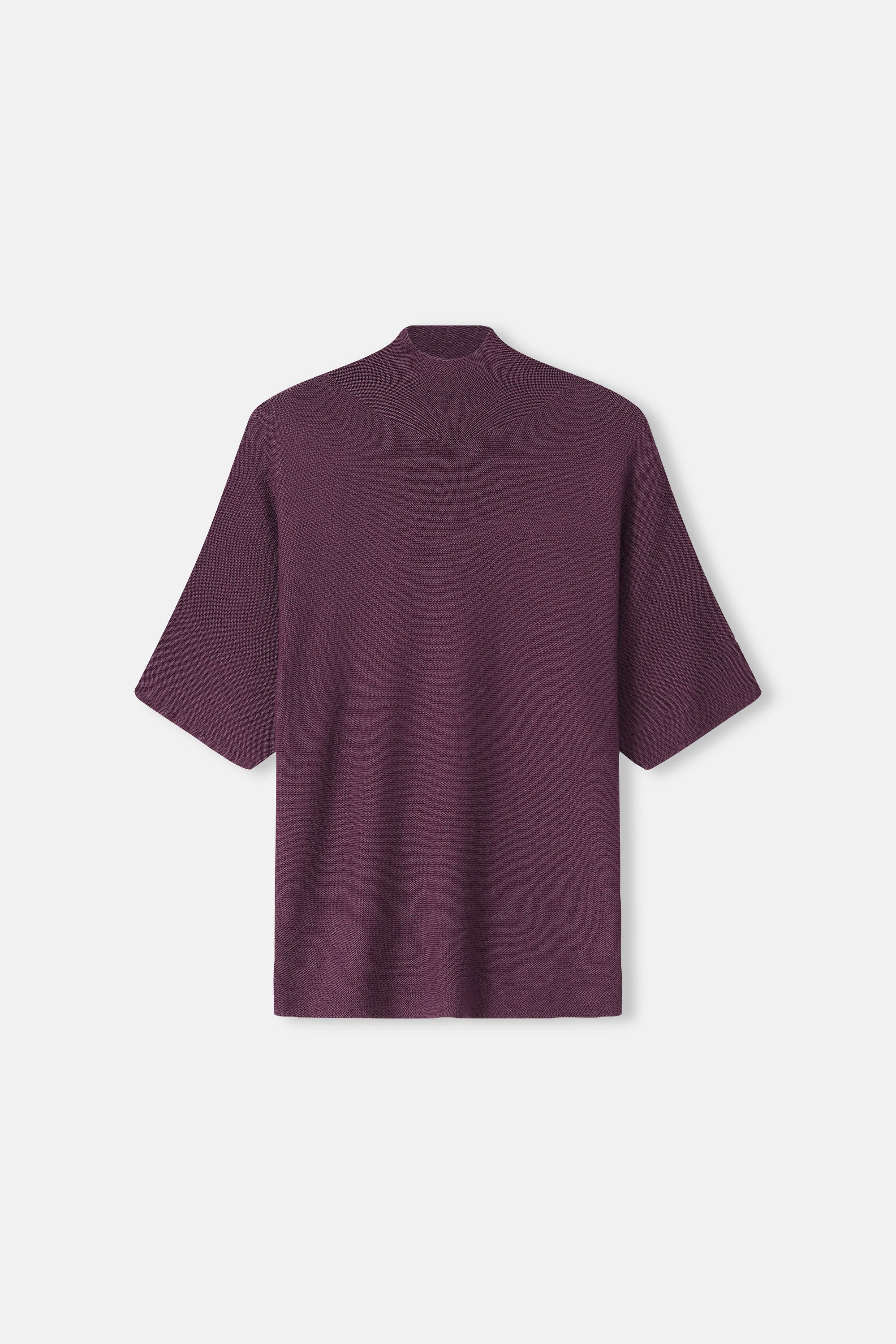 Bordeaux gebreid t-shirt in zacht merino met opstaande kraag. Makkelijk om onder een blazer te dragen, ook stijlvol zo.