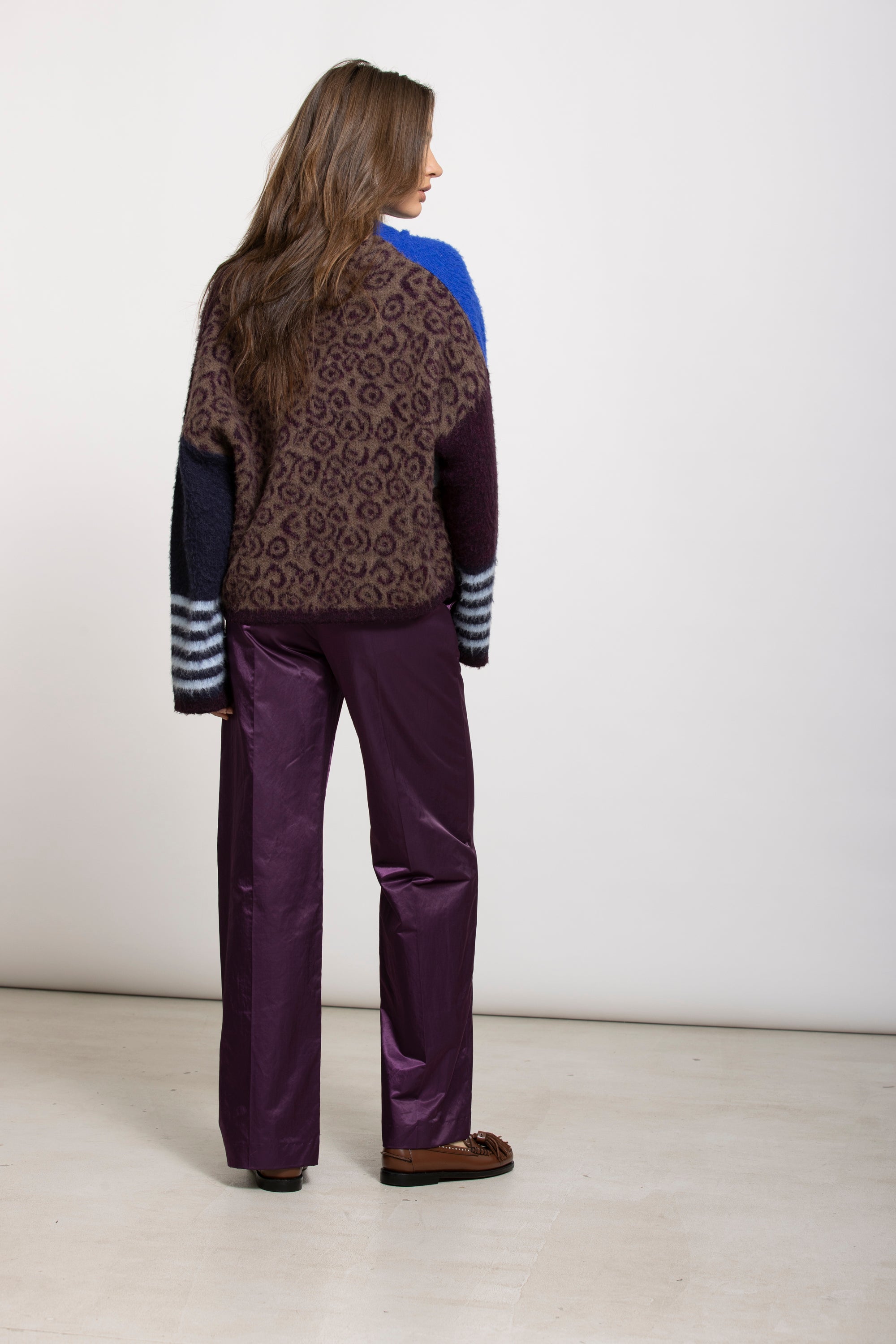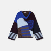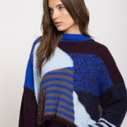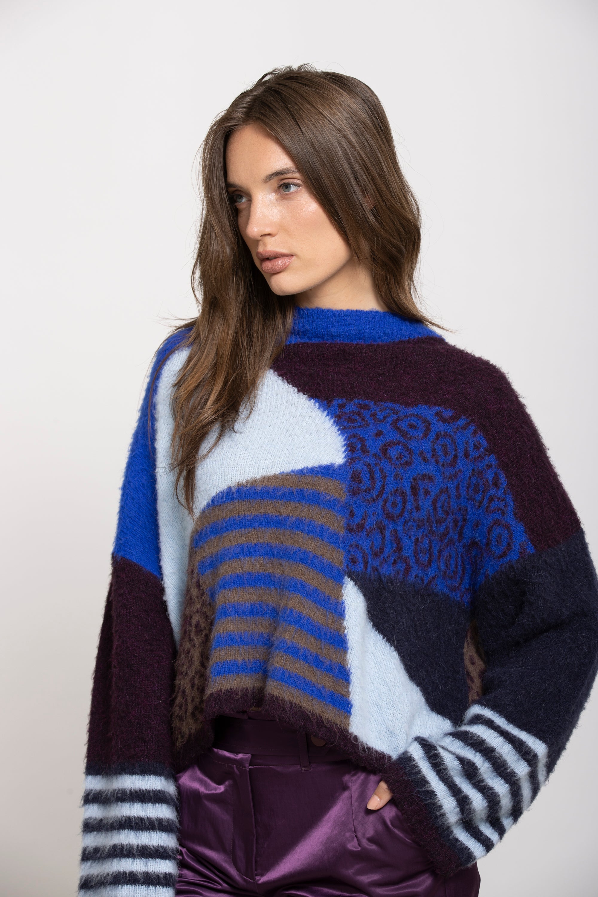 Warme trui in een patchwork van prints, gebreid in een zachte wolmix met alpaca. Een opvallend maar veelzijdig stuk dat moeiteloos combineert met elk item uit de collectie.