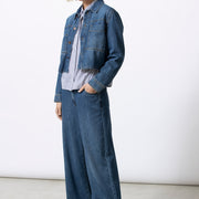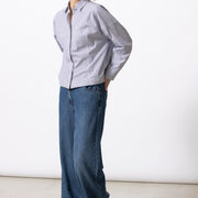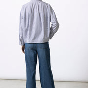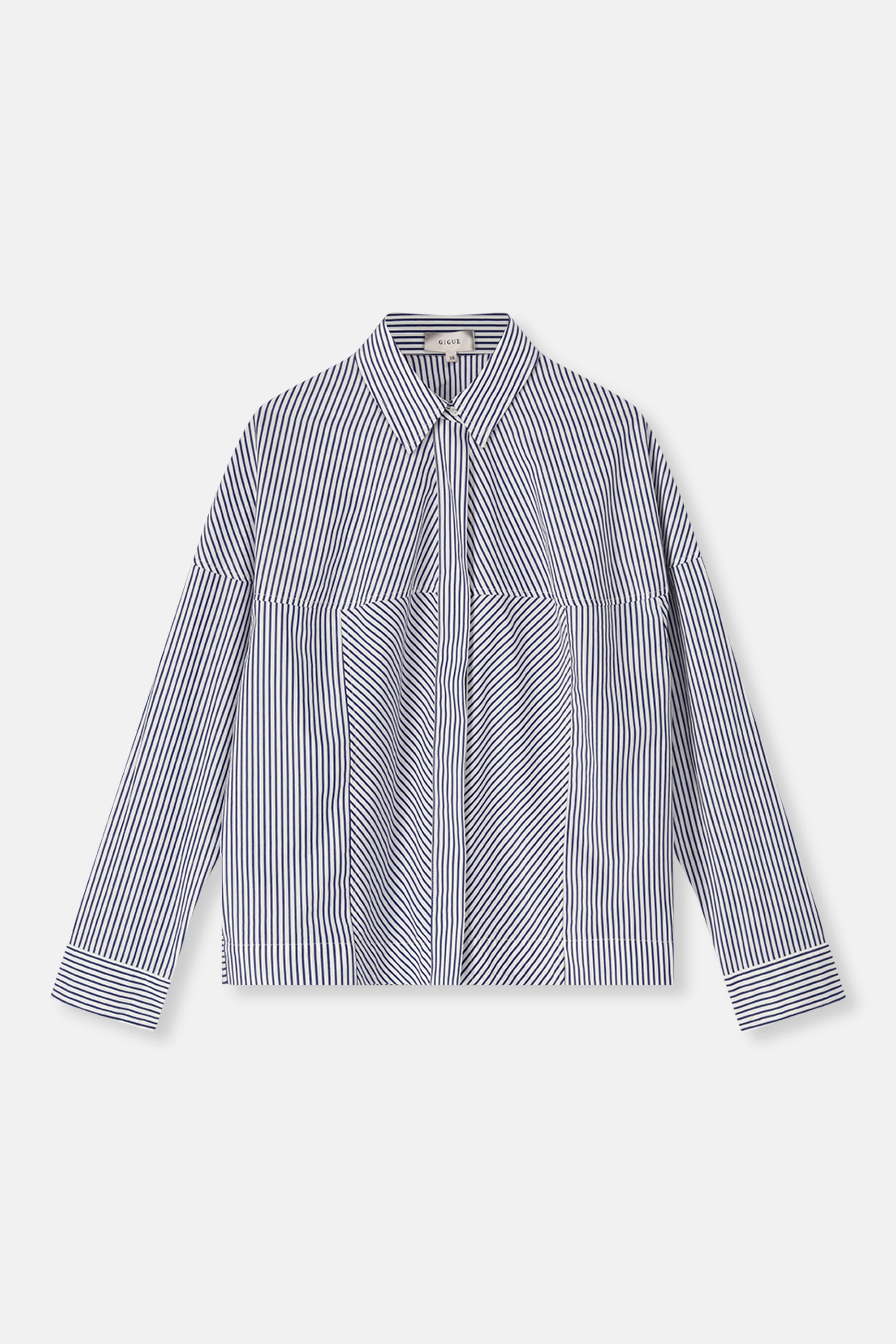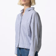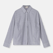 The Helmo is a navy cotton blouse featuring a subtle interplay of fine stripes that gently alternate. The lightly rounded silhouette offers comfort while maintaining a modern shape. A timeless stripe, reworked with a contemporary twist.