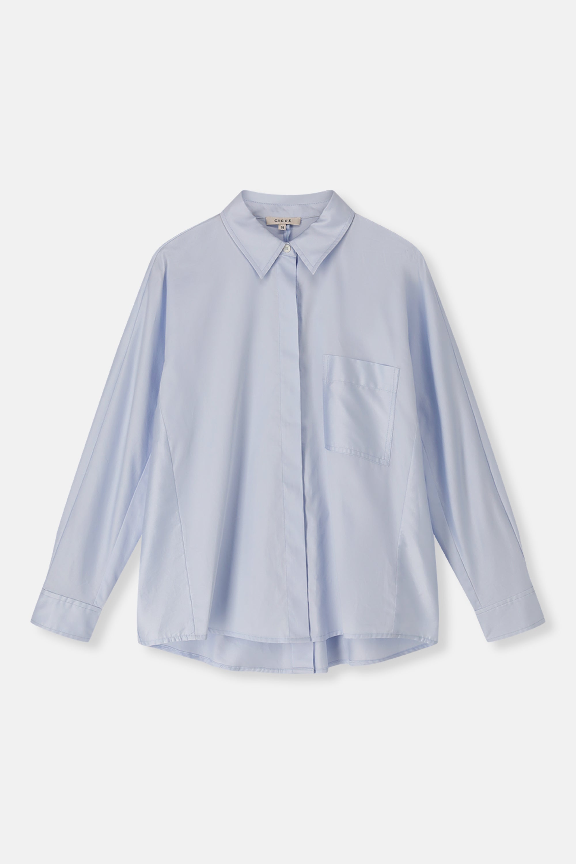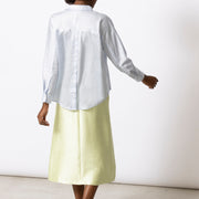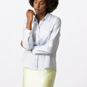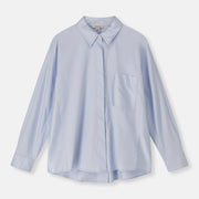 A light blue shirt with a loose, elongated fit and a soft, fluid drape. The front remains clean and classic, while the buttoned back adds volume and movement. Wear it loose, half-tucked or layered for an effortless summer look.