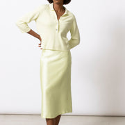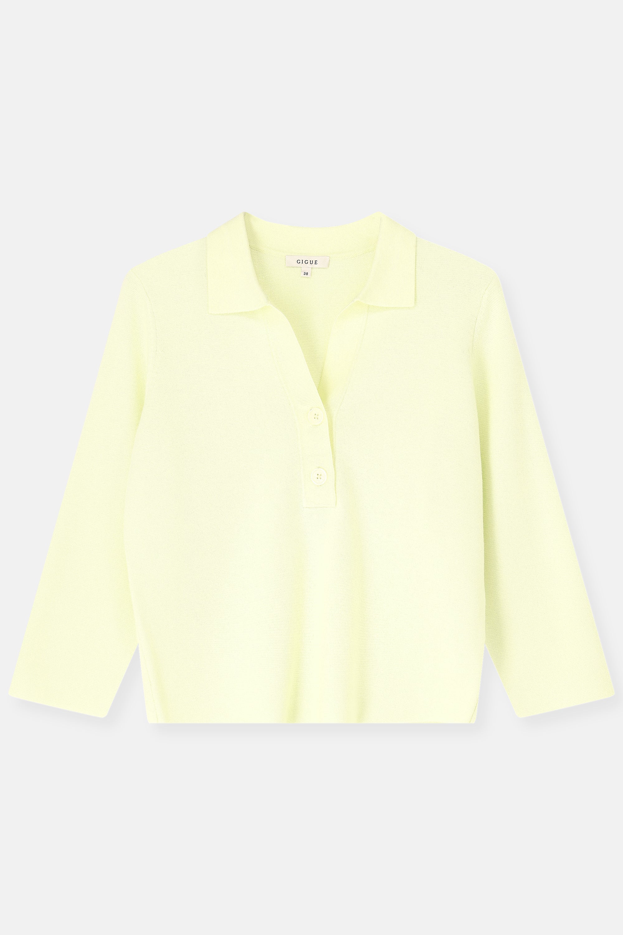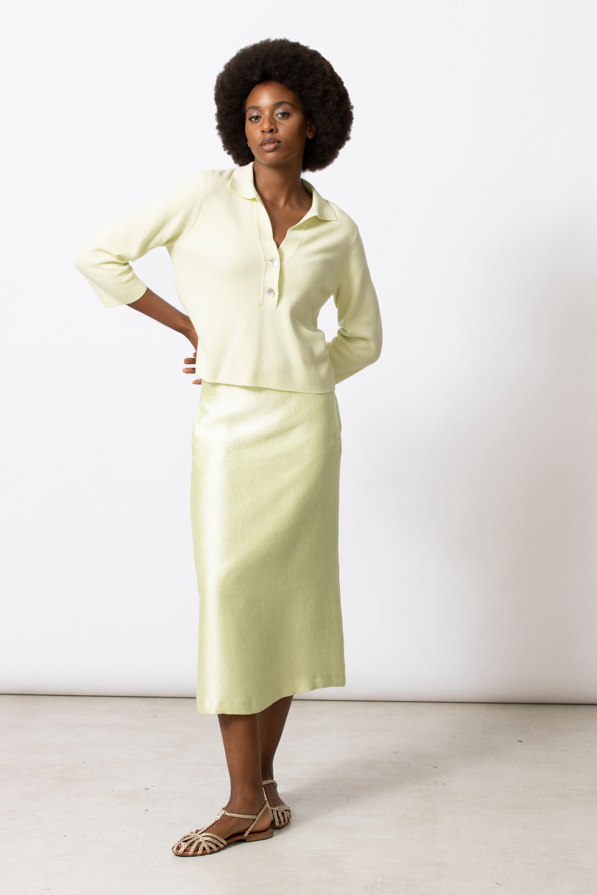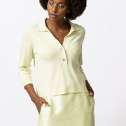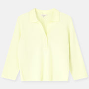 A boxy polo in a structured yet breathable knit, designed with a modern attitude. The V-neck and three-quarter sleeves keep the silhouette open and fresh, while the volume adds body without feeling heavy. Wear it loose over a skirt or trousers, or lightly tucked in for a graphic line.