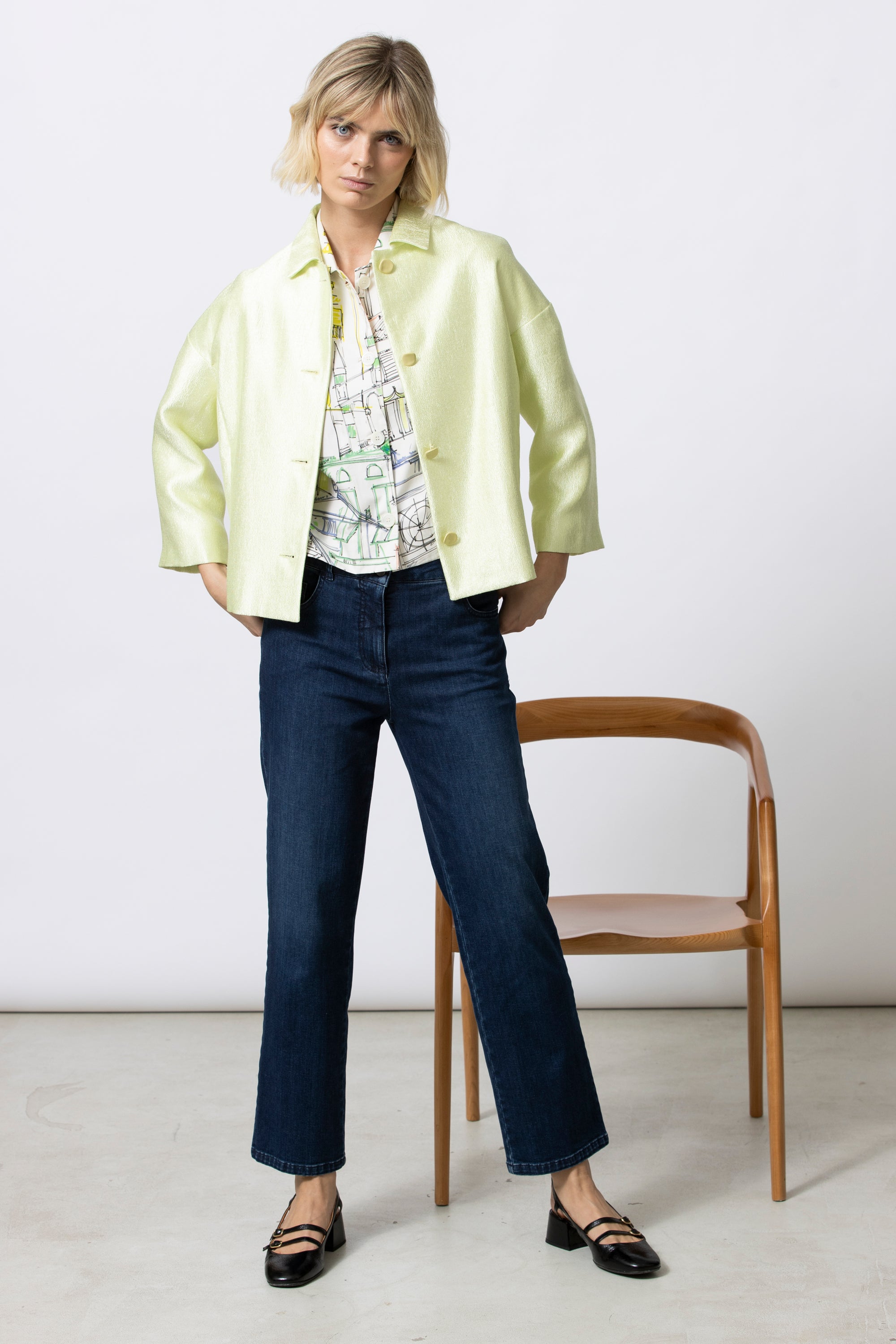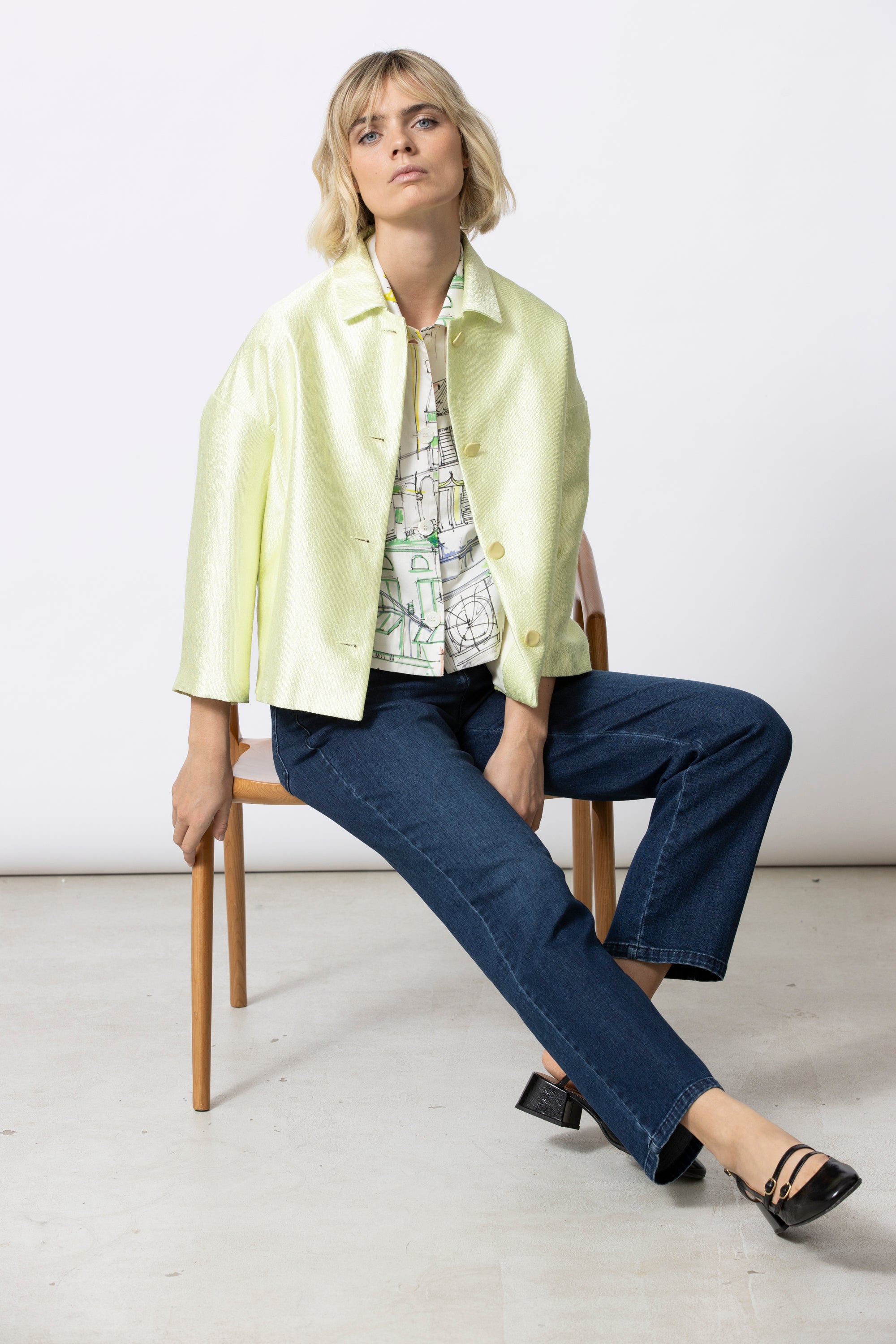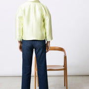 The same clean, straight-cut silhouette, translated into a bold fluo yellow tone. The compact shape and refined buttons keep the look sharp and balanced, while the colour adds a confident, contemporary edge. A statement piece that remains elegant and controlled.