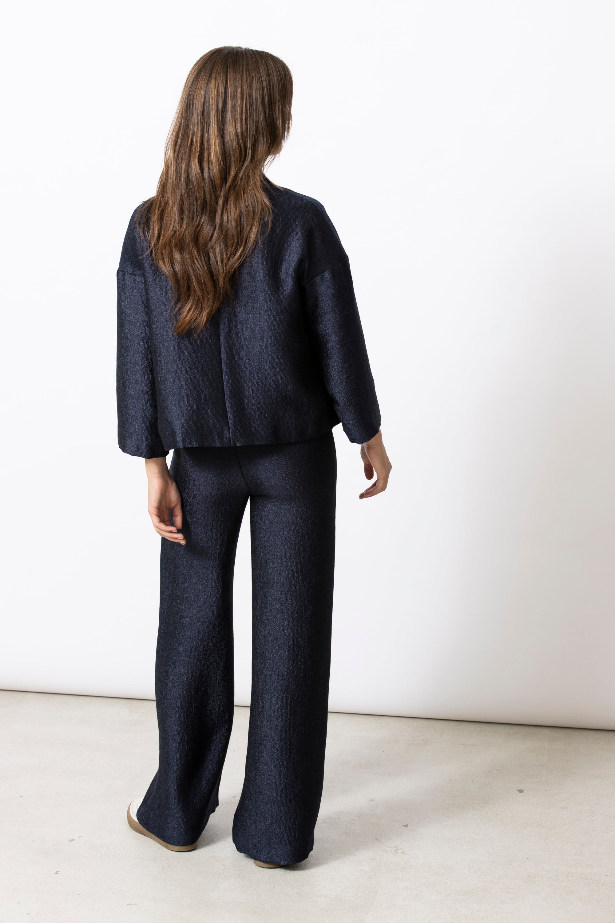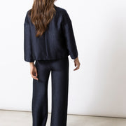A straight-cut jacket defined by clean lines and a subtle sheen. The compact silhouette and refined buttons give the Wen a calm, confident presence. Strong on its own, and perfectly suited to pair with the matching trousers for a modern, polished look.