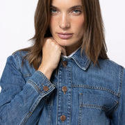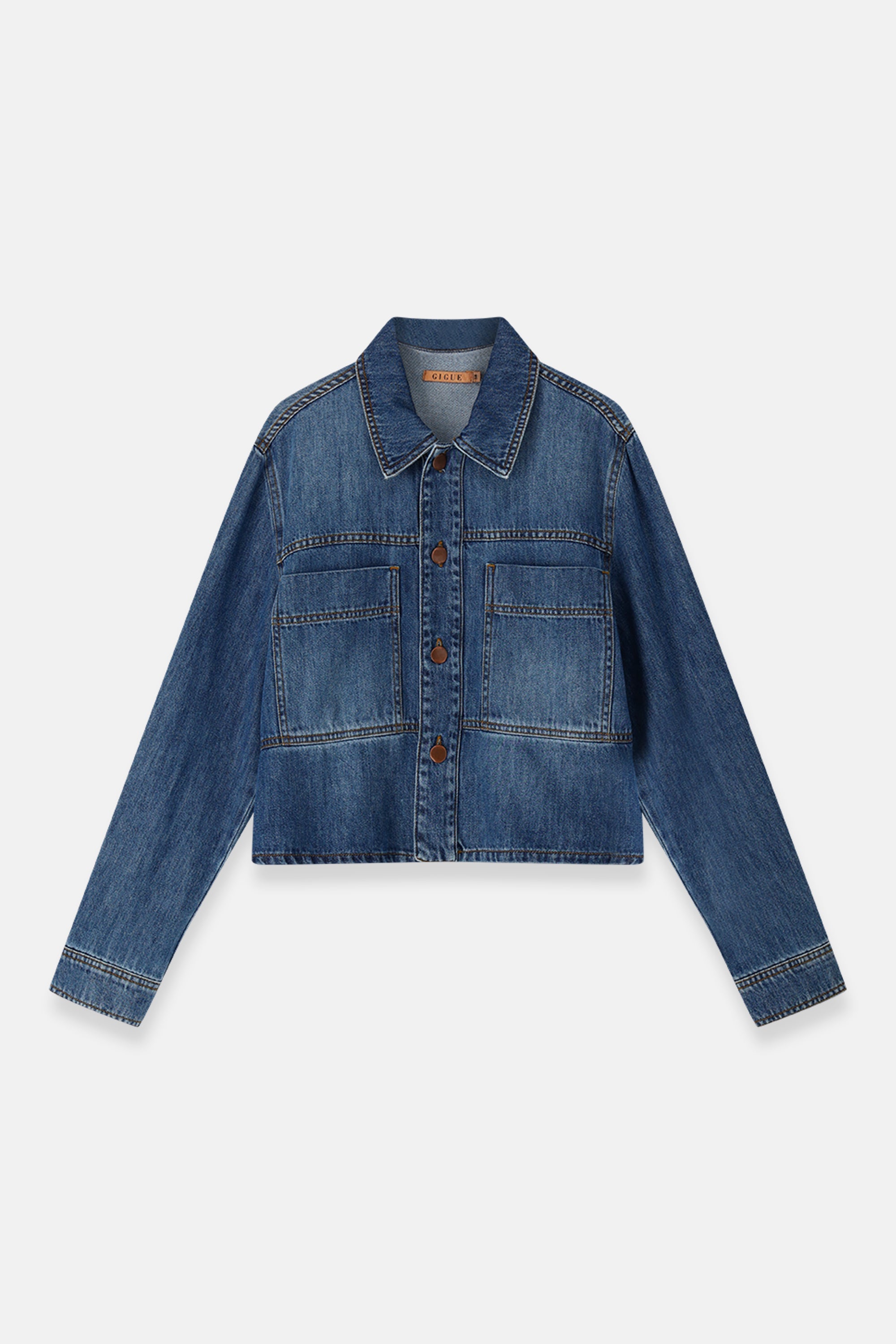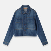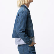 A modern jacket in deep dark denim. The Wuton combines a straight, lightly boxy fit with pronounced details. Large patch pockets, contrasting stitching and copper buttons give the piece a utilitarian edge, refined by the richness of the denim tone.