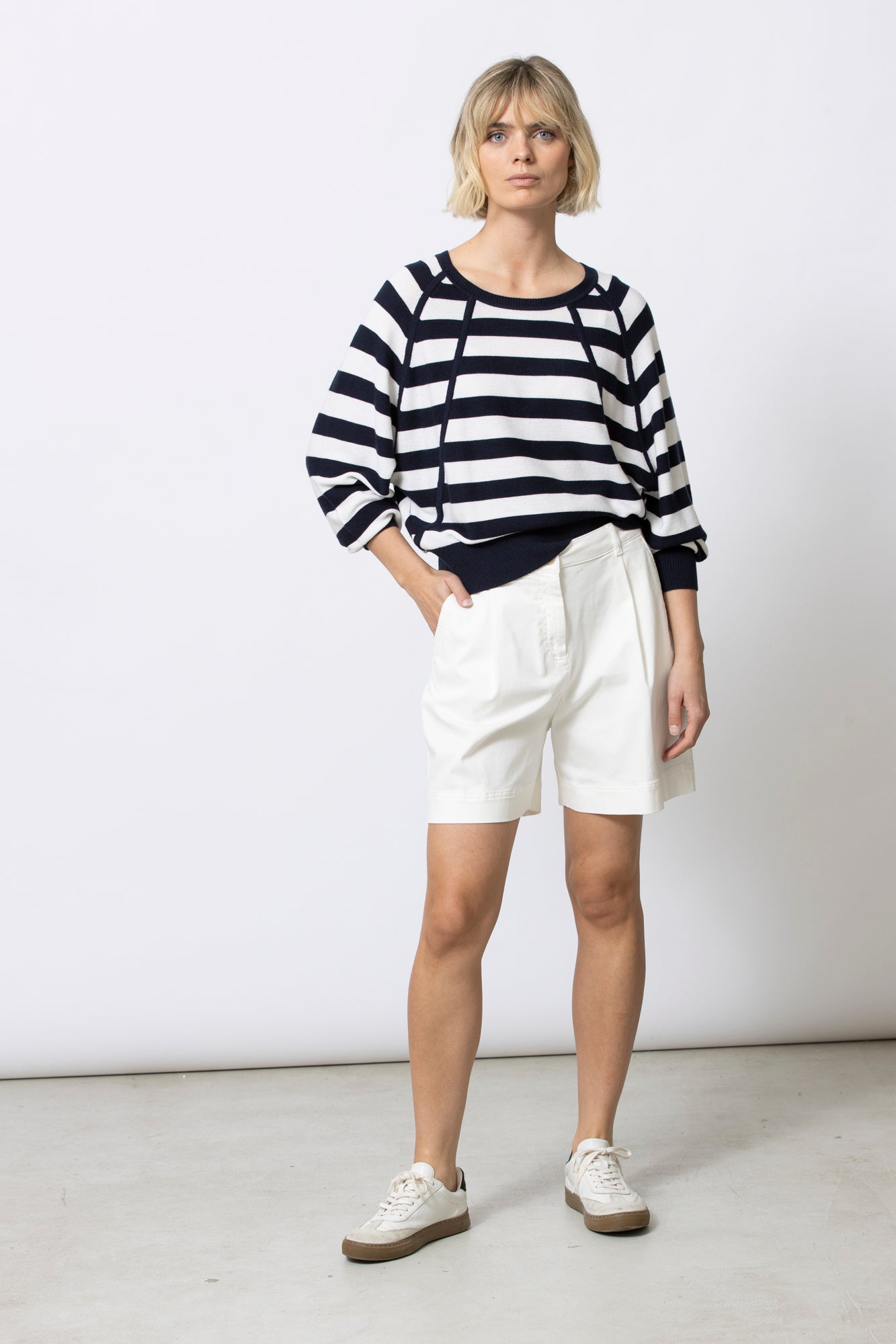 Shorts with a slightly longer length and a clean, elegant cut. The straight shape and soft pleats create a refined look, while the side pockets keep it comfortable for everyday wear. A timeless summer staple with that little something extra.