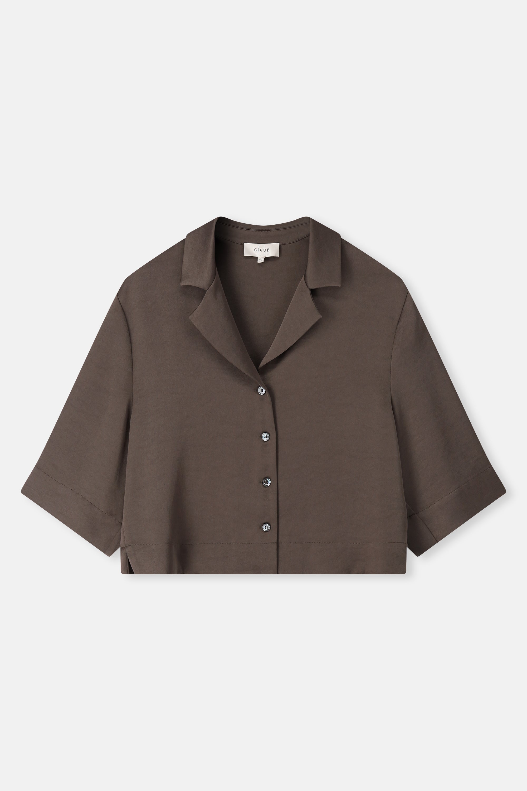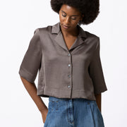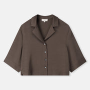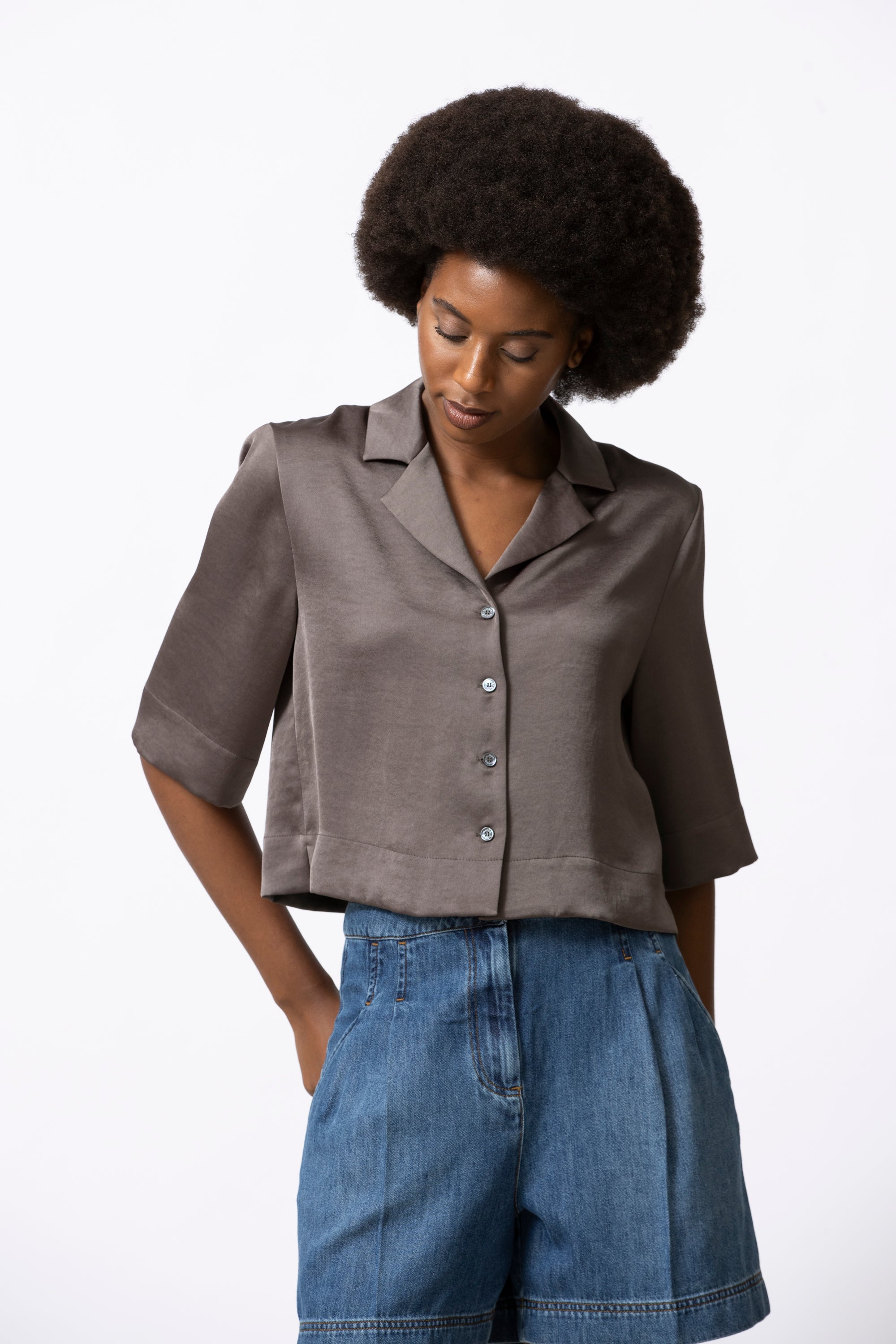 Une blouse courte et large, dotée d’un col revers et de manches courtes, réalisée en satin brillant. Le coloris brun apporte chaleur et profondeur à la coupe épurée, pour une allure élégante et parfaitement équilibrée.
