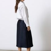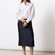 Les matières riches appellent des lignes épurées. La jupe Trofee présente une coupe droite midi au dessin net et à l’allure sereine. Le coloris navy accentue son caractère intemporel et la rend facile à porter du jour au soir.