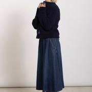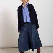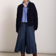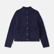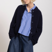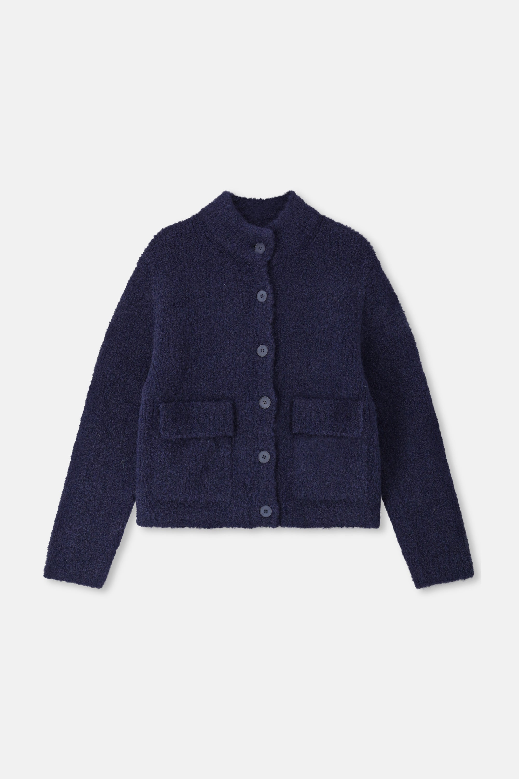 Warm, zacht en stijlvol: deze cardigan in navy alpacabouclette is ideaal voor koude dagen of als alternatief voor een jas. Met opstaande kraag, zakken en een volle, cosy structuur. Een buitenstuk om te koesteren. Het model is 1m79 en draagt maat 36.
