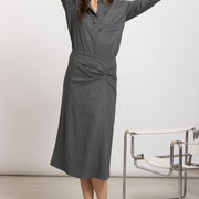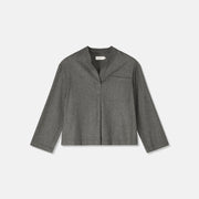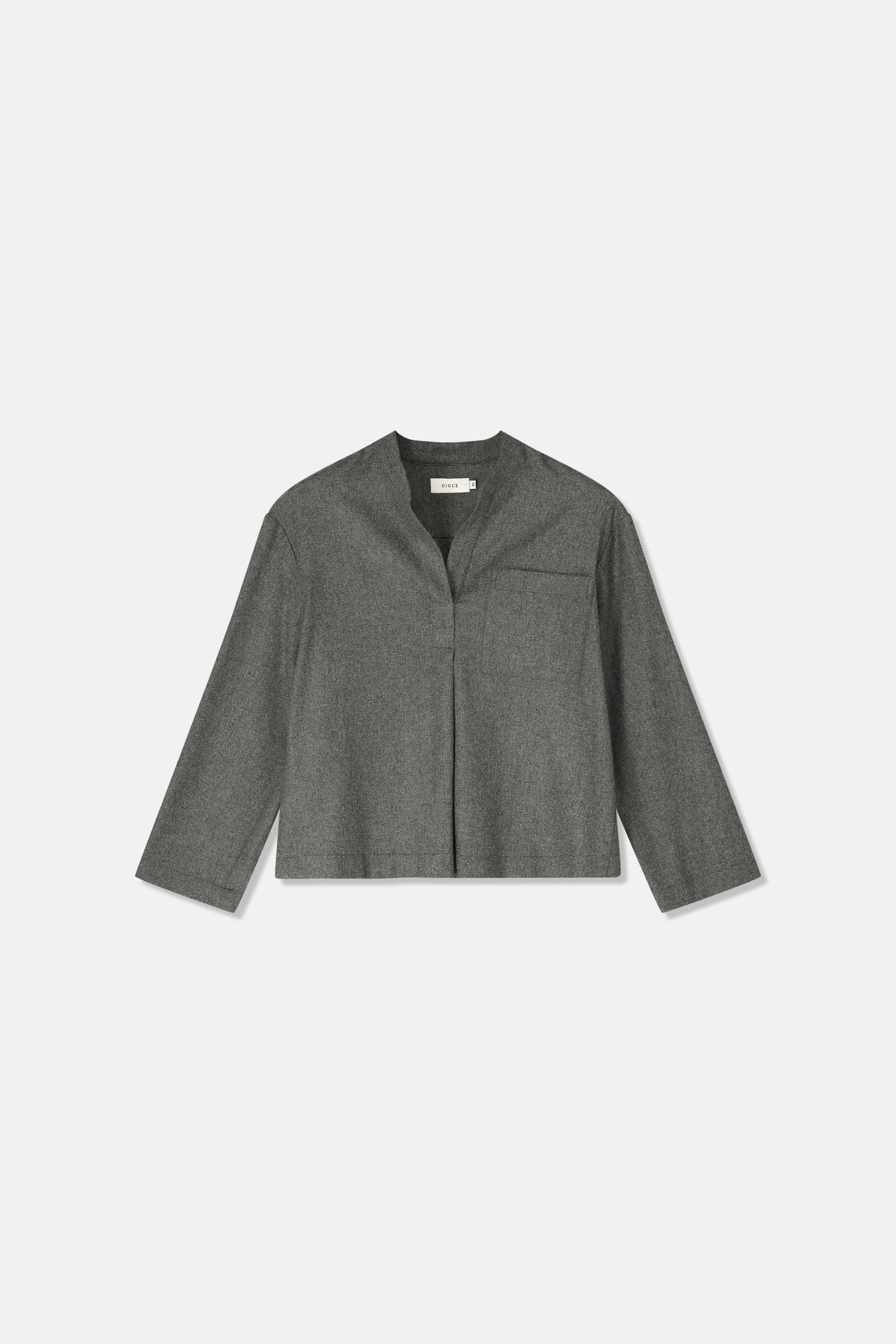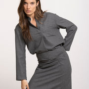 Top in zachte wol met opstaande kraag. Lichte, vrouwelijke top in soepele wol met een open V-hals en opstaande kraag. De plooi vooraan en het borstzakje zorgen voor subtiele details binnen een sober silhouet. Tijdloos en elegant, perfect met de ROCHE broek of rok. Het model is 1m79 en draagt maat 36.