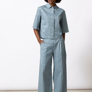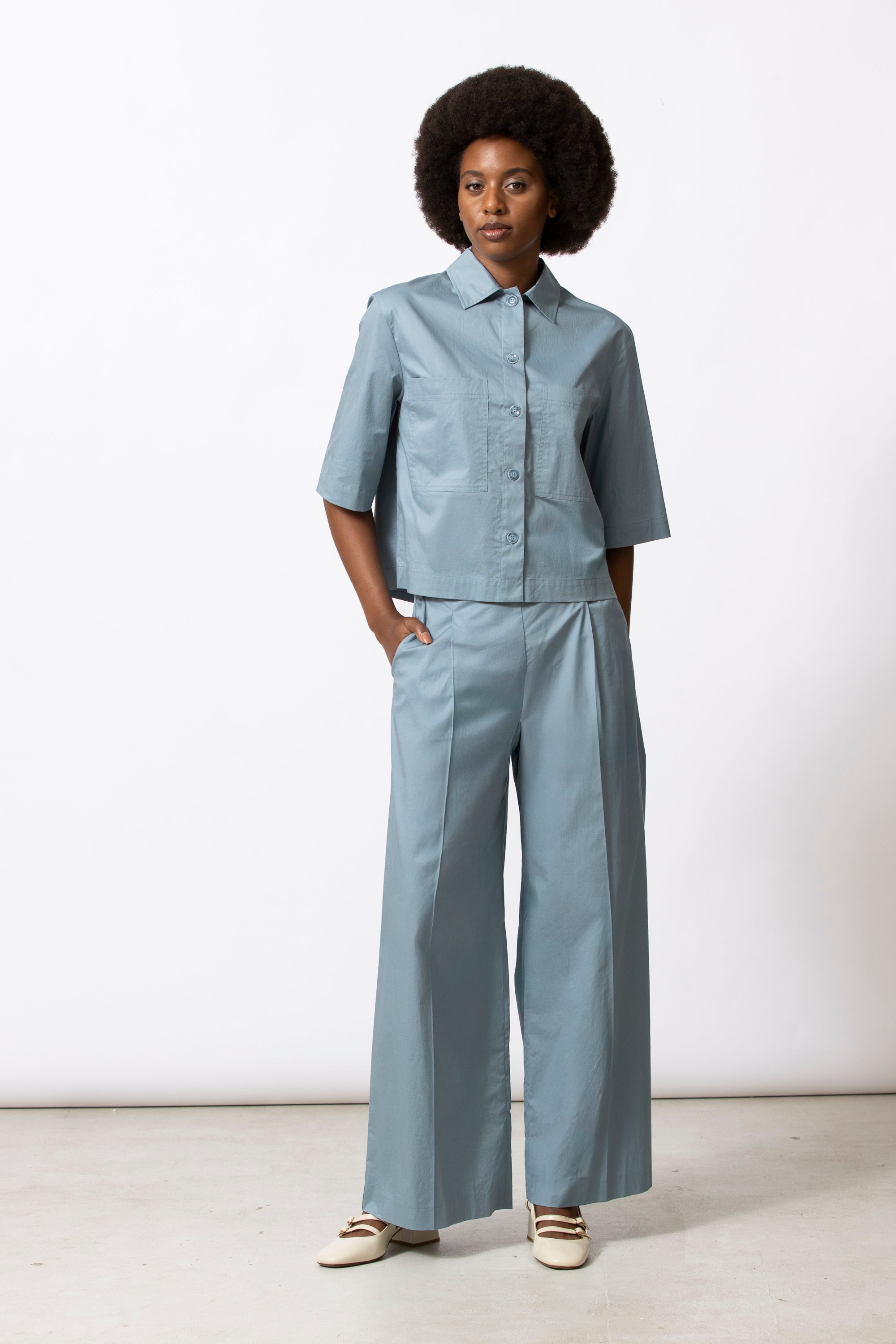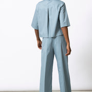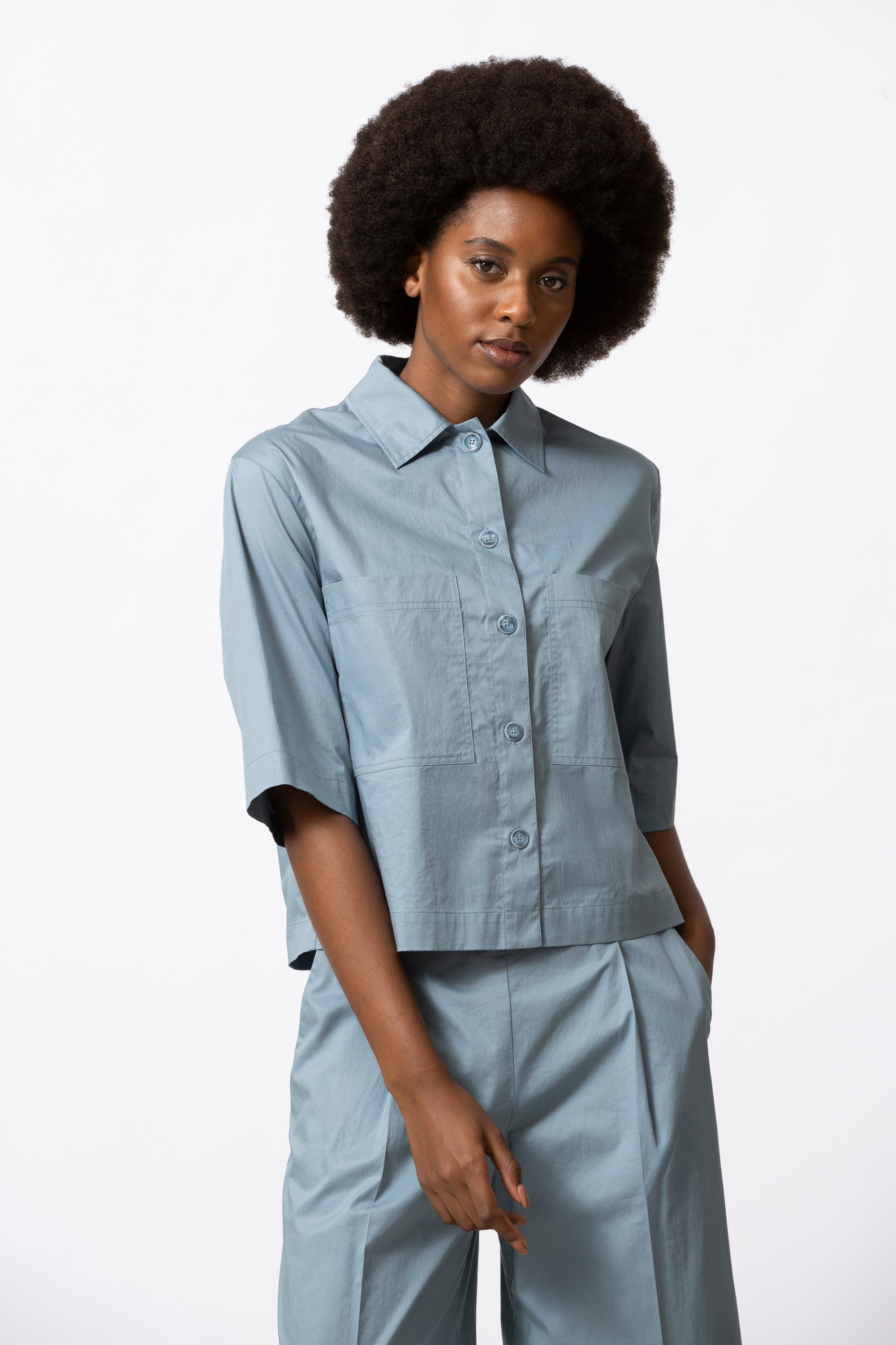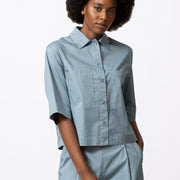 Boxy volume voor dit neutrale hemd/vestje in krakend katoen. Minimalistisch en grafisch, met een moderne proportie. Mooi in total look met bijpassende broek of rok, maar even sterk op zichzelf.