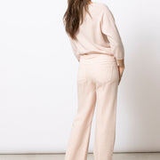 De Layla is een zachte, verfijnde nude knit met tijdloze lila-ecru strepen. Het mooie volume, de open hals en de subtiele stikking vooraan geven deze trui een ontspannen maar verzorgde uitstraling. Dankzij de wol met cashmere voelt ze uitzonderlijk zacht aan en draagt ze licht en comfortabel.
