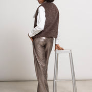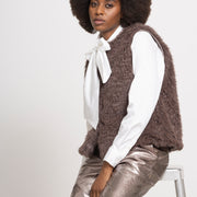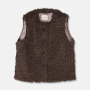 Mouwloos jasje in zachte fake fur, afgewerkt met lederlook details. Draagbaar als stijlvol laagje bij de eerste frisse dagen en makkelijk te combineren met zowel jurken als broeken. Comfort, warmte en een vleugje luxe in één.